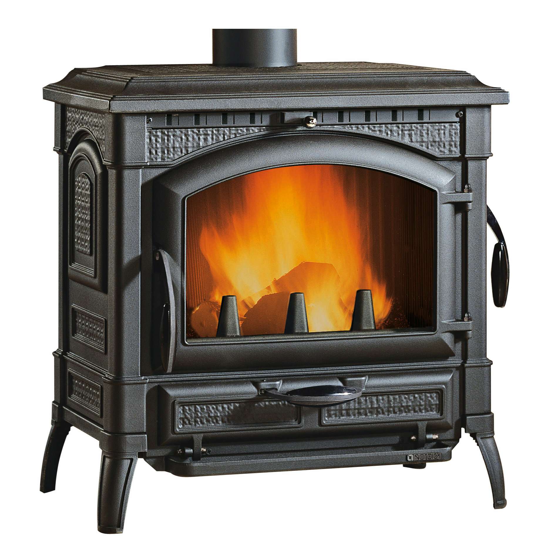 Wood burning stove with structure completely in enameled cast iron. Front and side loading door. Ceramic glass.