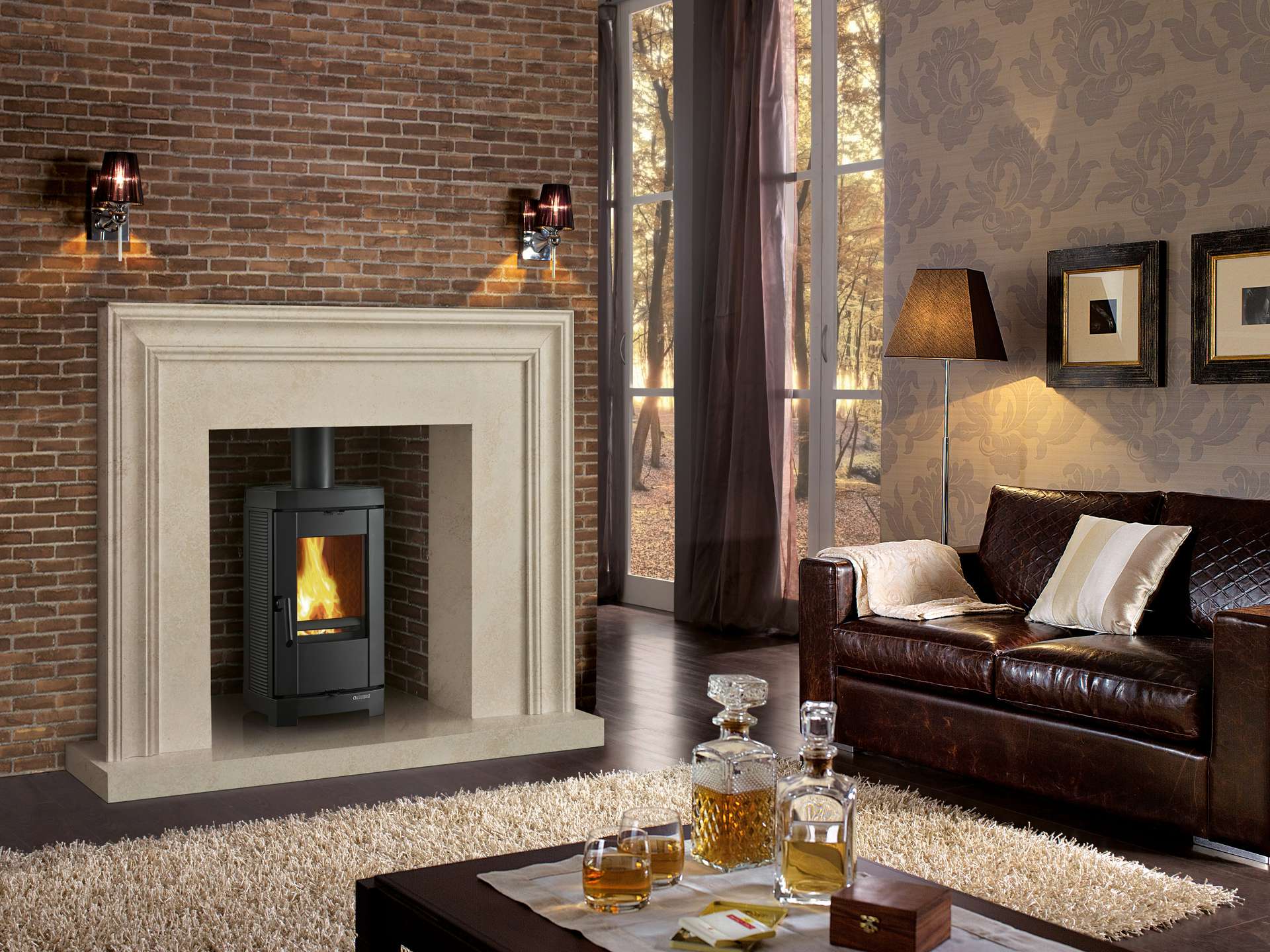Wood burning stove with structure completely in enameled cast iron. Small dimensions for insertion in small spaces.