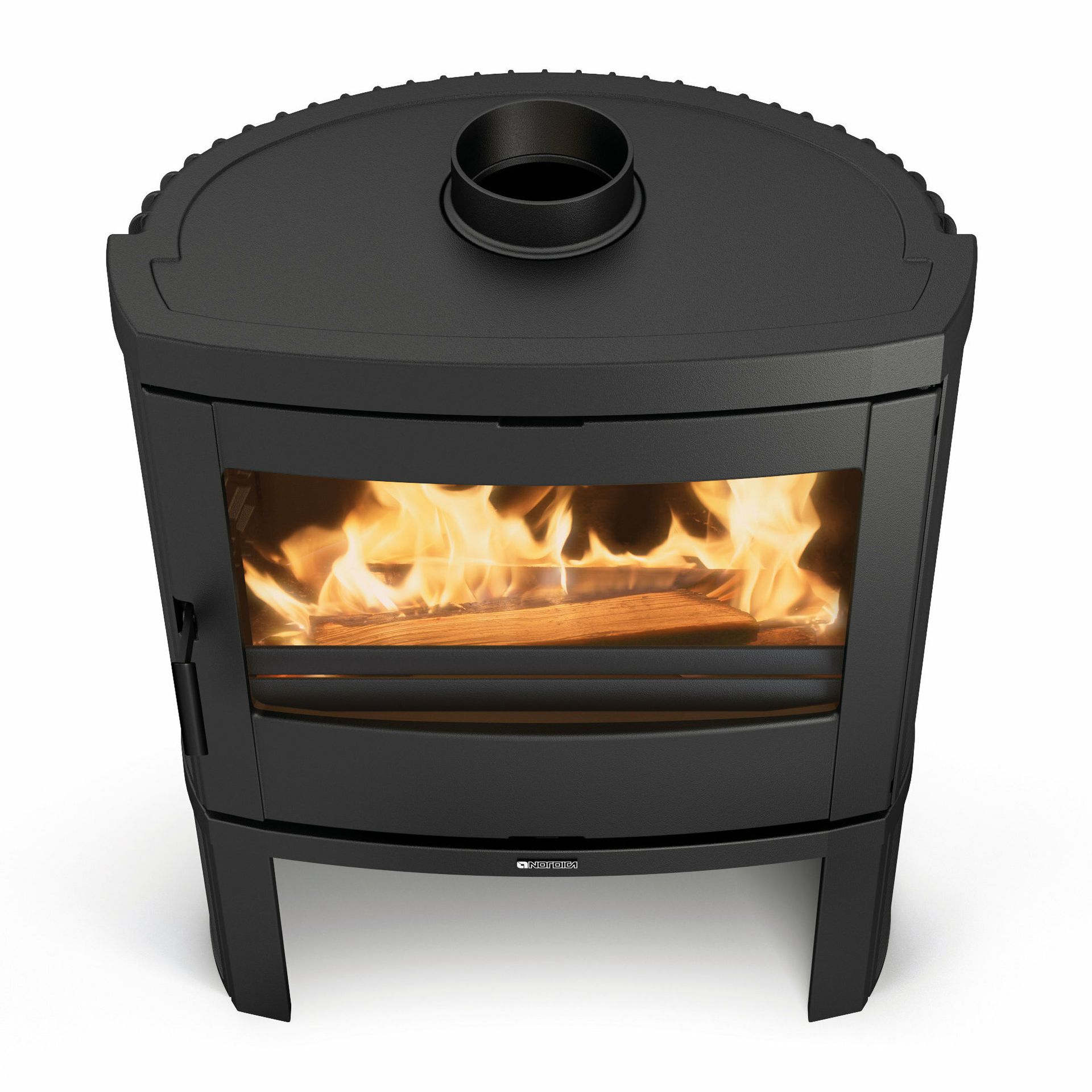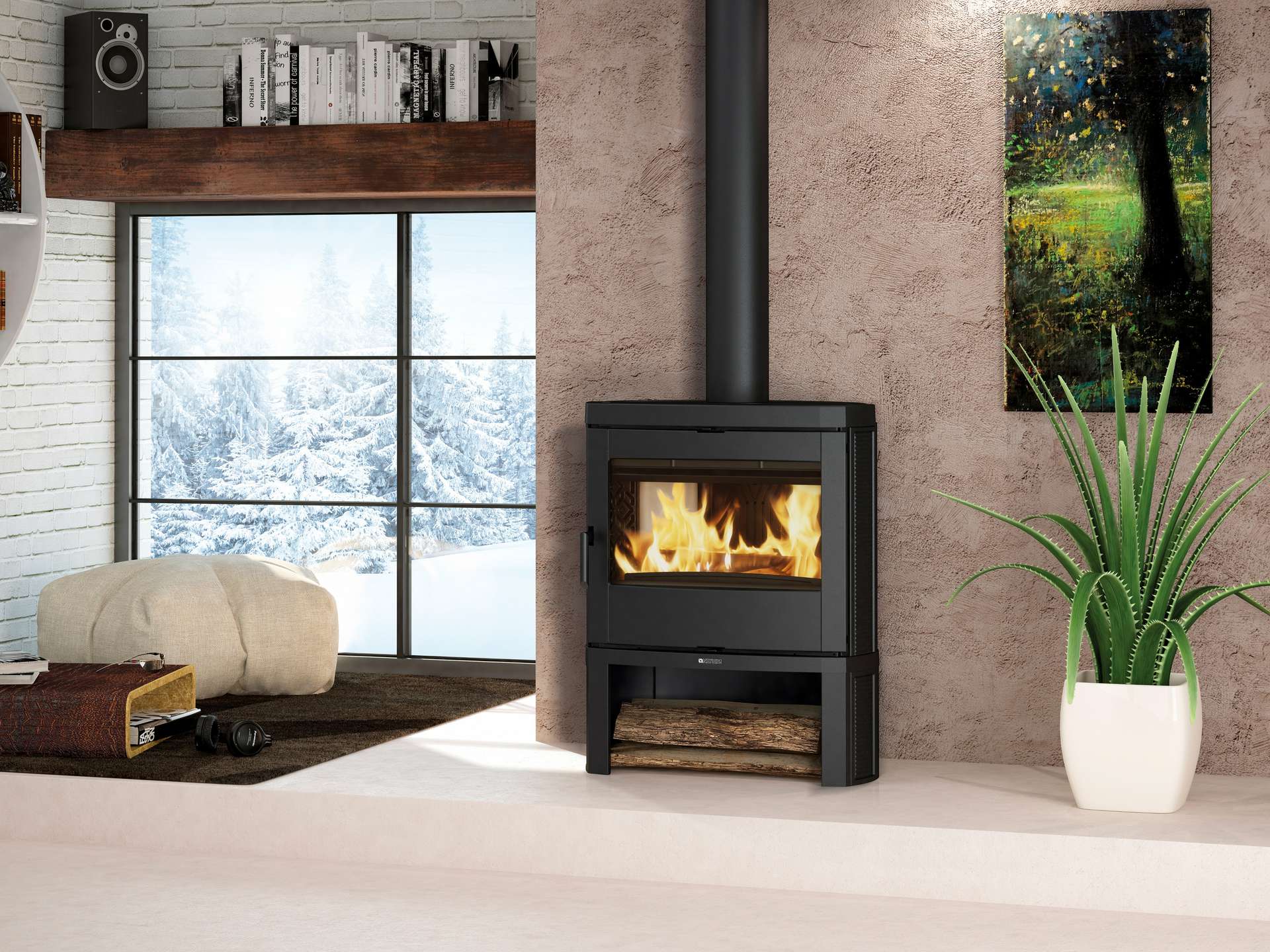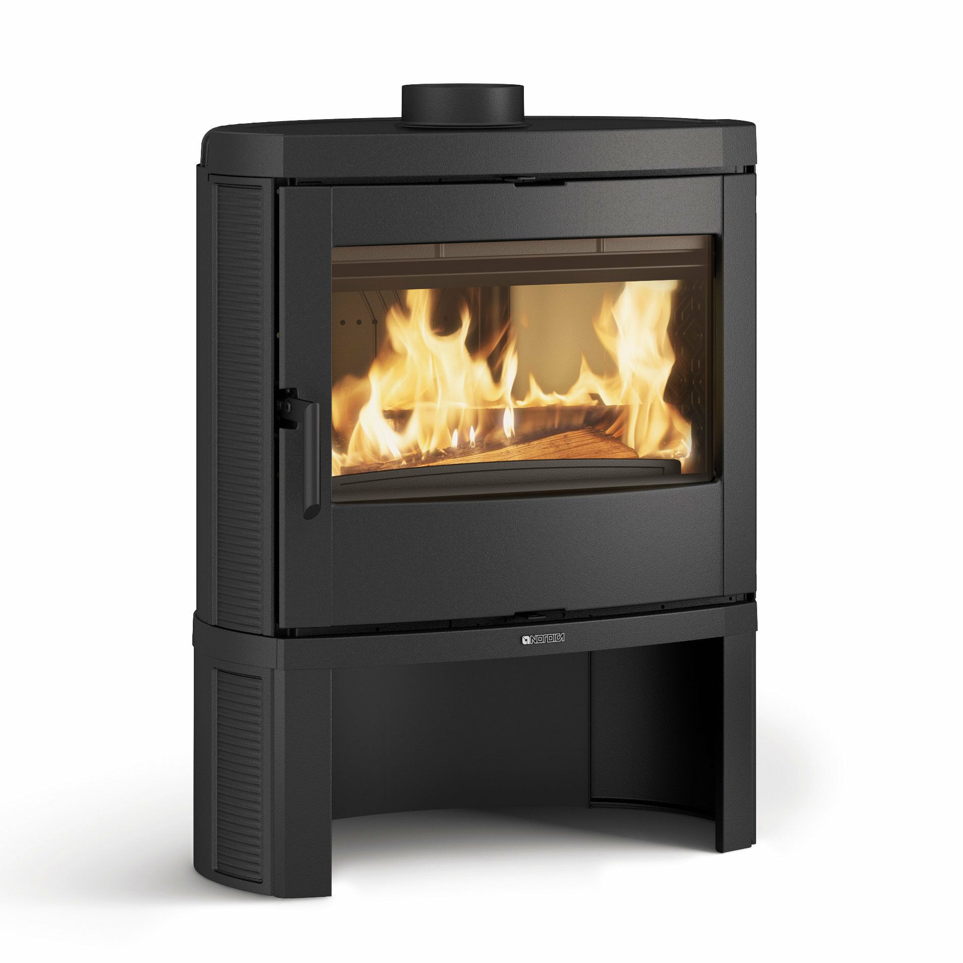 Cast iron wood burning stove with a wide fire vision. Wide hearth allows to load logs up to 50 cm. Ceramic glass. Internal facing of the hearth in cast iron and Nordiker.