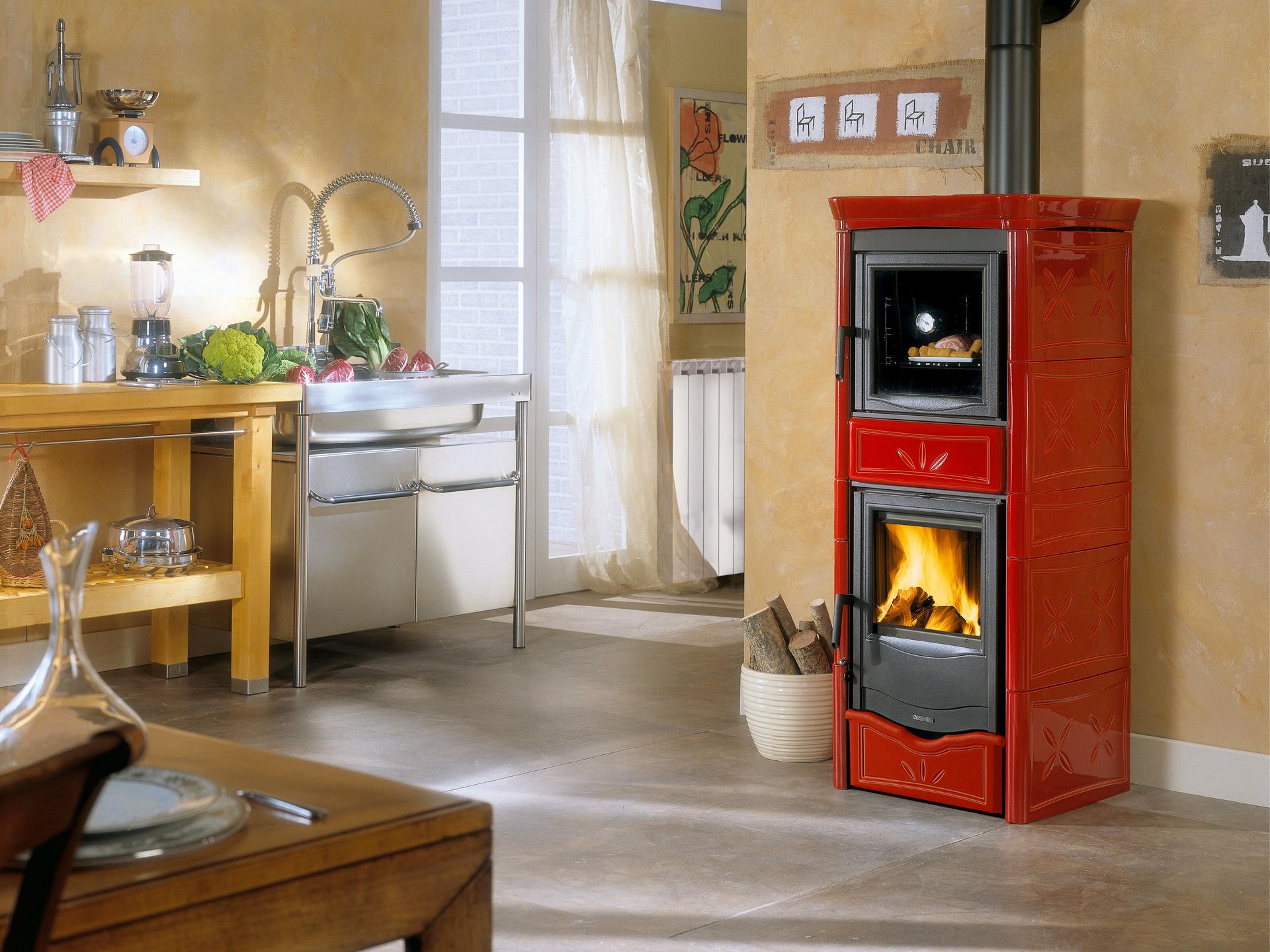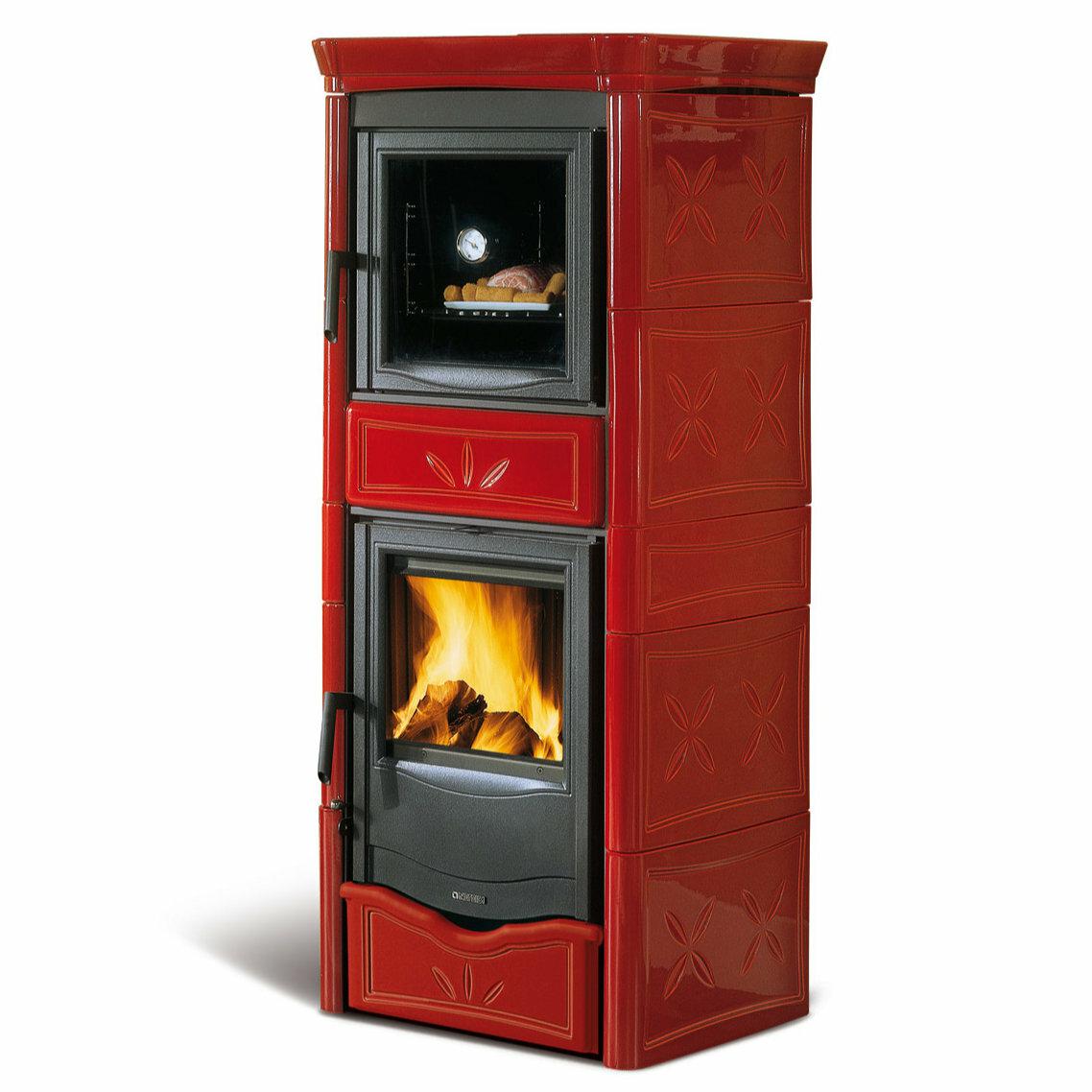 Wood burning thermo-stove with porcelain enamelled steel oven, DSA security device (DSA valve not included) and hand-crafted majolica cladding. Internal facing of the hearth in cast iron and steel. Enamelled cast iron door with ceramic glass. Air thermostatic valve.