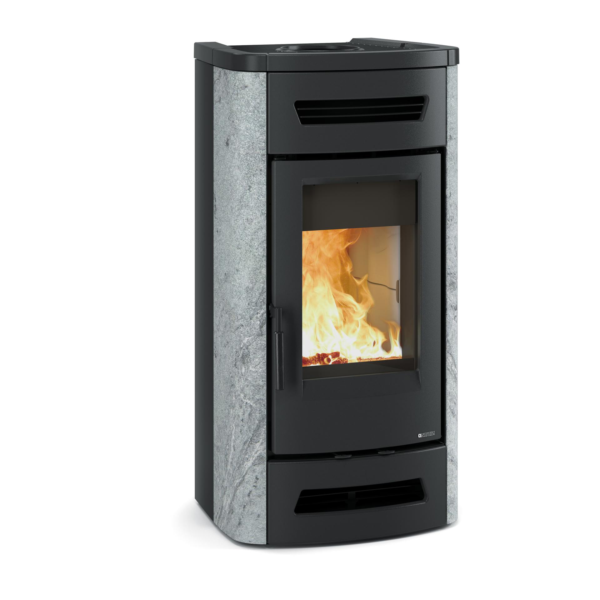 The stove has enameled cast iron doors, top and front. Outside covering in natural stone. La Nordica Oriana ensures a wide view of the fire. The hearth of the stove is made of cast iron and Nordiker.