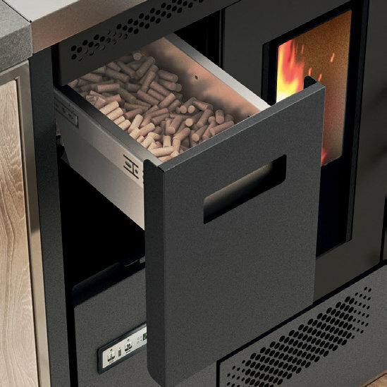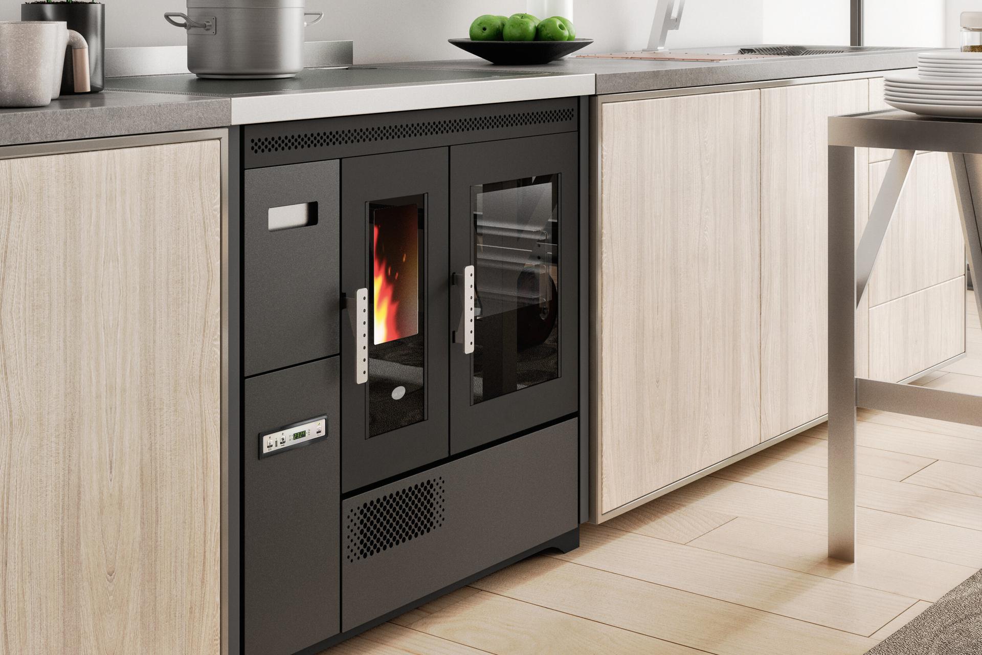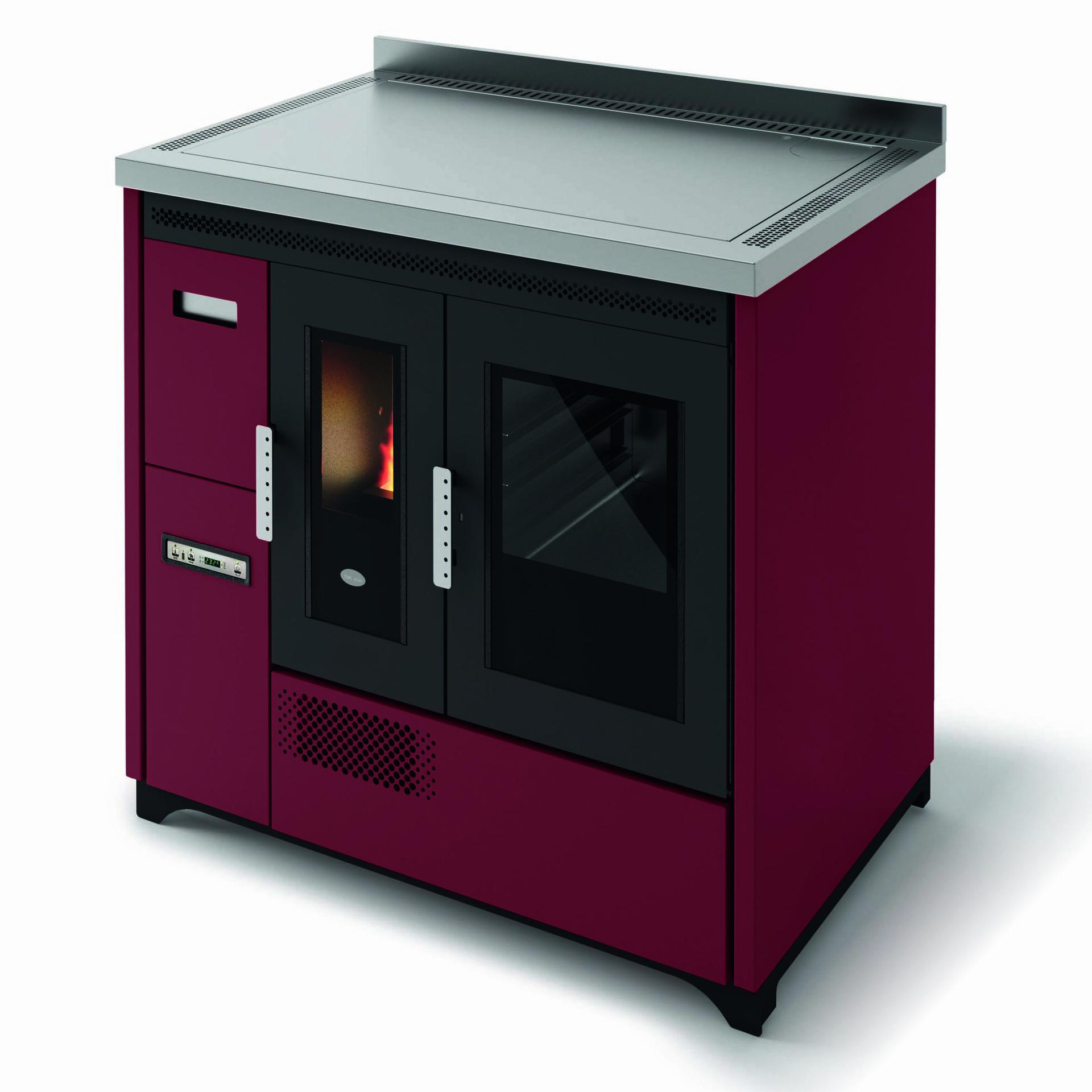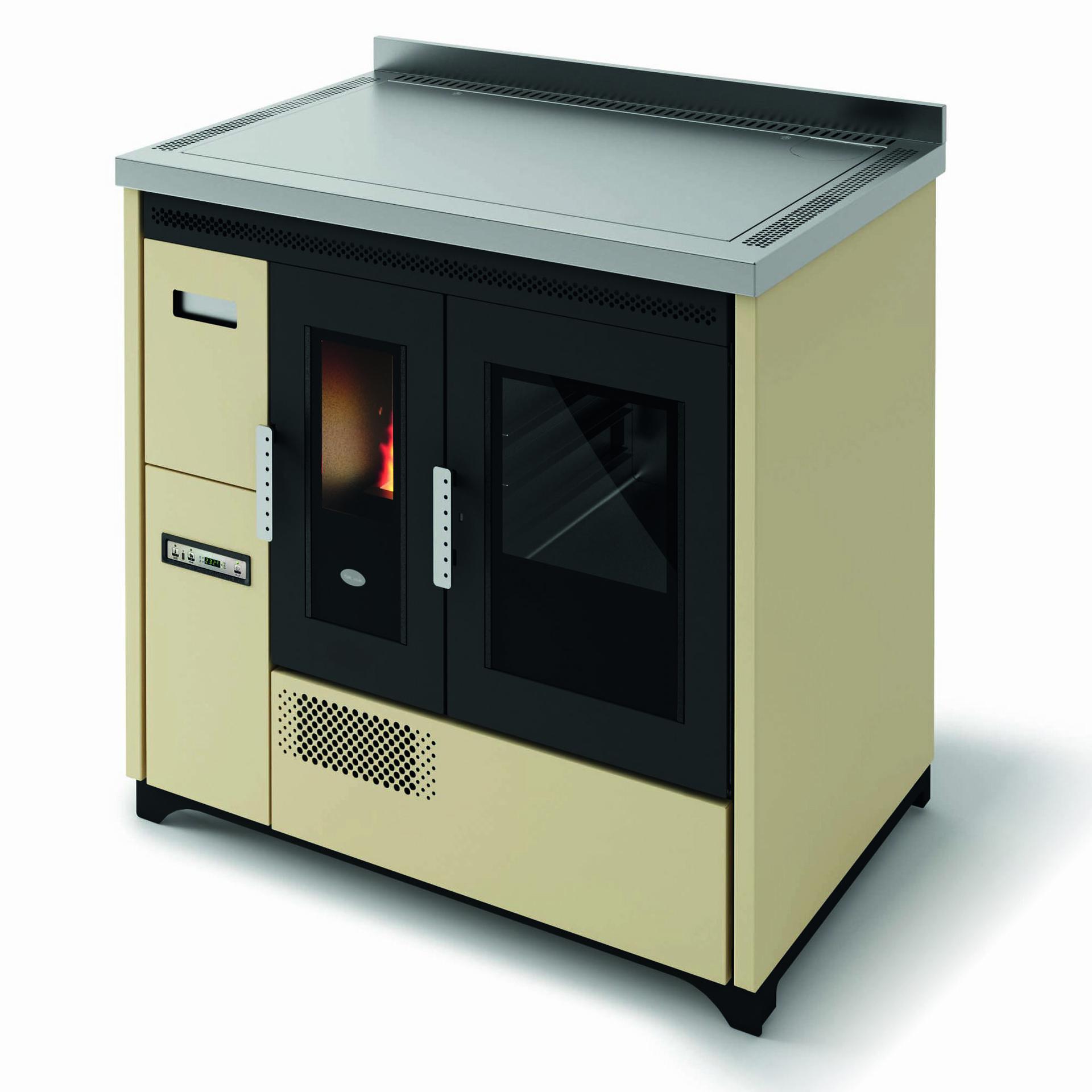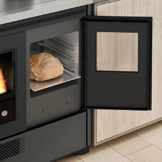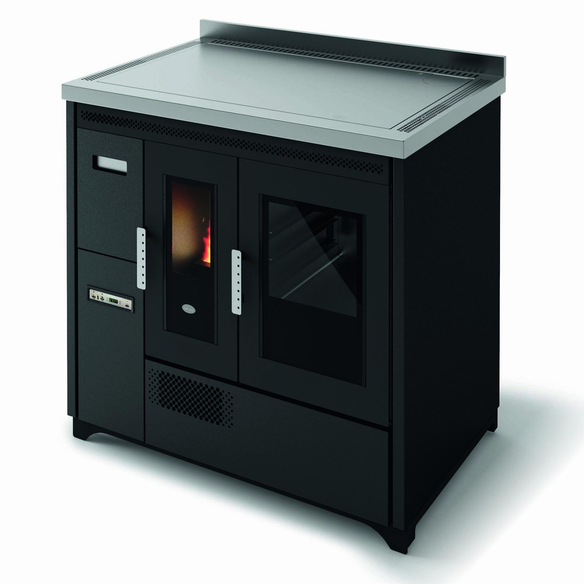 Pellet-burning cooker with stainless steel oven that can be installed as a freestanding or built-in unit. The oven temperature is controlled via a display with a range of 120-230°C. Removable tray holder guides, aluminium tray and tray holder grid supplied as standard. Forced ventilation for hot air distribution. 5 power levels with menu display in 6 languages. Safety thermostat and connection for external thermostat. Cast-iron grate, removable ash tray and flue outlet at the back and top.
