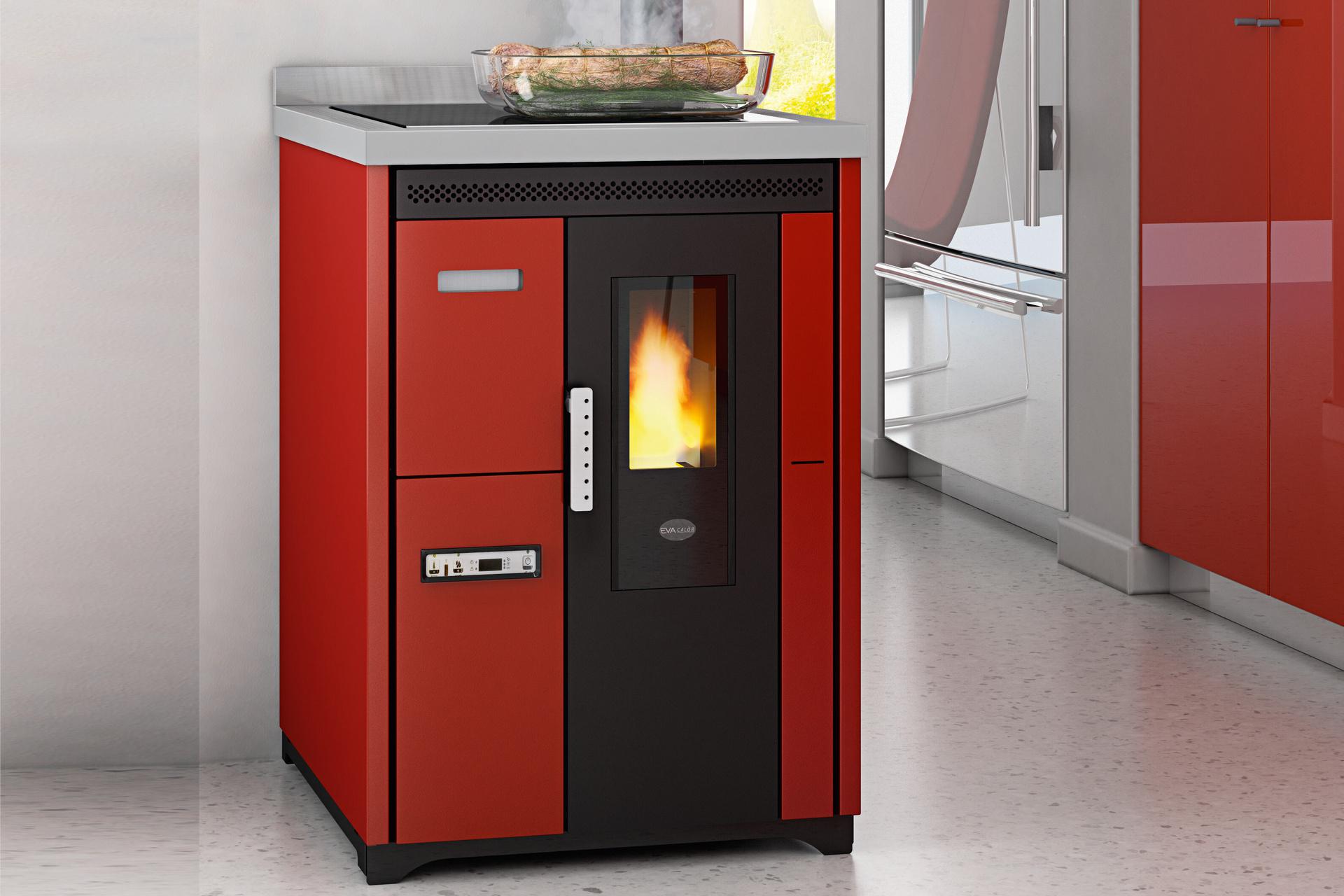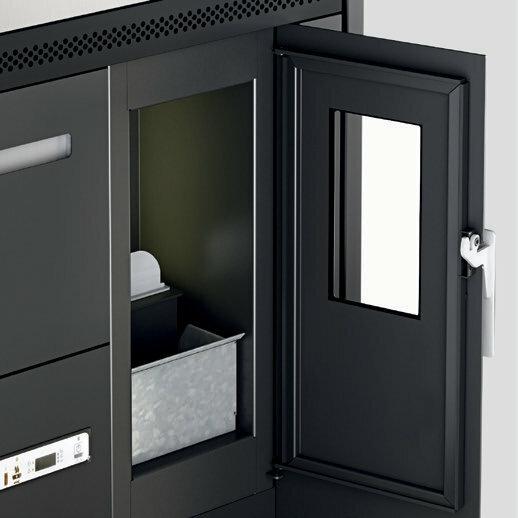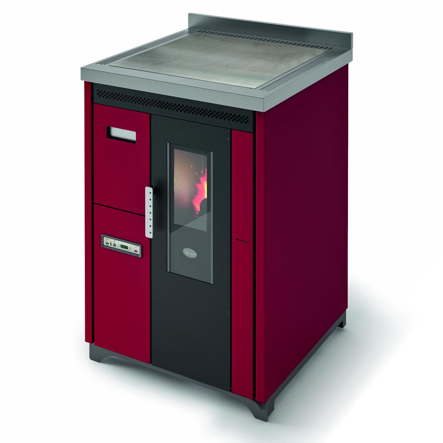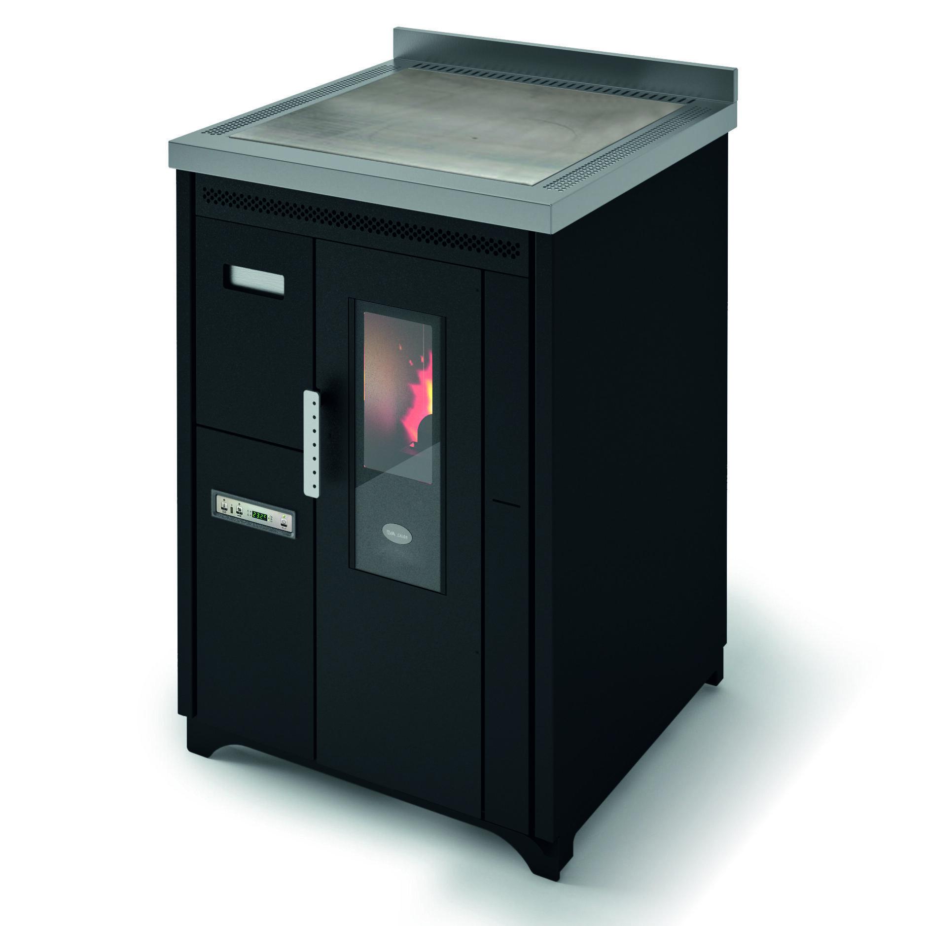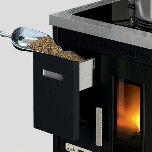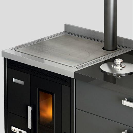 Pellet-burning cooker with steel cooking plate. Forced ventilation for heat distribution can be switched off if not required, e.g. in summer. Removable front drawer for easy loading of pellets. 10 (5+5) power levels are managed via the menu display, which is available in 6 languages. Safety thermostat and manostat with the possibility of connecting an external thermostat. Rear and top flue connections to better suit installation requirements.