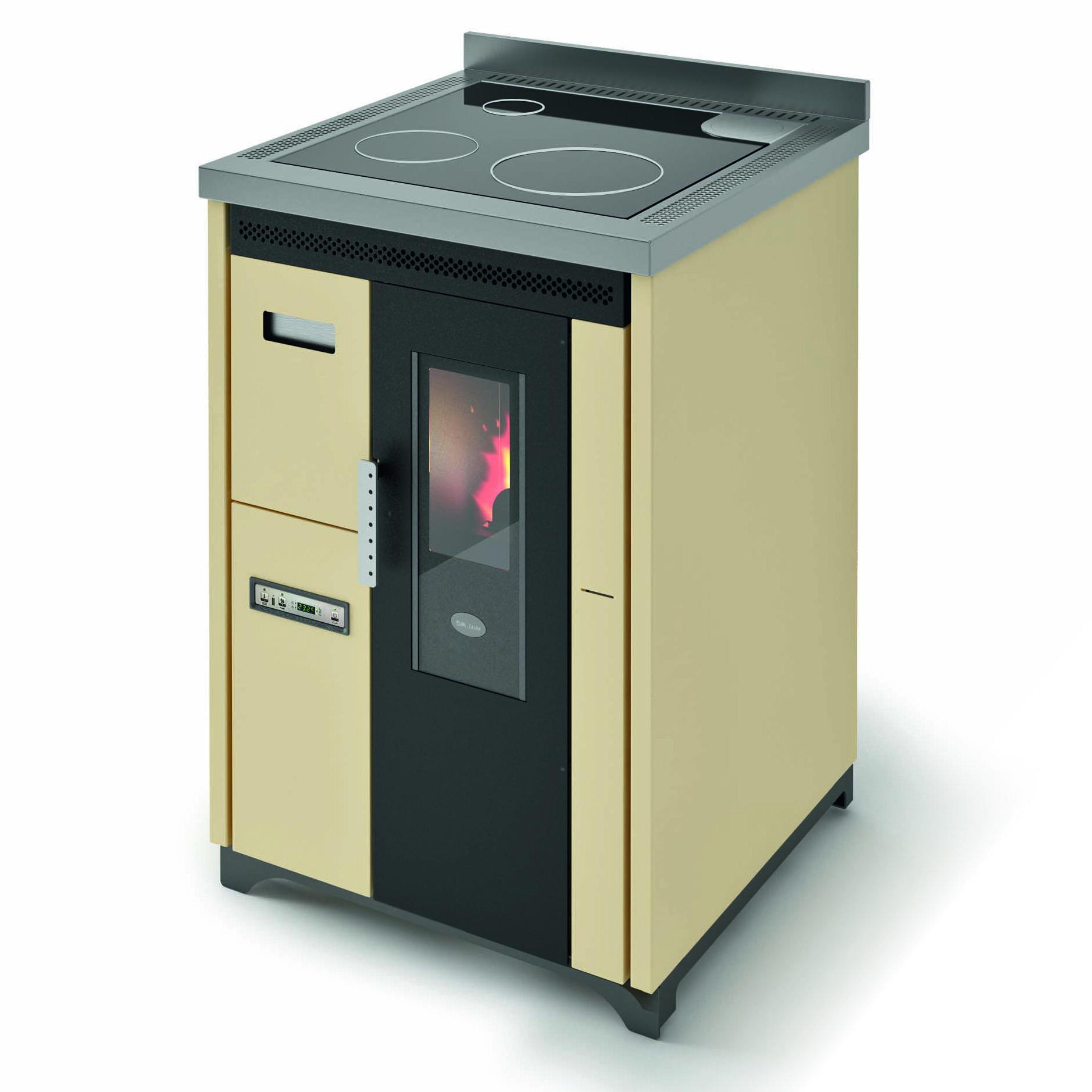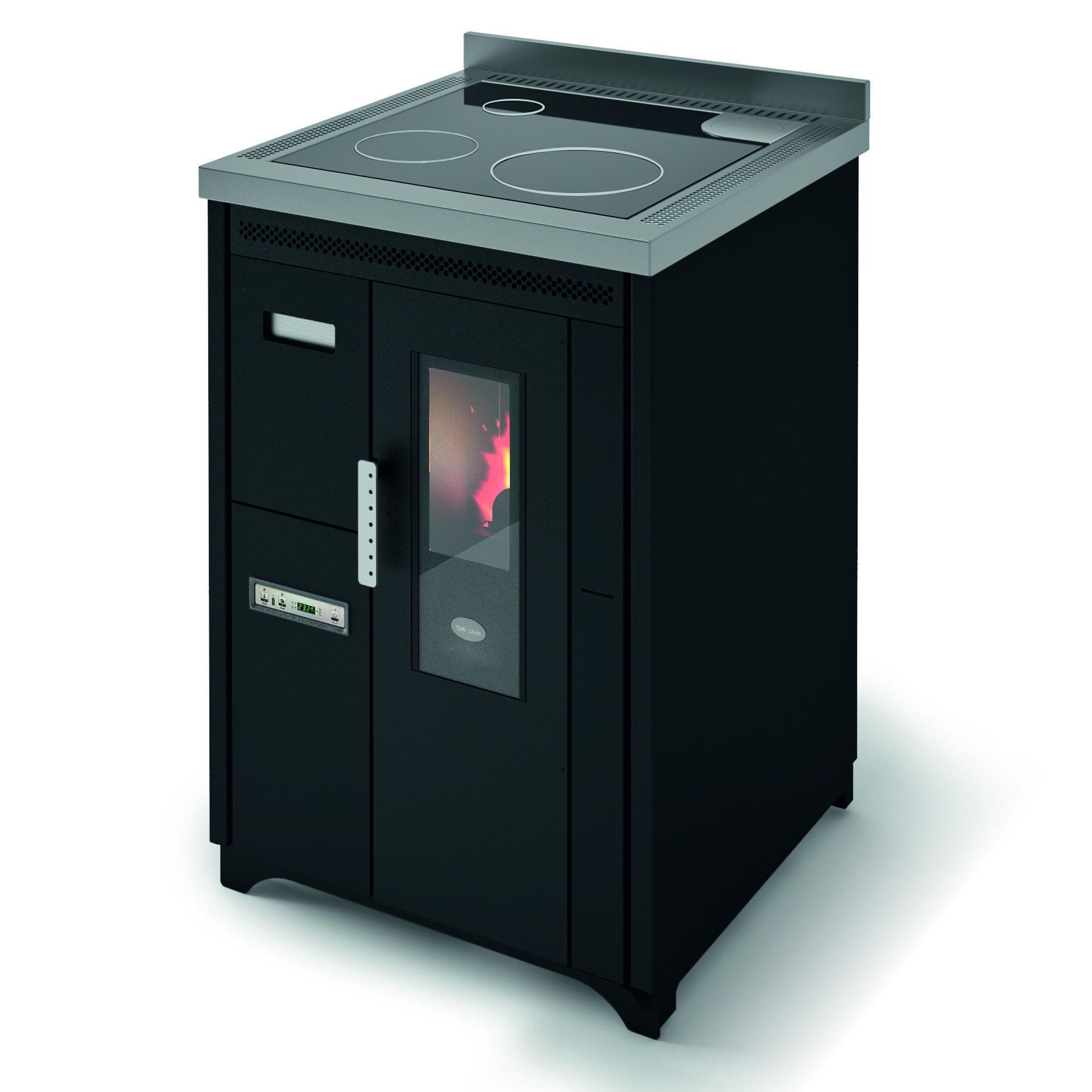 Pellet-burning cooker with cooking plate in ceramic glass. Forced ventilation for heat distribution can be switched off if not required, e.g. in summer. Removable front drawer for easy loading of pellets. 10 (5+5) power levels are managed via the menu display, which is available in 6 languages. Safety thermostat and manostat with the possibility of connecting an external thermostat. Rear and top flue connections to better suit installation requirements.