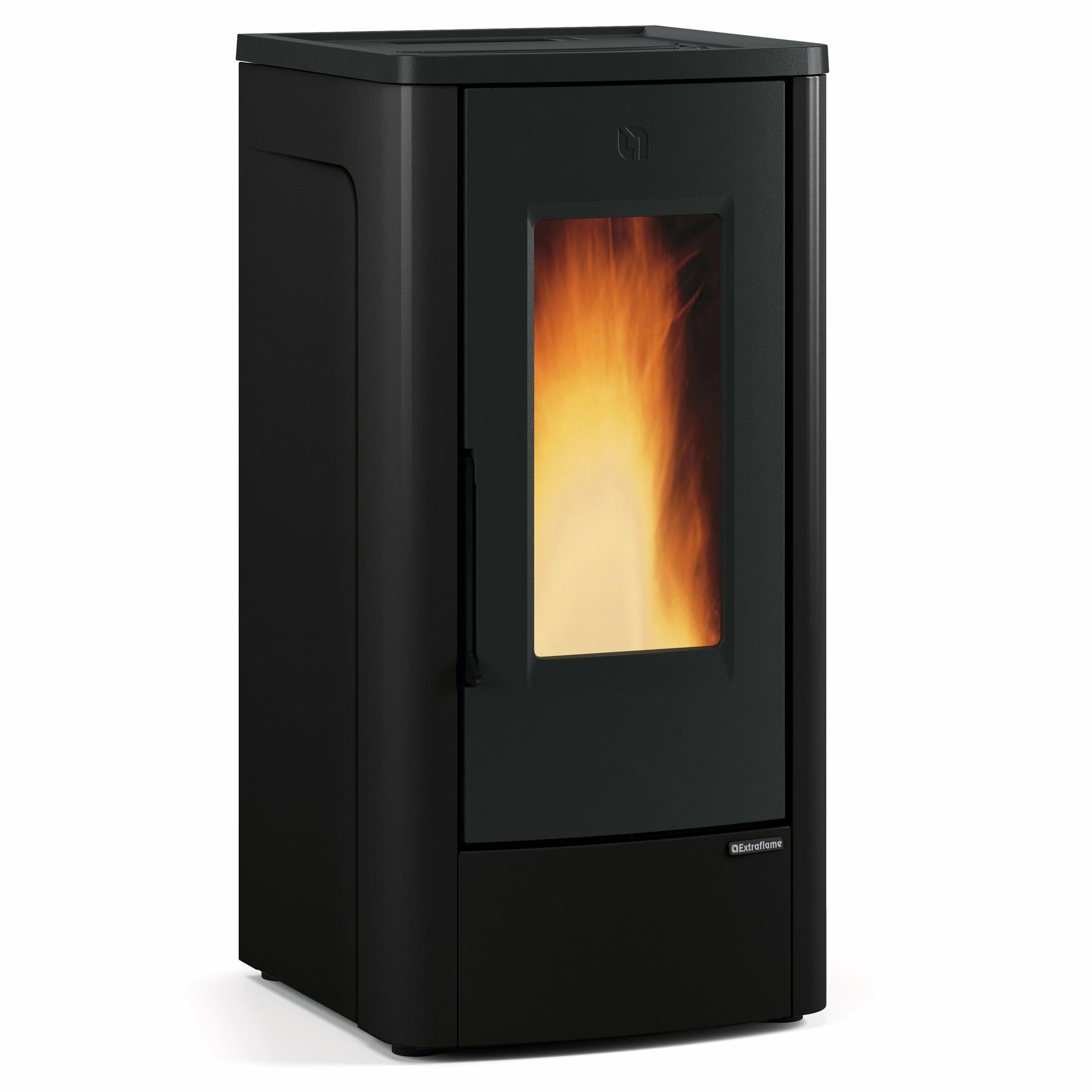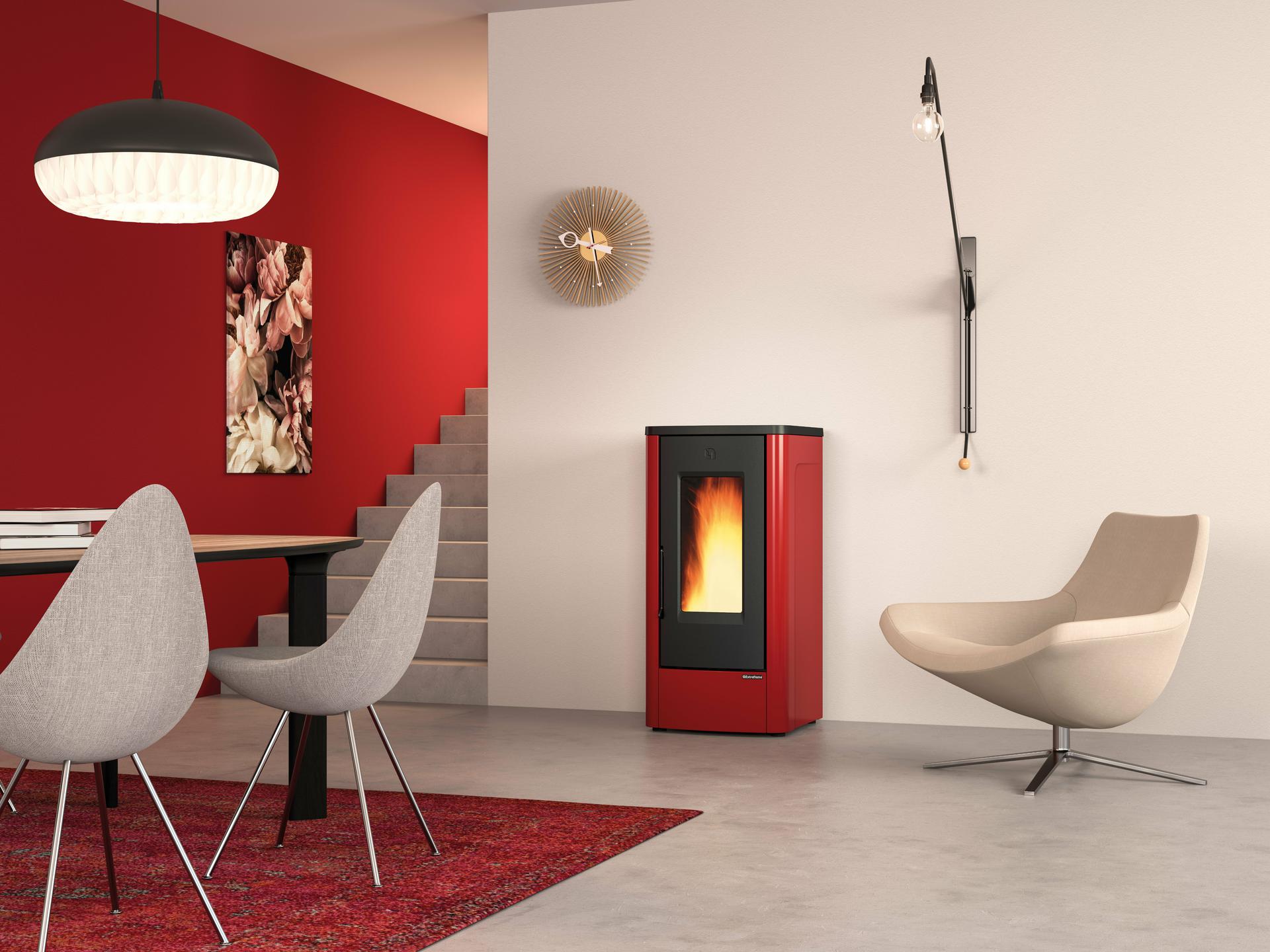 Pellet stove with ducting system with high capacity pellet storage tank. Upper room ventilation with two dedicated motors, with Comfort function motor able to distribute air up to 8 m duct length, thermostable, excludable.