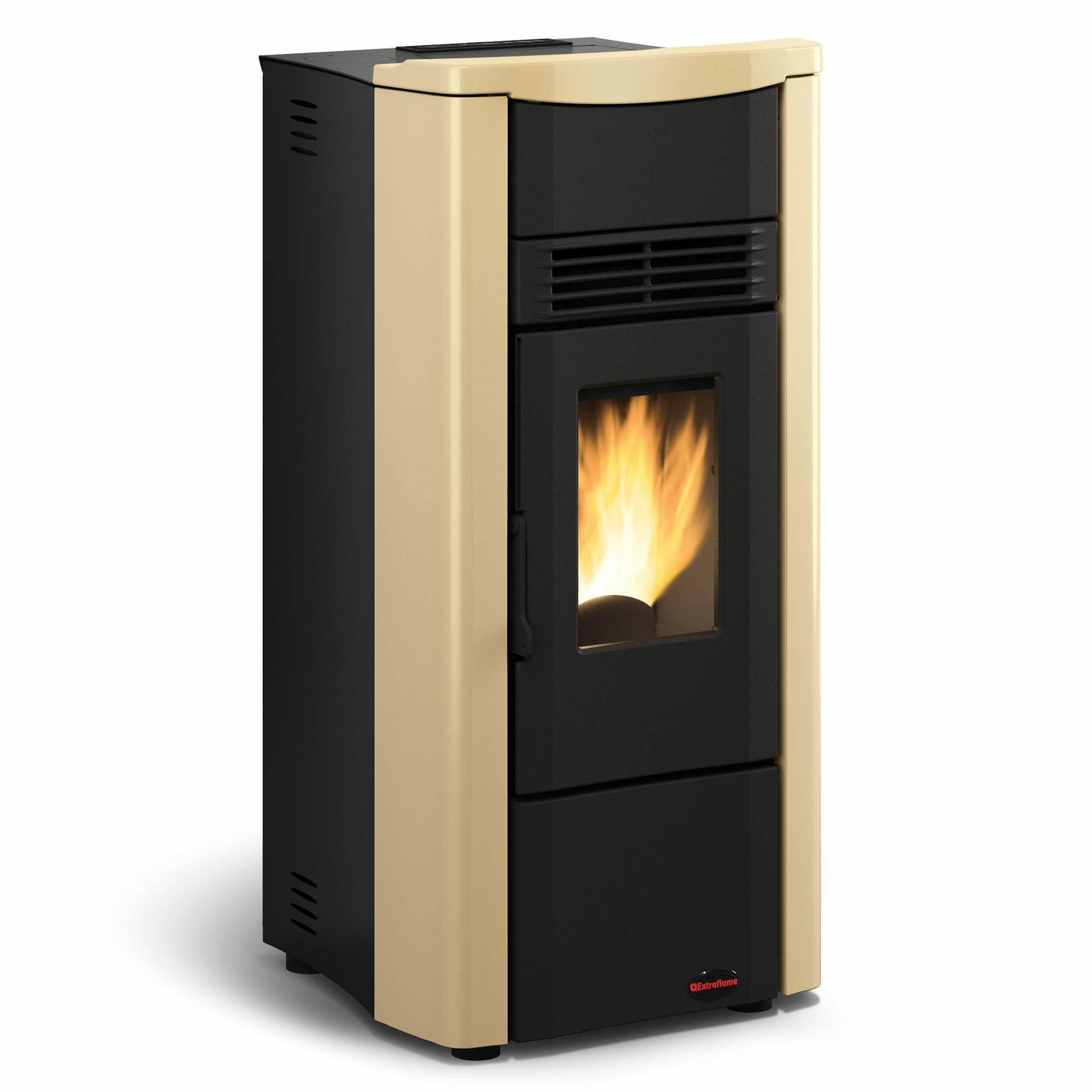 Pellet stove in steel and majolica top cover with weekly programmable thermostat.
