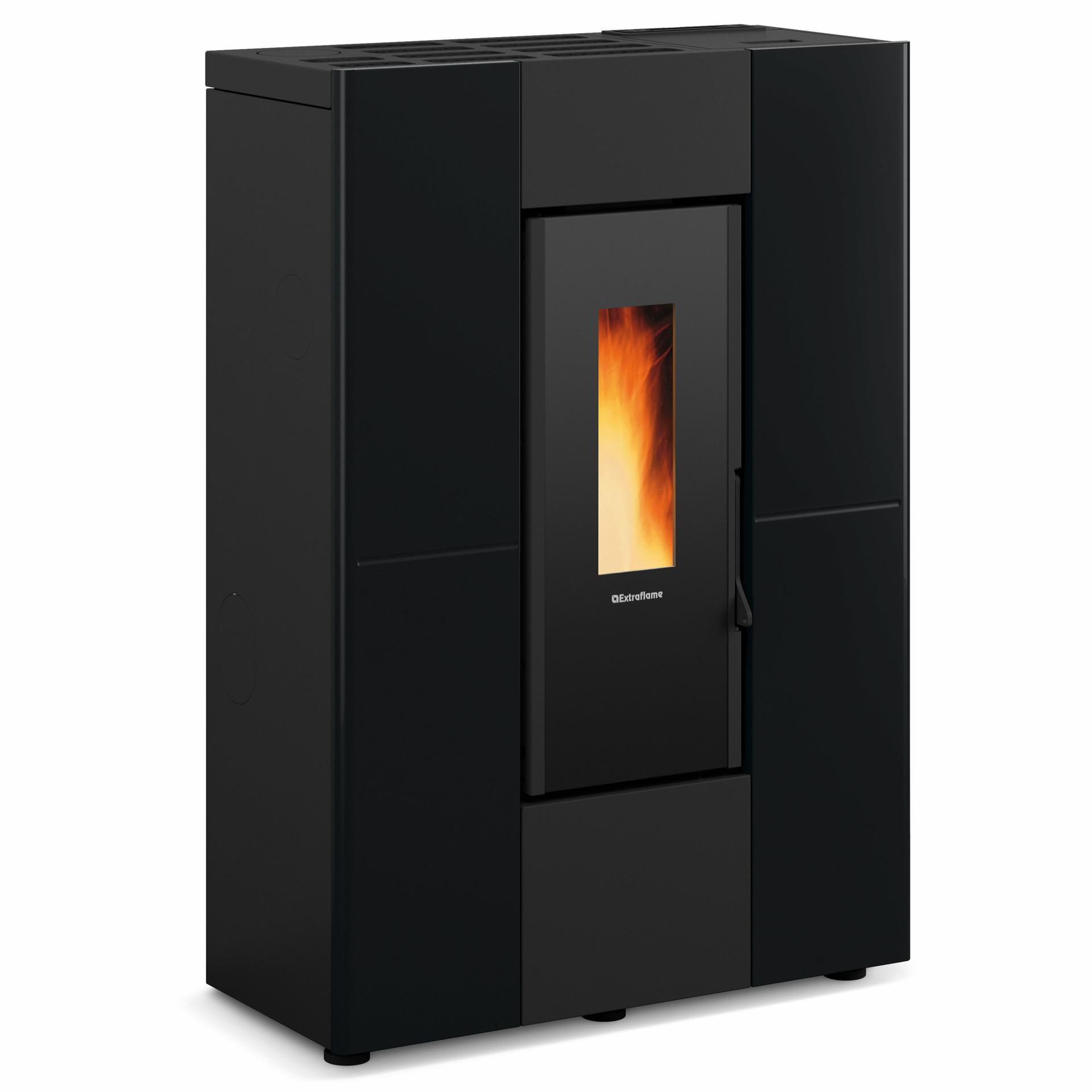 Tight pellet stove with painted steel covering. Ducting system with dedicated motor till 8 m, thermostable, excludable. Hearth, fire door and brazier in cast iron.