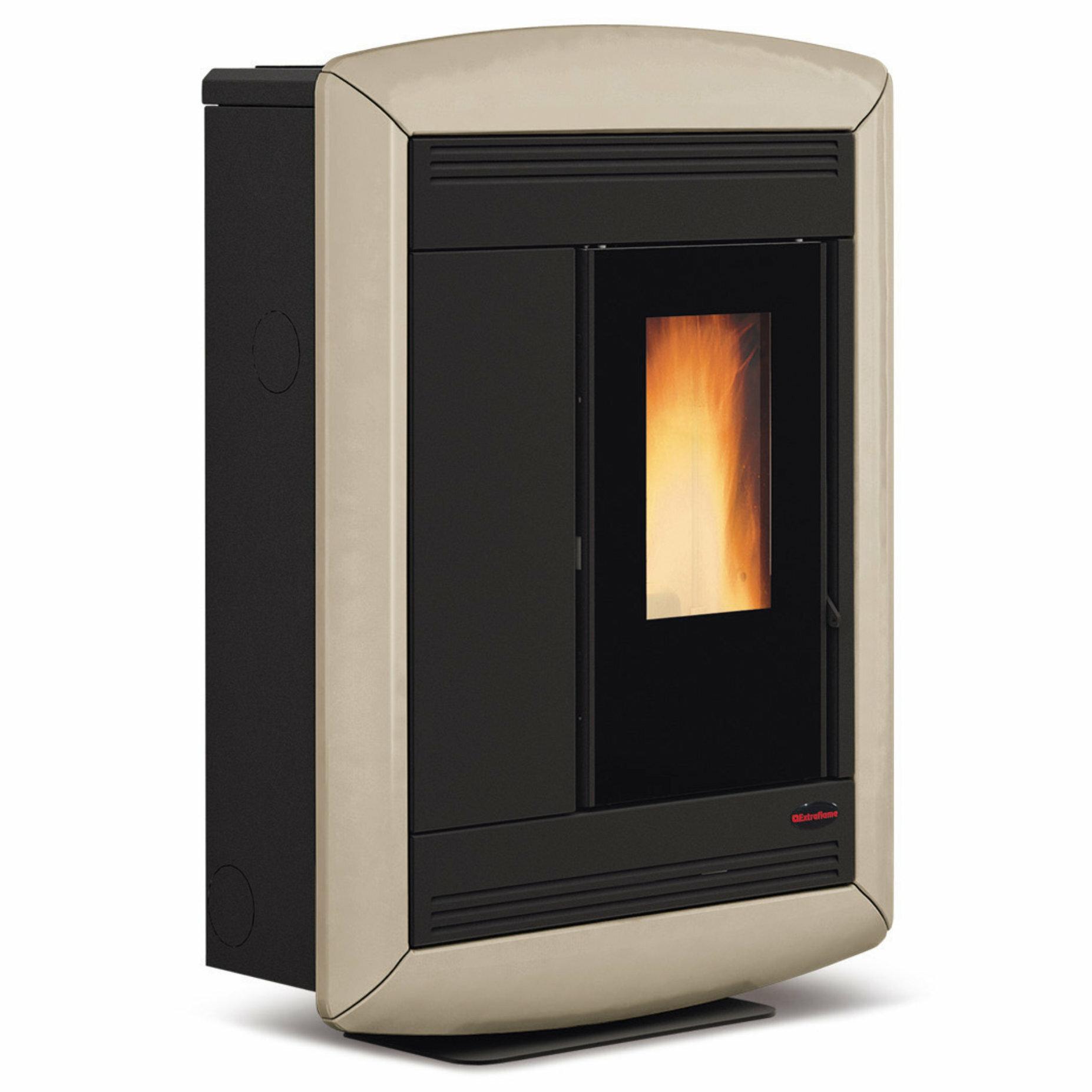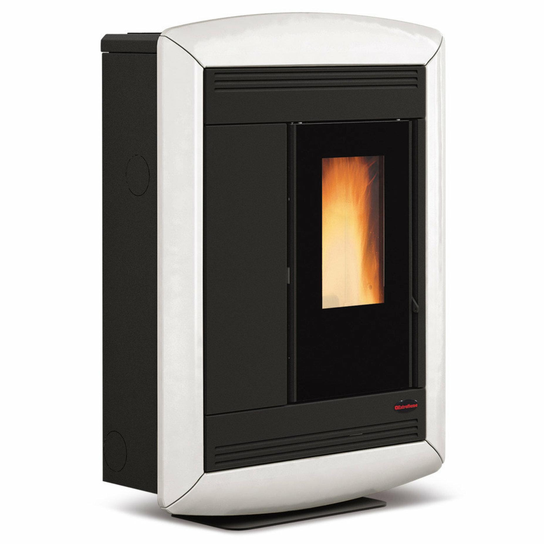 Tight pellet stove with ducting system. High temperature painted steel and majolica covering. Hearth, fire door and brazier in cast iron, shell and tube exchanger with manual cleaning.