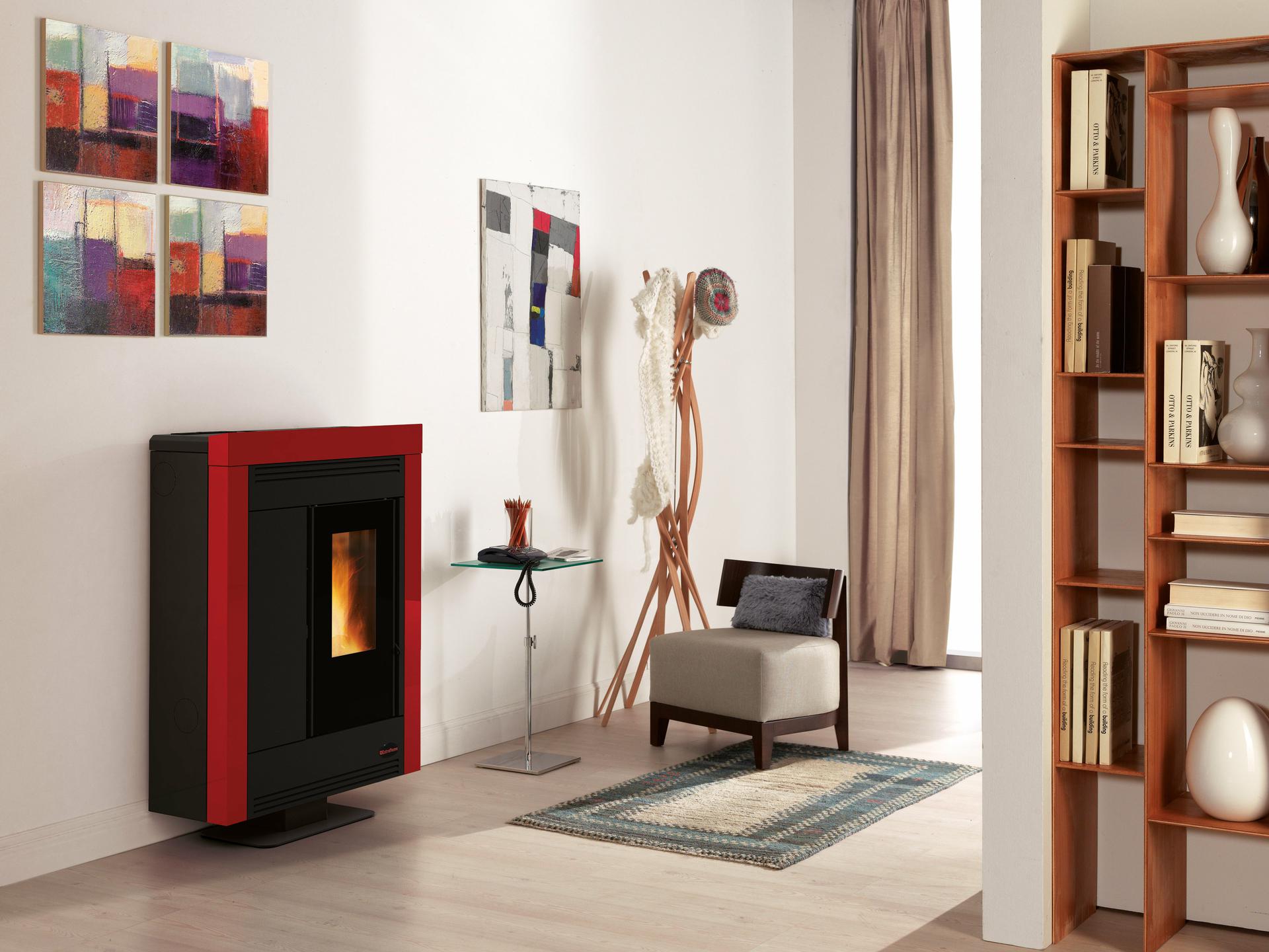 Tight pellet stove with ducting system. High temperature painted steel covering. Hearth, fire door and brazier in cast iron, shell and tube exchanger with manual cleaning.
