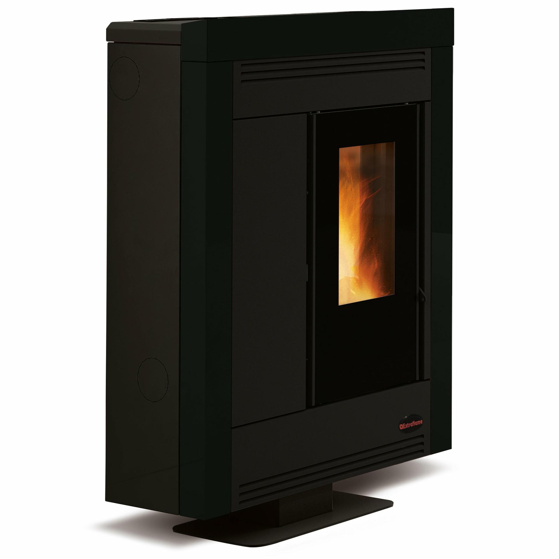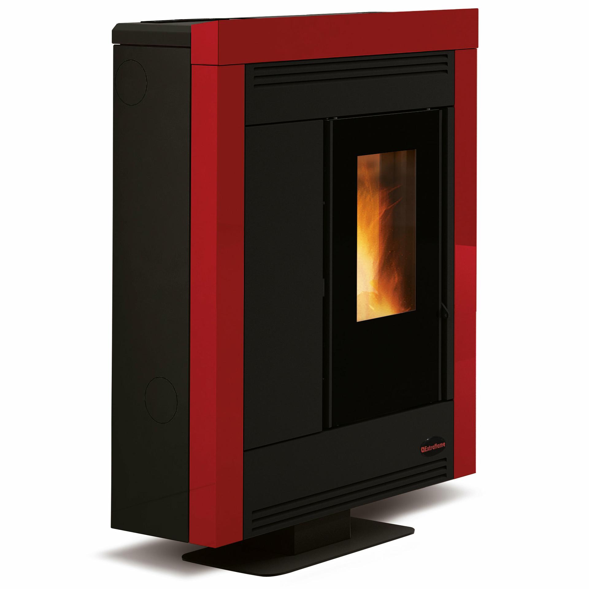 Tight pellet stove with ducting system. High temperature painted steel covering. Hearth, fire door and brazier in cast iron, shell and tube exchanger with manual cleaning.