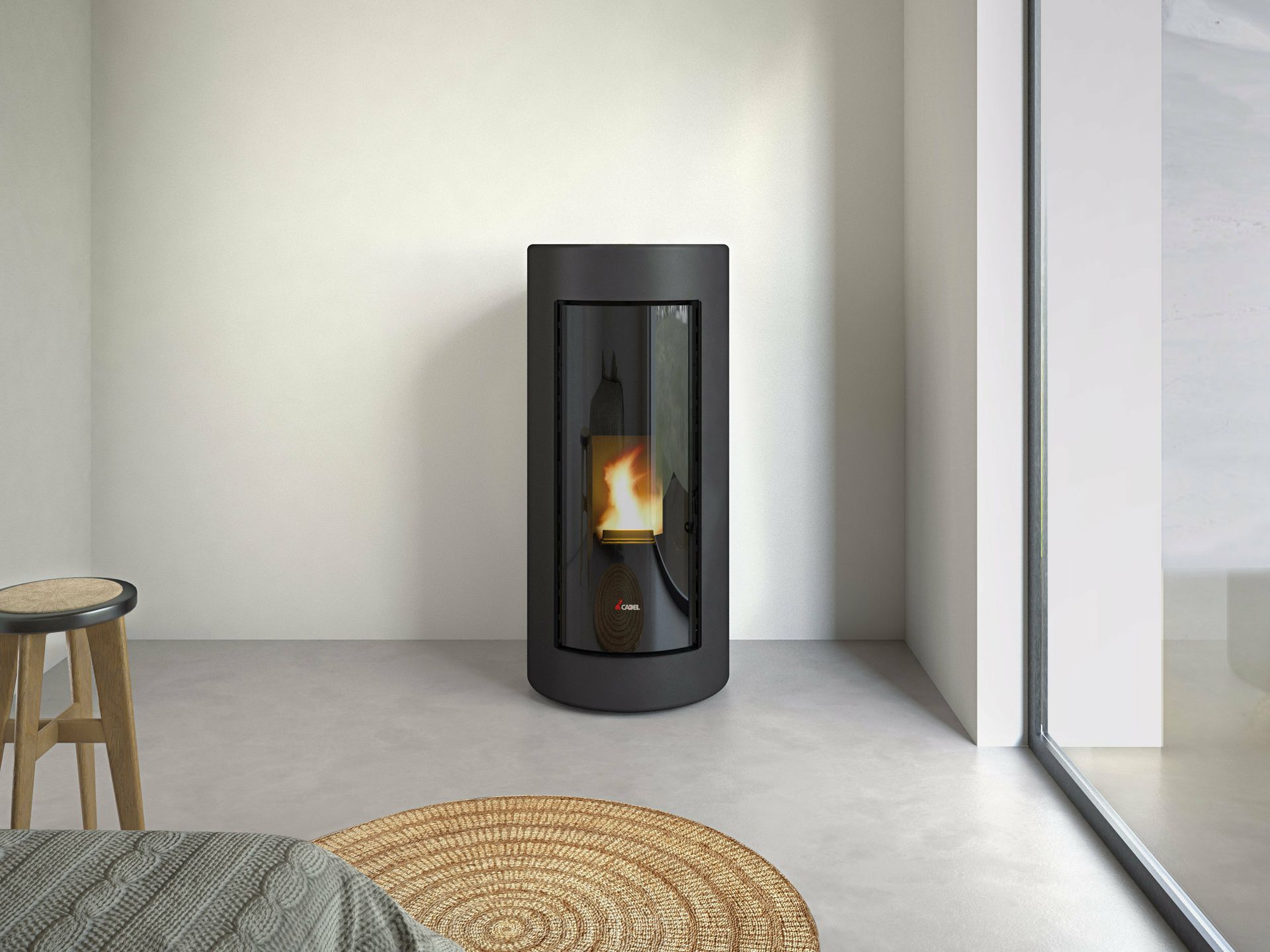 Soft lines and high-tech materials for a stove with a unique design. When the stove is off, its Magic Glass darkens, transforming it into a real furnishing element. The cover is in painted steel.