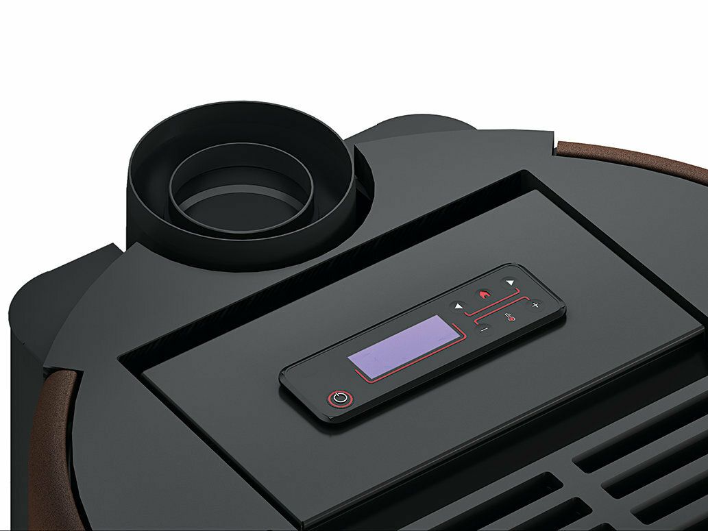 Soft lines and high-tech materials for a stove with a unique design. When the stove is off, its Magic Glass darkens, transforming it into a real furnishing element. The cover is in painted steel. Top smoke exhaust outlet.