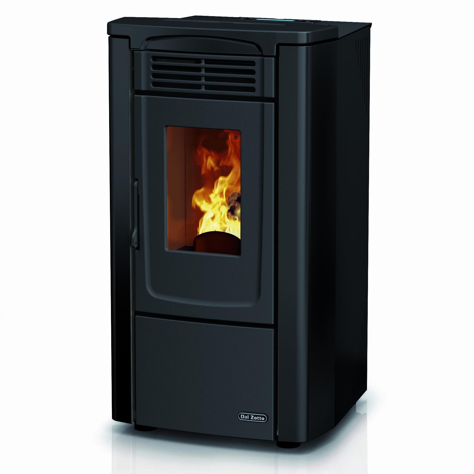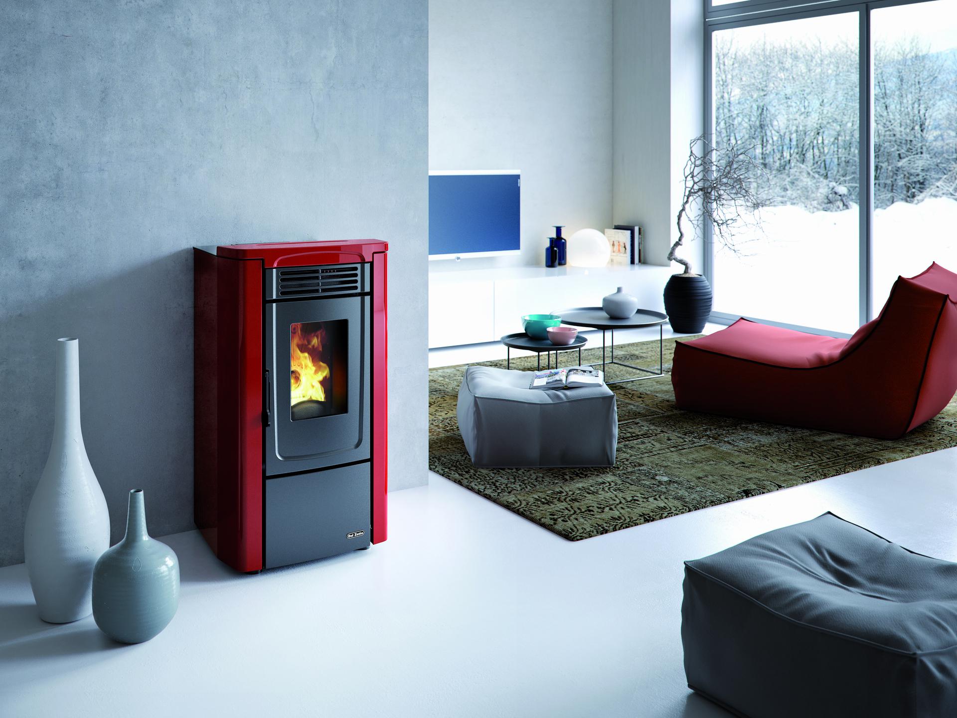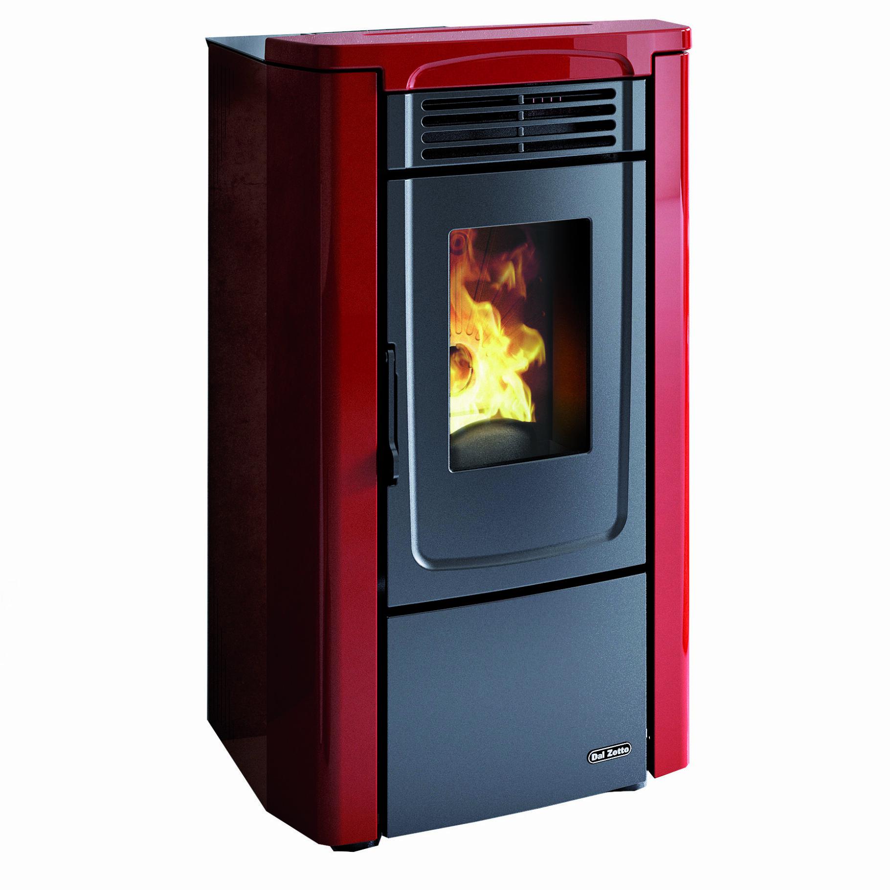 Pellet stove with outer covering in steel and top side in majolica. Fire-viewing ceramic glass with cast-iron door.