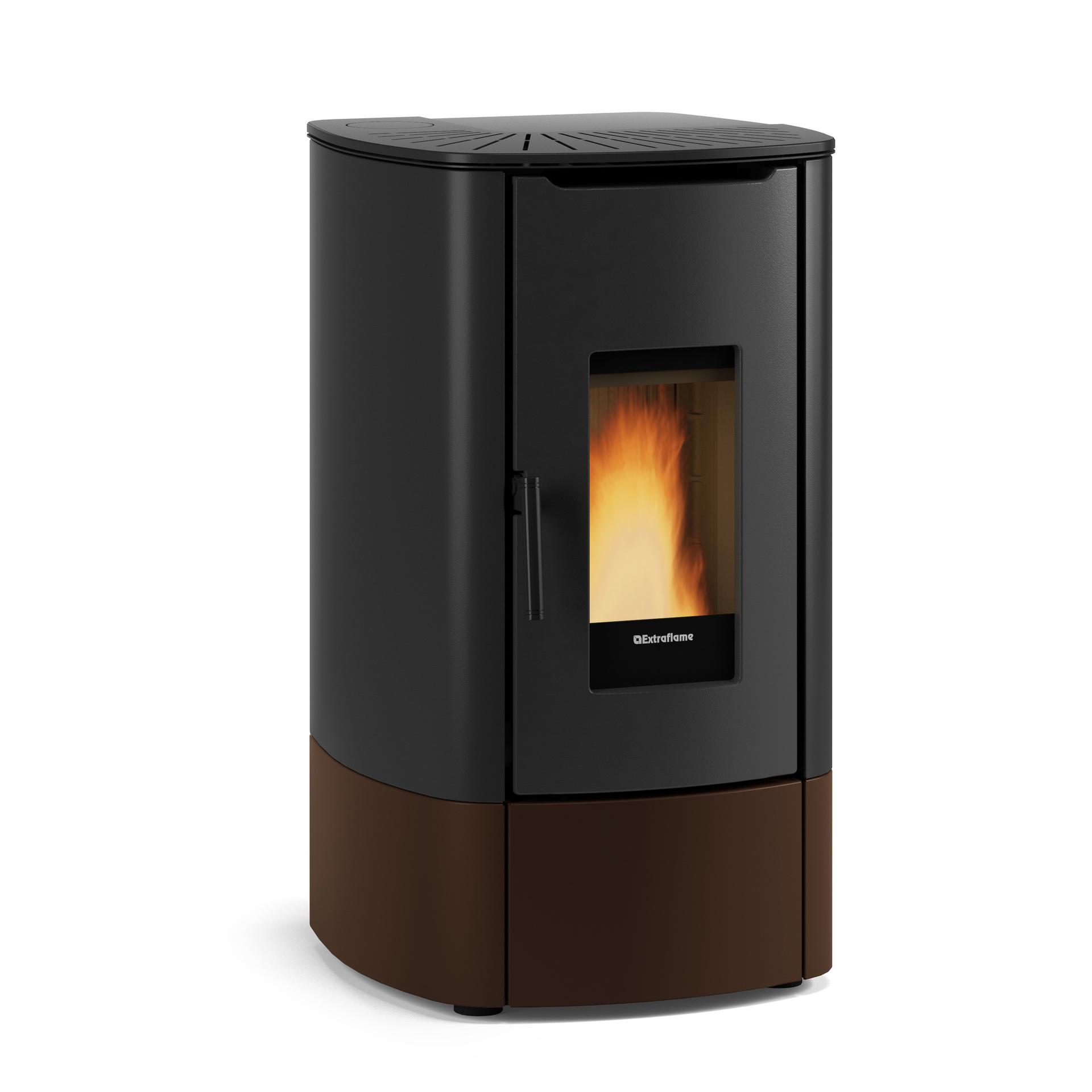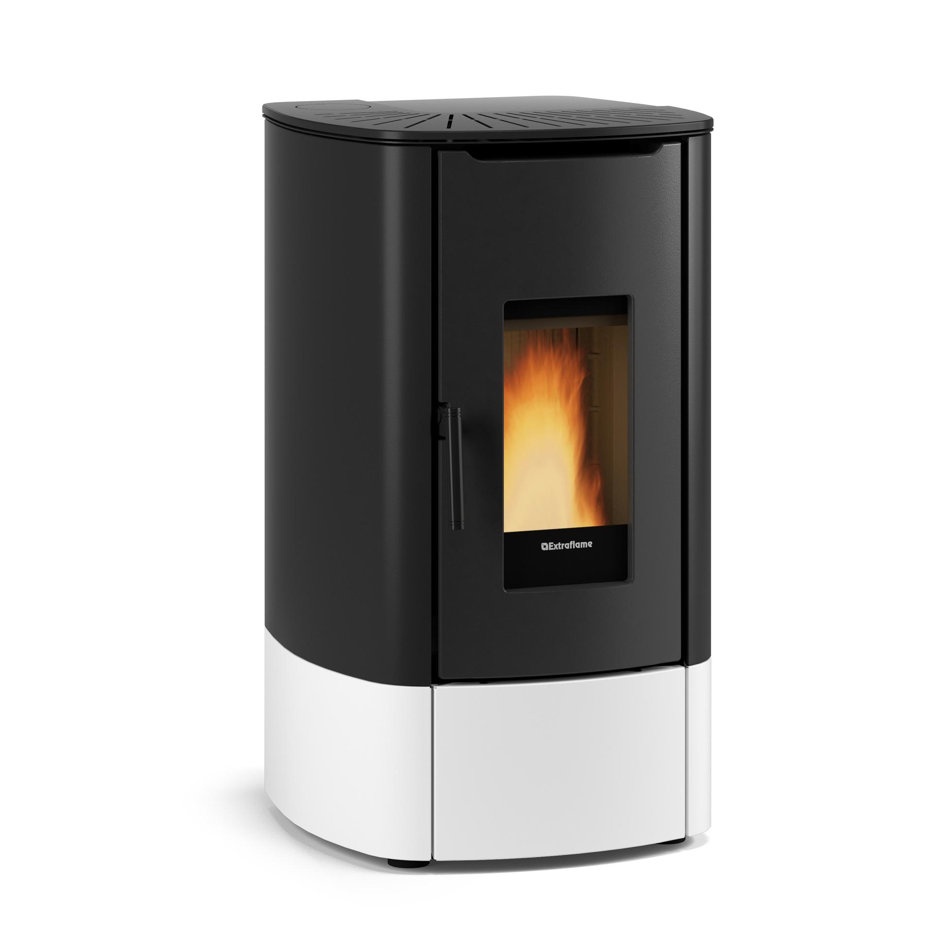 Pellet stove with two-tone painted steel casing that enhances the design of the room in which it is installed. The fire door, hearth and brazier are made of cast iron, which gives the stove robustness and durability.