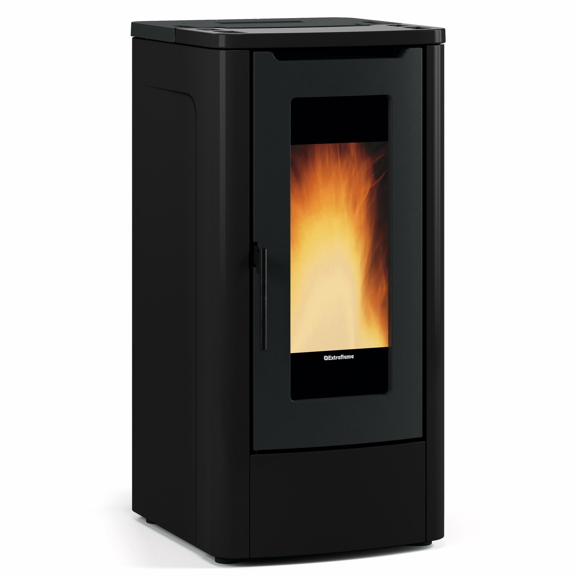 Ventilated pellet stove with radiant surface heat exchanger and high capacity pellet storage tank. Hearth, fire door and brazier in cast iron. Ergonomic handle.