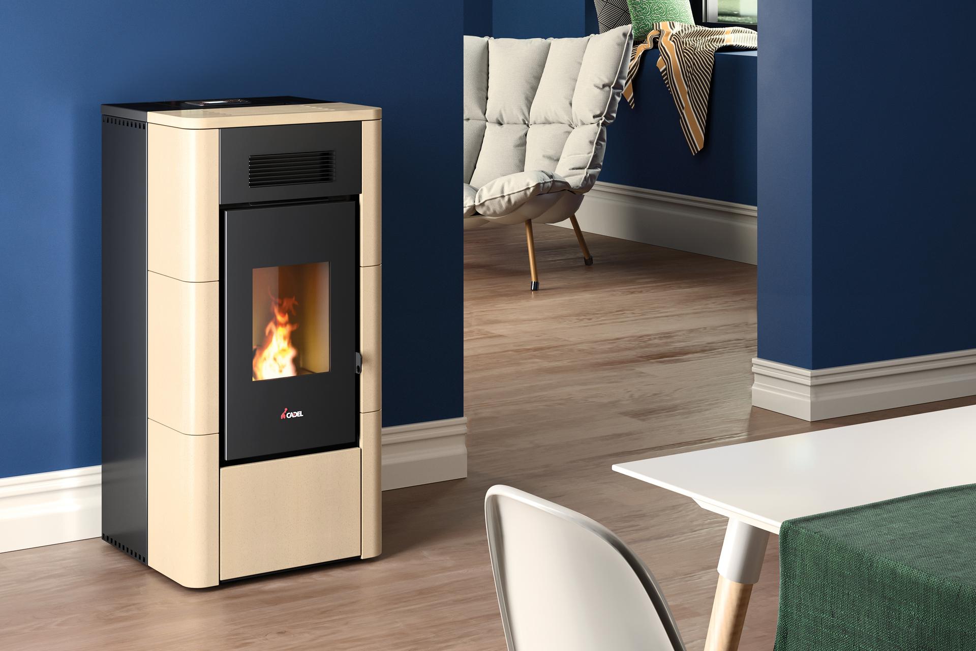 The ventilated hydro stove, with a minimalist chic look, with metal cladding that integrates majolica elements. It is equipped with a Go Fast ceramic spark plug, a self-cleaning brazier and a new 5-star combustion chamber.
