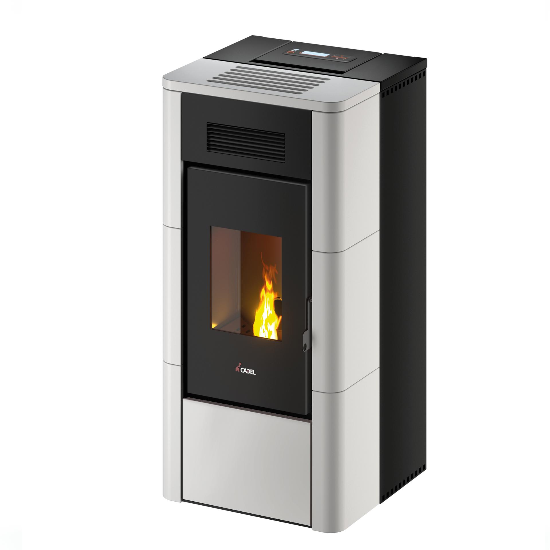 The ventilated hydro stove, with a minimalist chic look, with metal cladding that integrates majolica elements. It is equipped with a Go Fast ceramic spark plug, a self-cleaning brazier and a new 5-star combustion chamber.