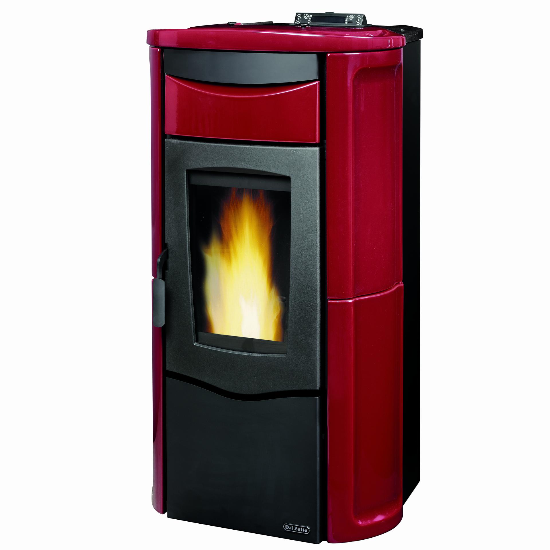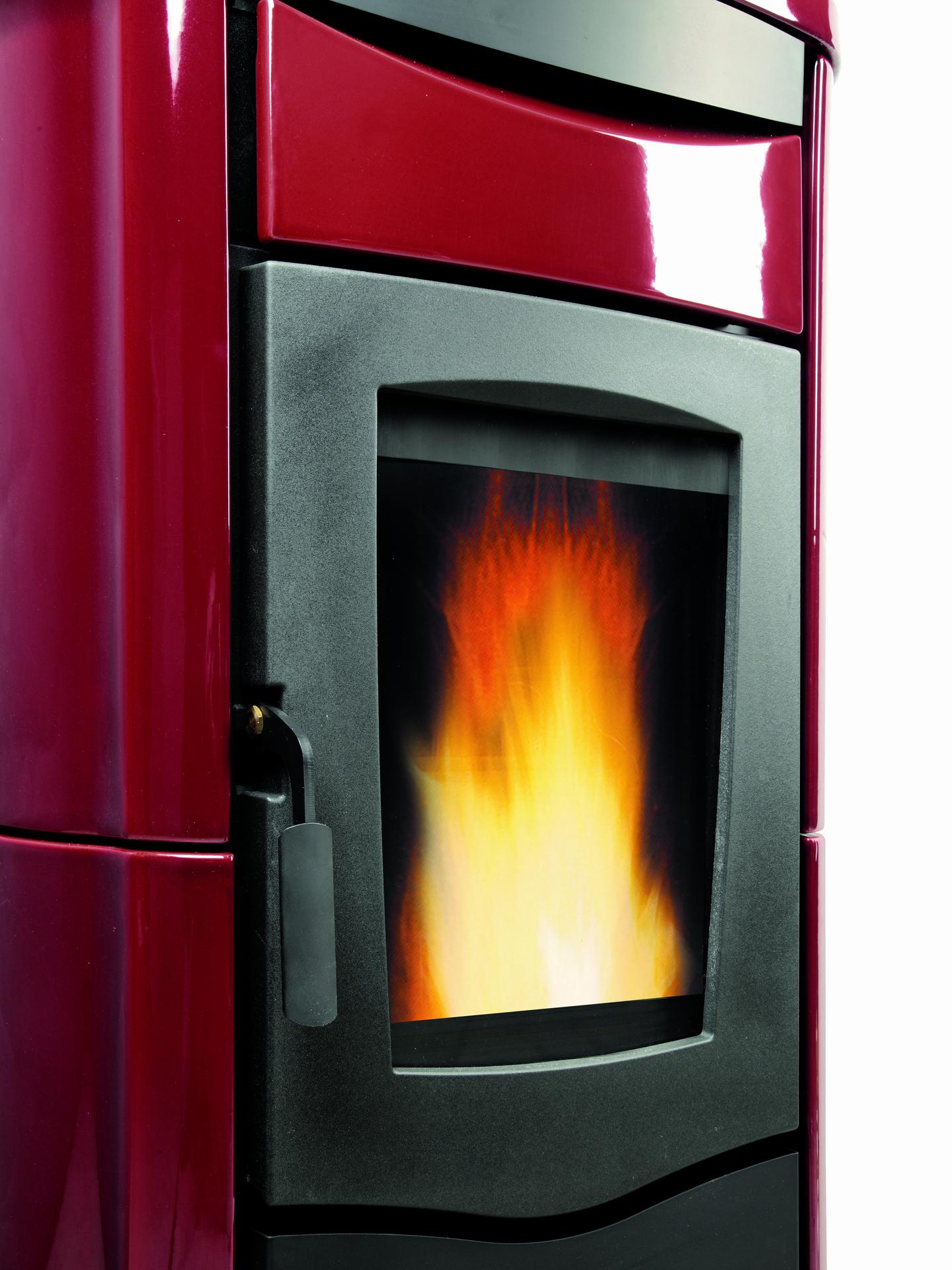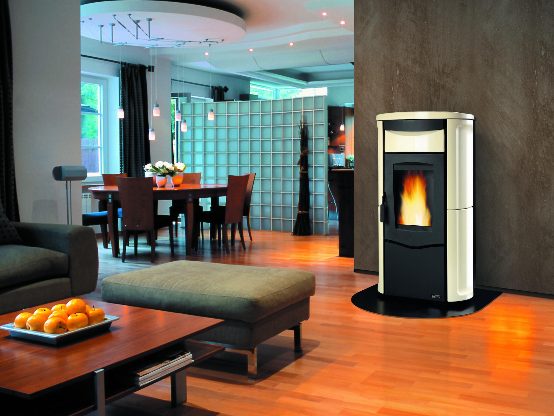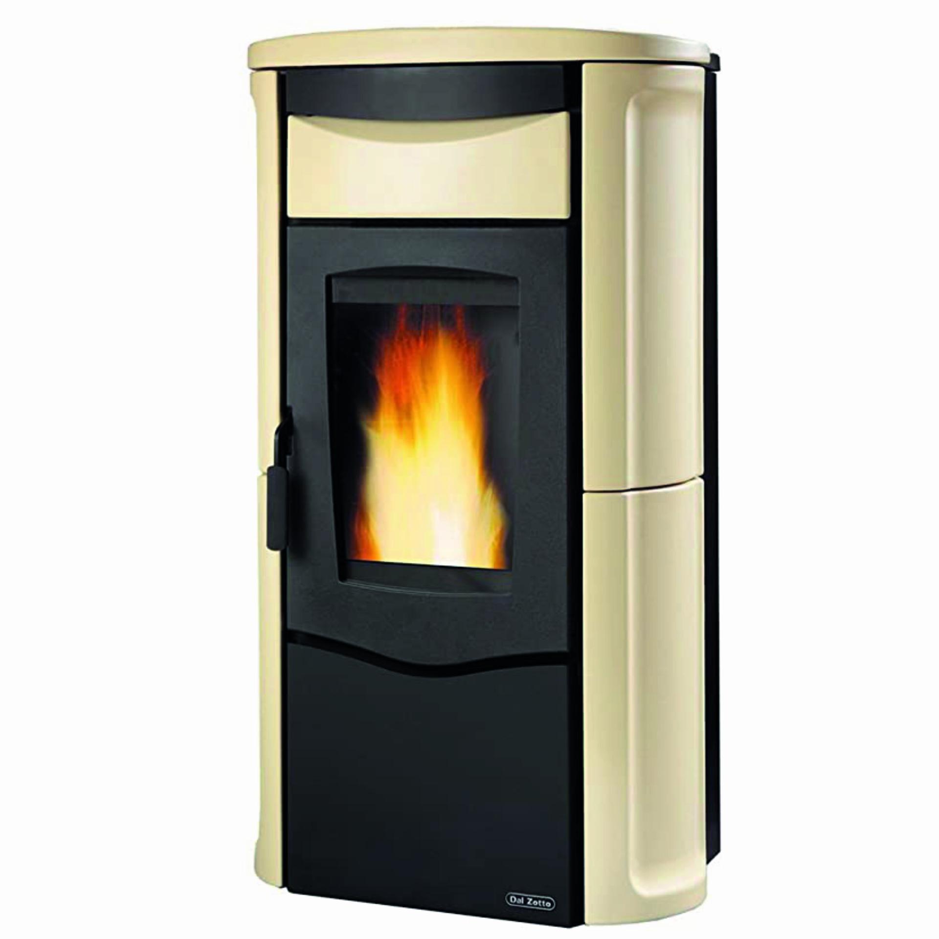 Pellet thermo stove with majolica external facing. Weekly remote control and thermostat. Excludible frontal ventilation. Circulation pump and expansion tank.