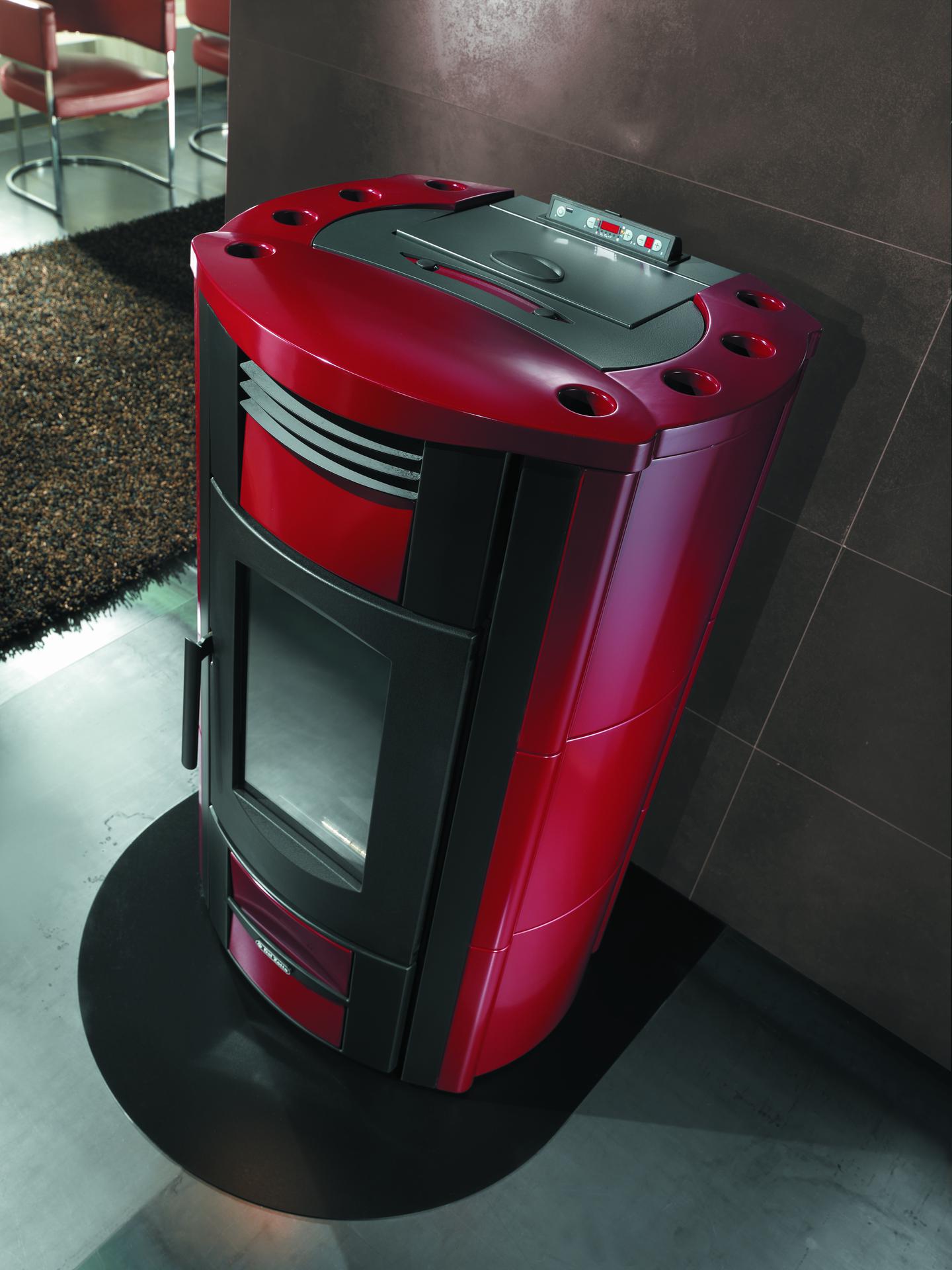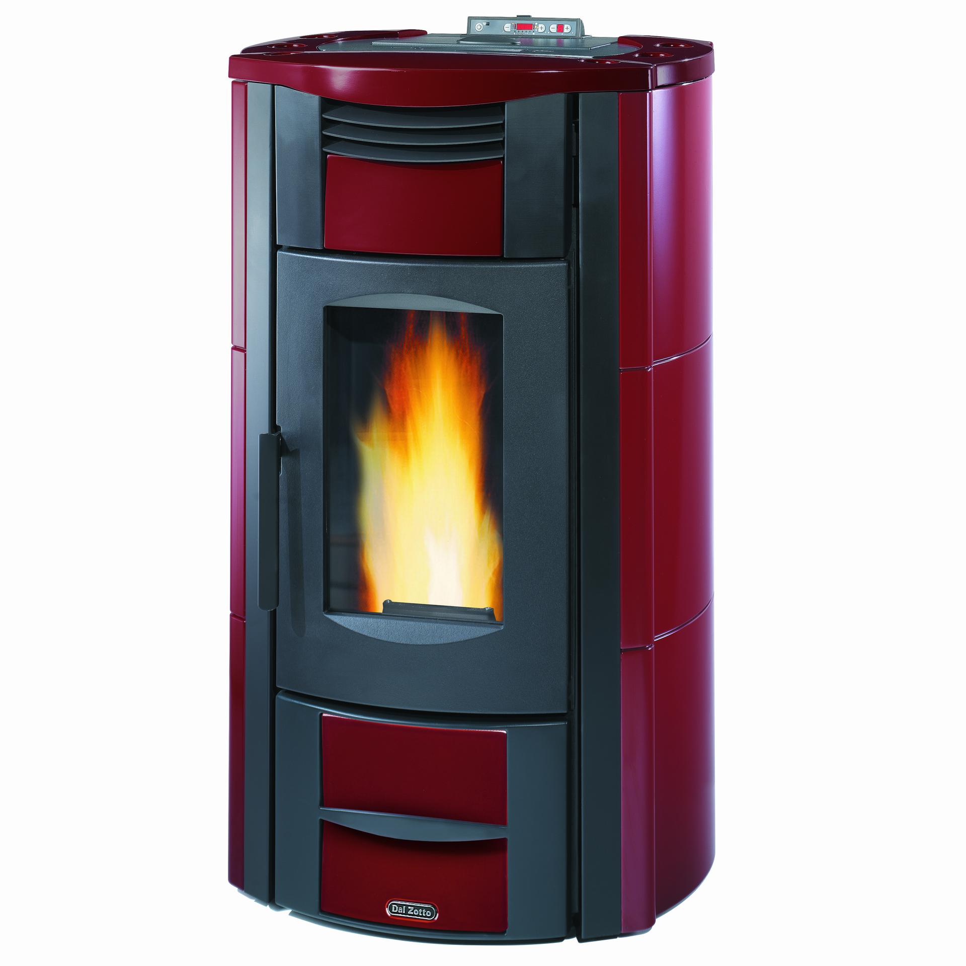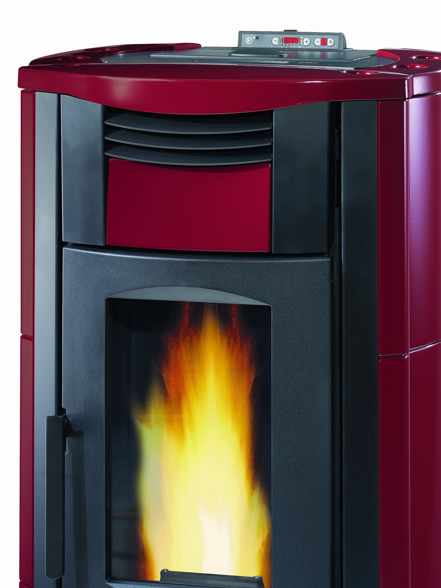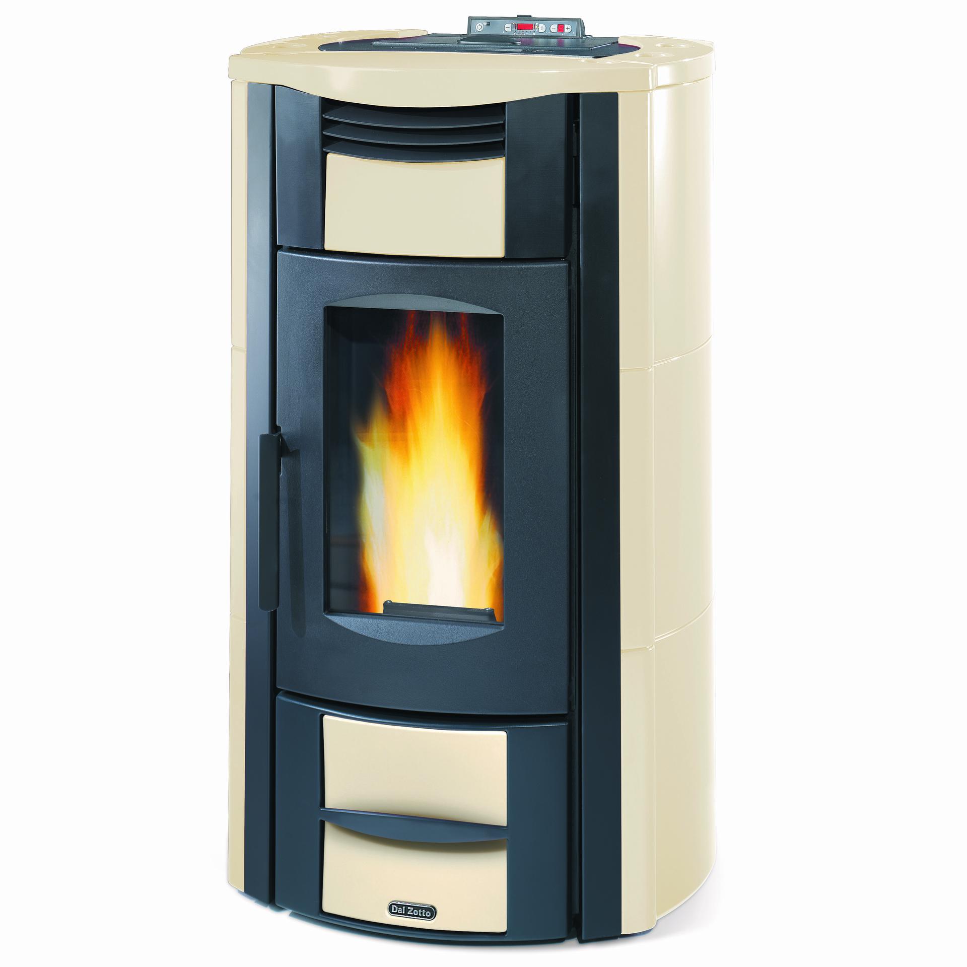Pellet thermo stove with majolica external facing. Weekly remote control and thermostat. Excludible frontal ventilation. Circulation pump and expansion tank.