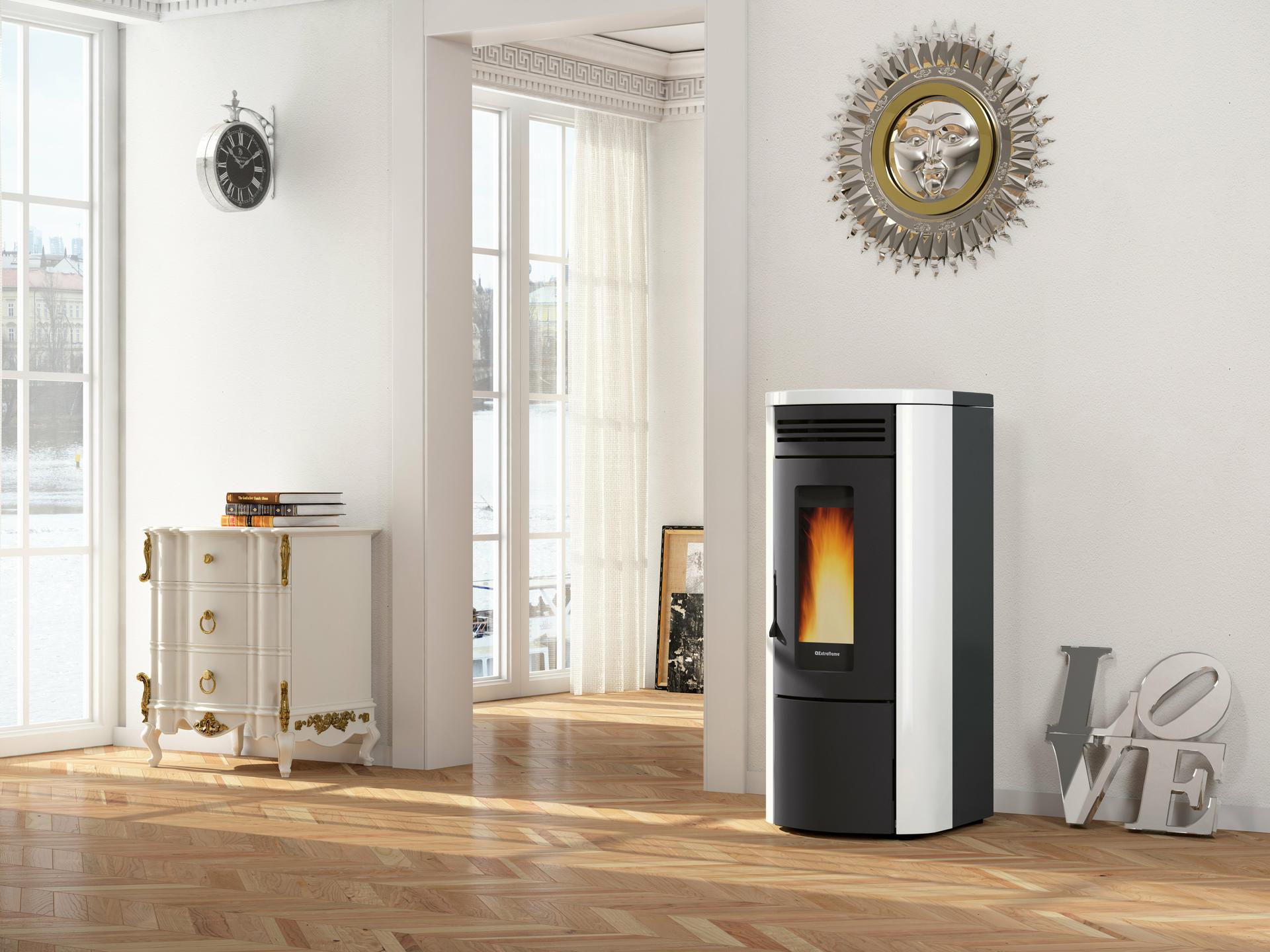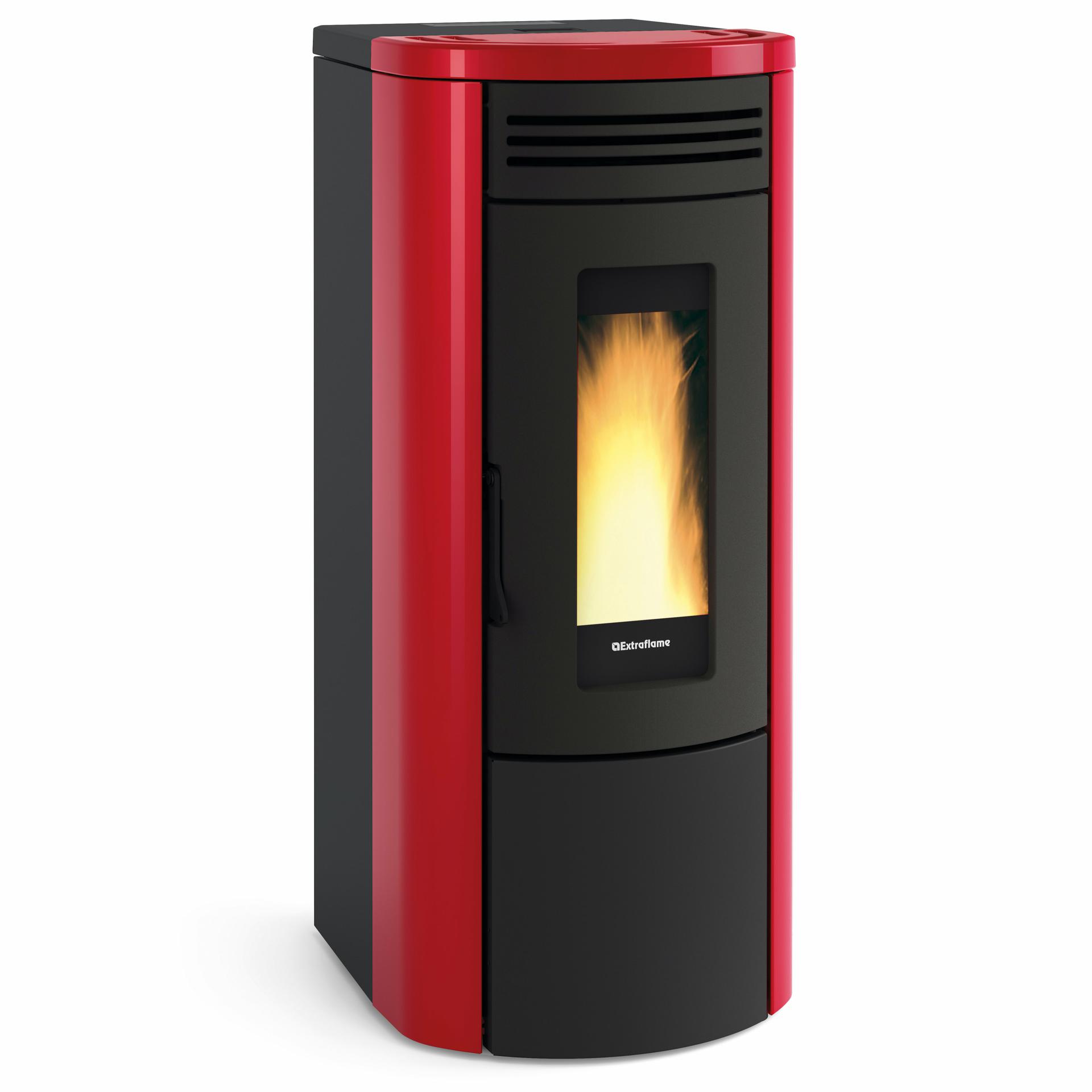 Hermetic and ventilated pellet thermo-stove with high temperature painted steel covering and majolica top cover. Front room ventilation with dedicated motor, excludable.