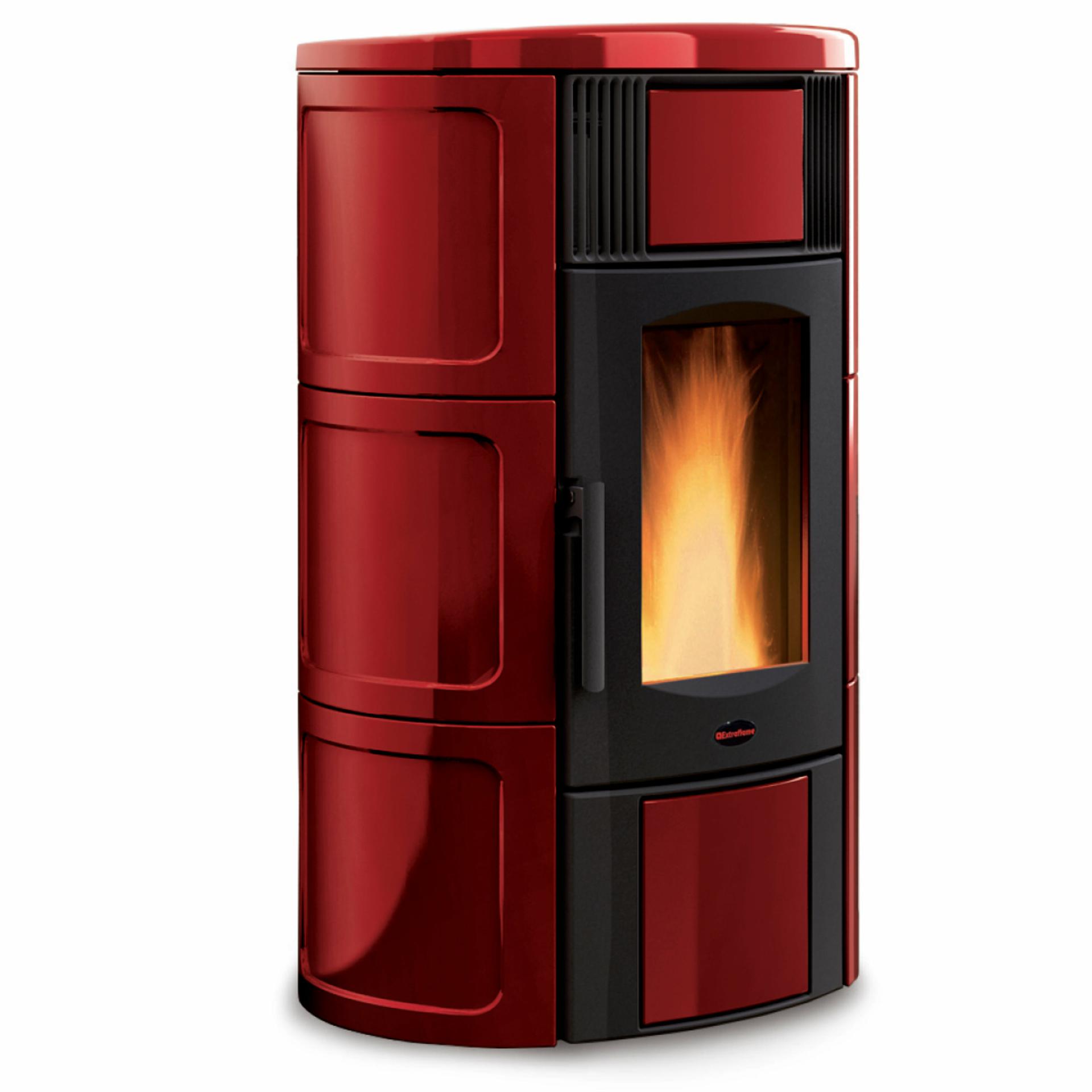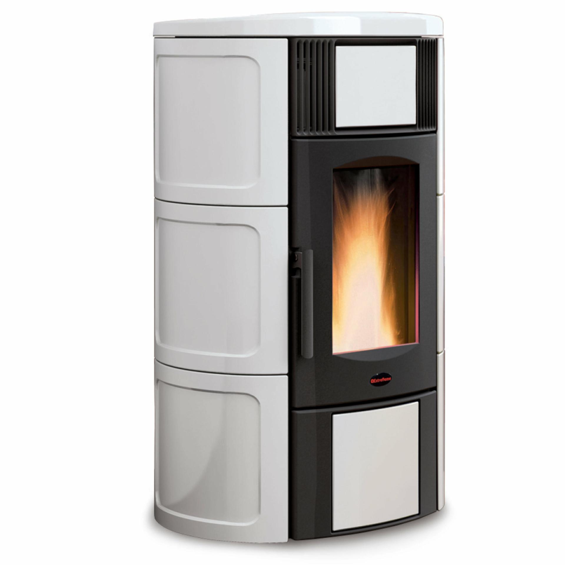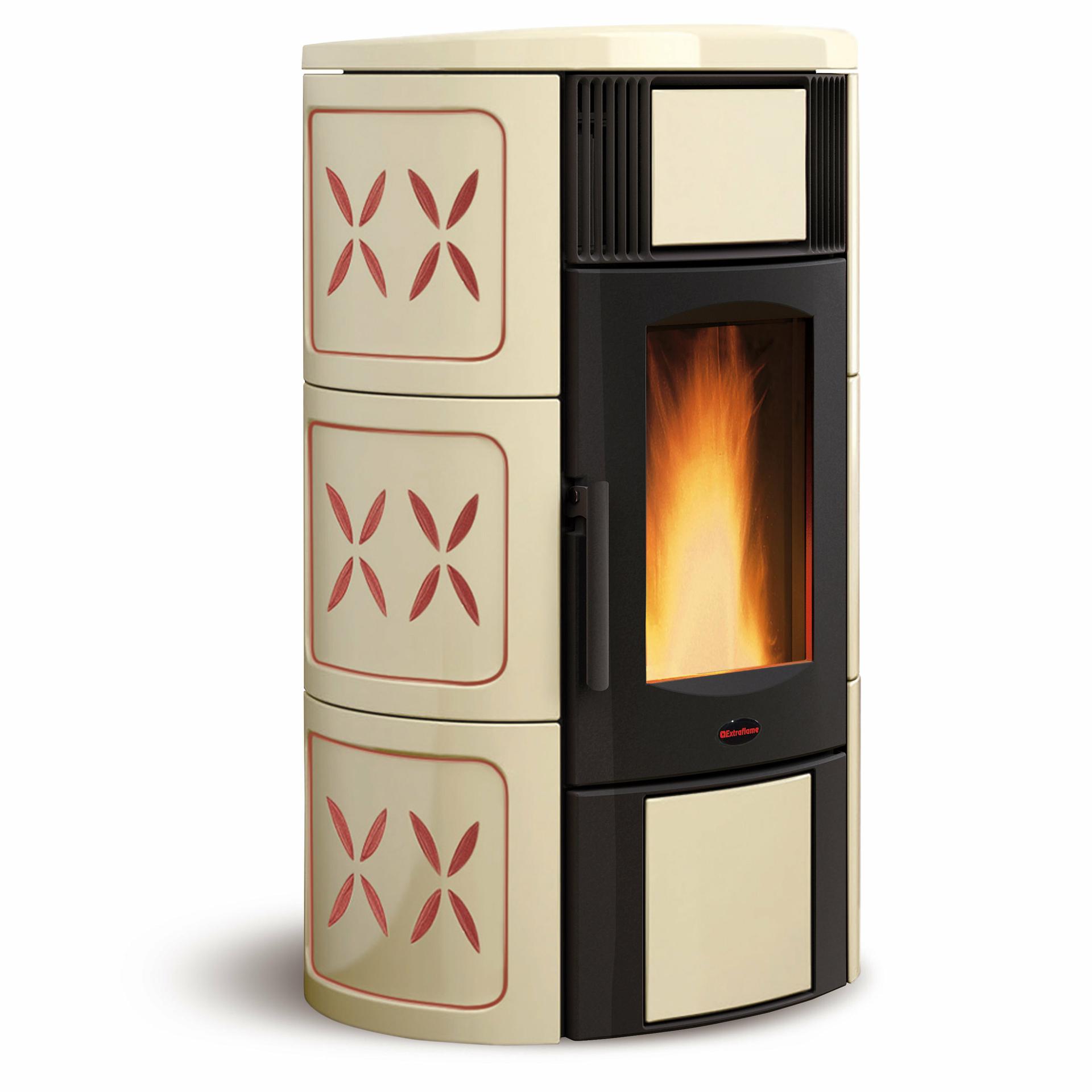 Ventilated pellet thermo-stove with external facing in majolica and wide fire vision. Front room ventilation with dedicated motor, excludable.