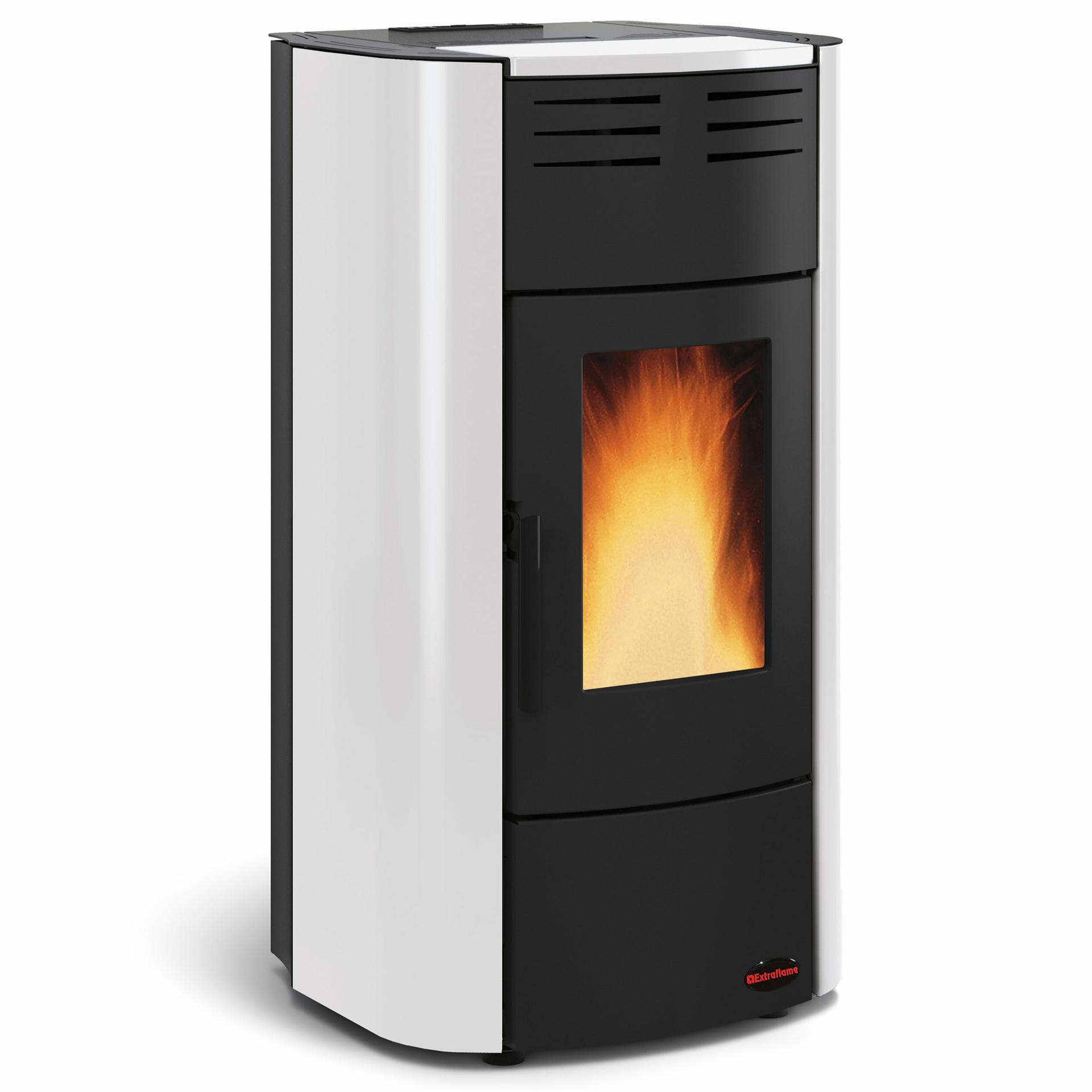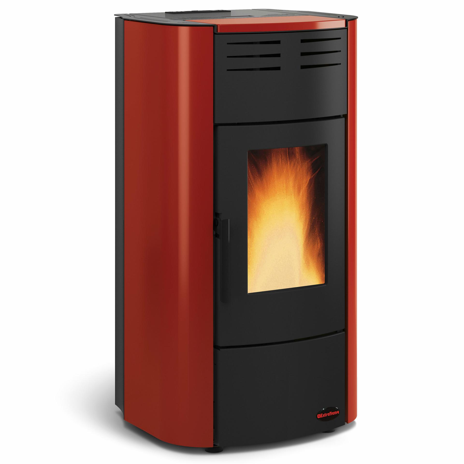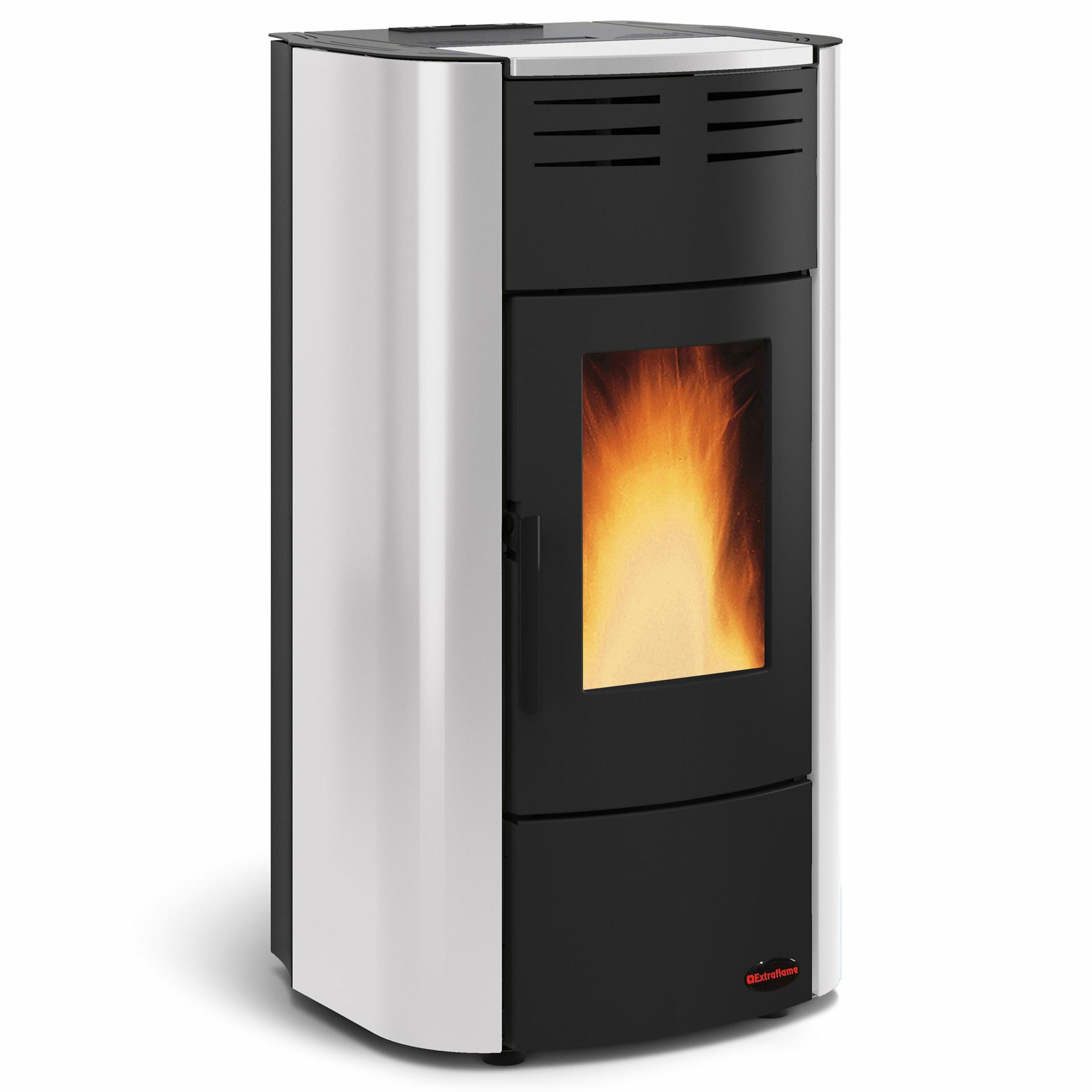 Ventilated pellet thermo-stove with high temperature painted steel covering and wide fire vision. Innovative adaptive system to adjust and even the combustion air inlet. Hermetic tank. Front room ventilation with dedicated motor, excludable.