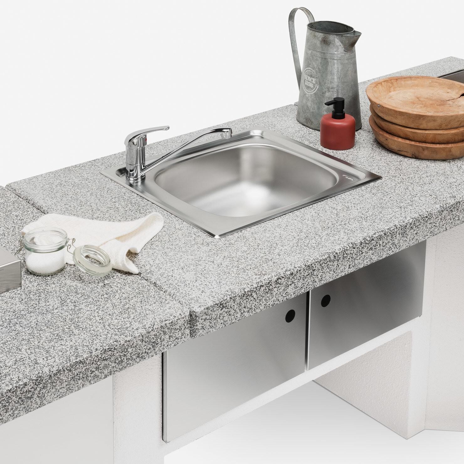 Provided with a stainless steel sink and an integrated mixer tap, the module has a base with a back panel and a practical shelf.