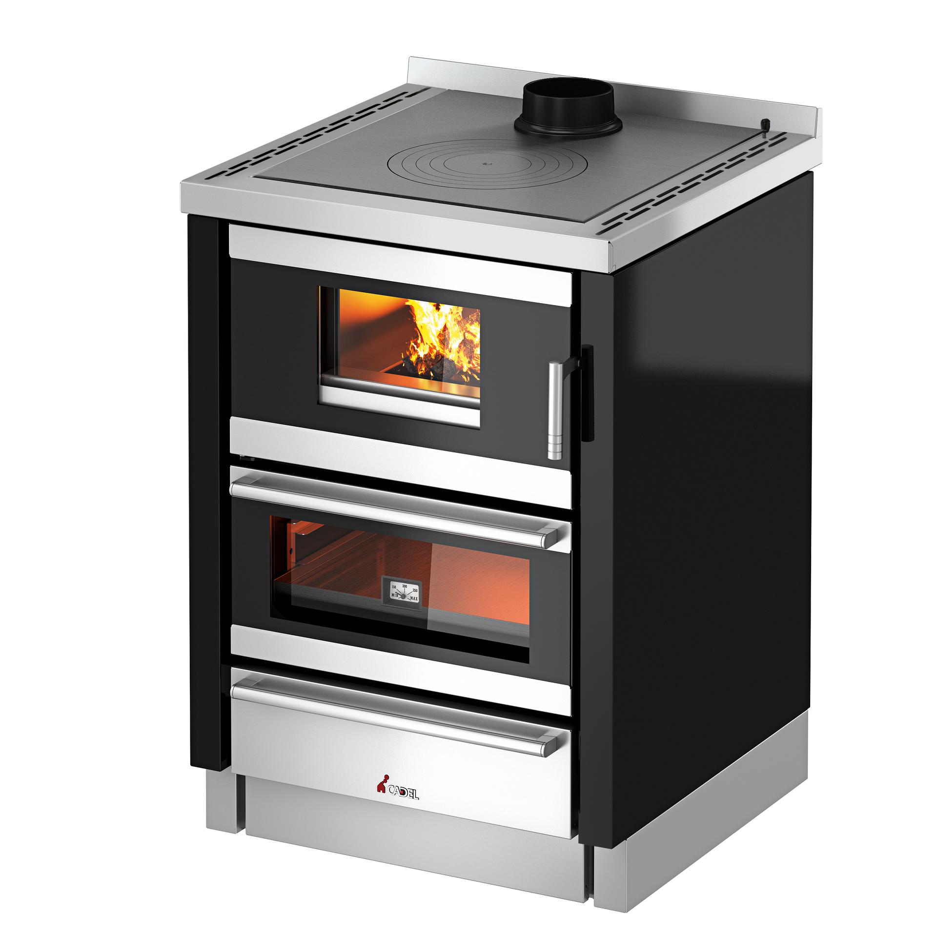 The striking element of this fitted wood cooker is the space devoted to the oven, the wide glass through which you can see the food cooking and the wide firebox, so you can have everything under control. The big, stainless steel oven ensures food is cooked evenly and the appliance is easy to clean, while the hob made of cast iron as standard is also available in a glass ceramic version.