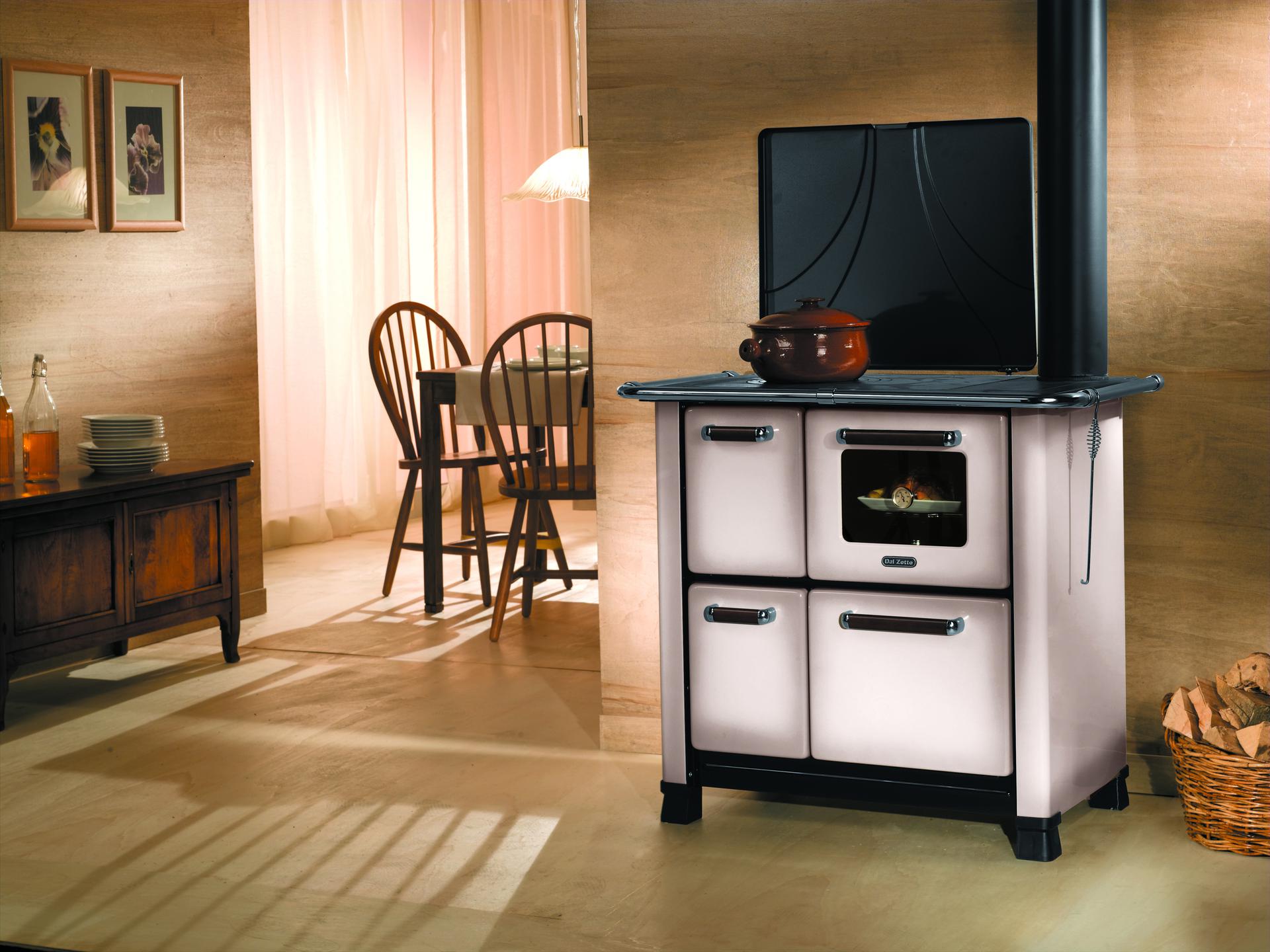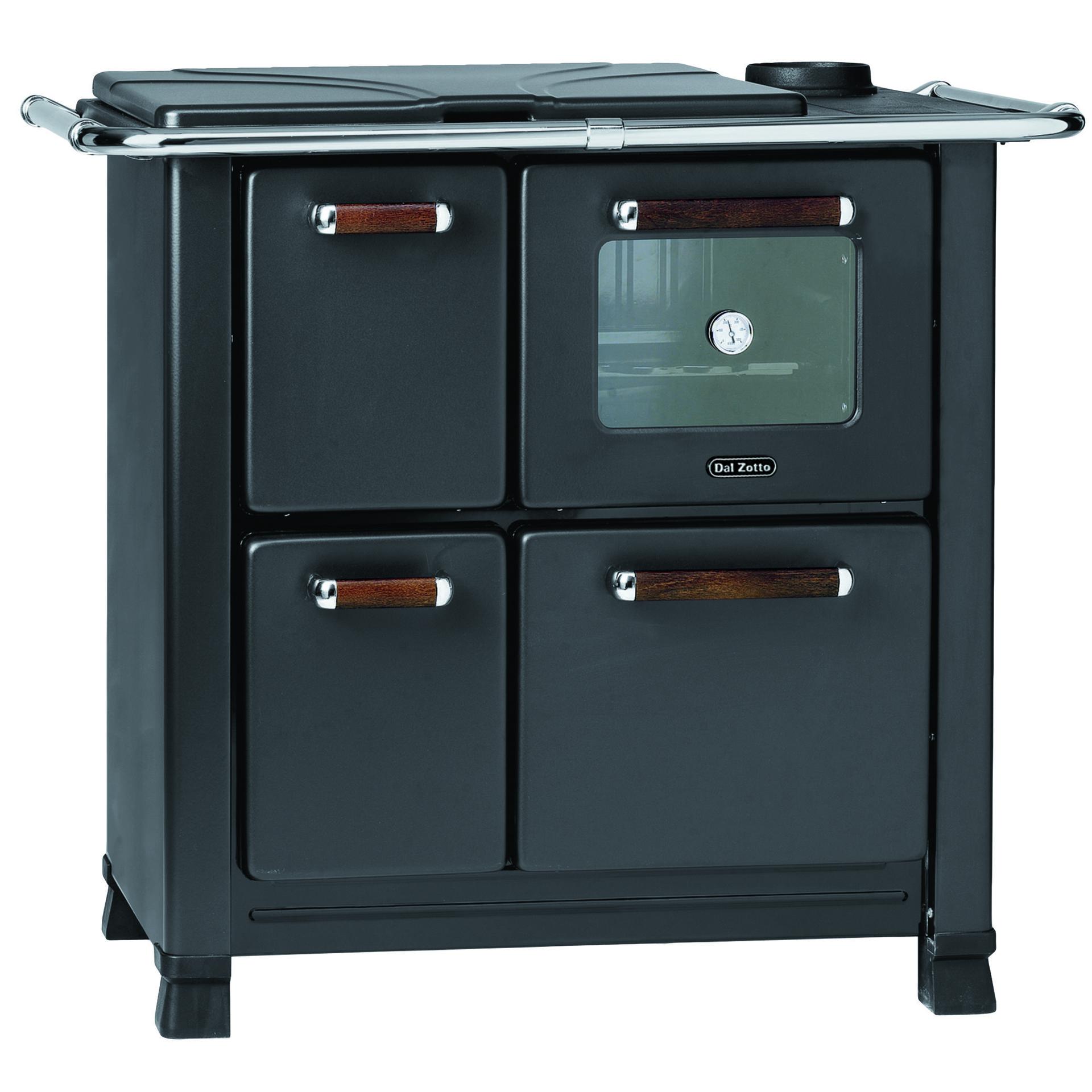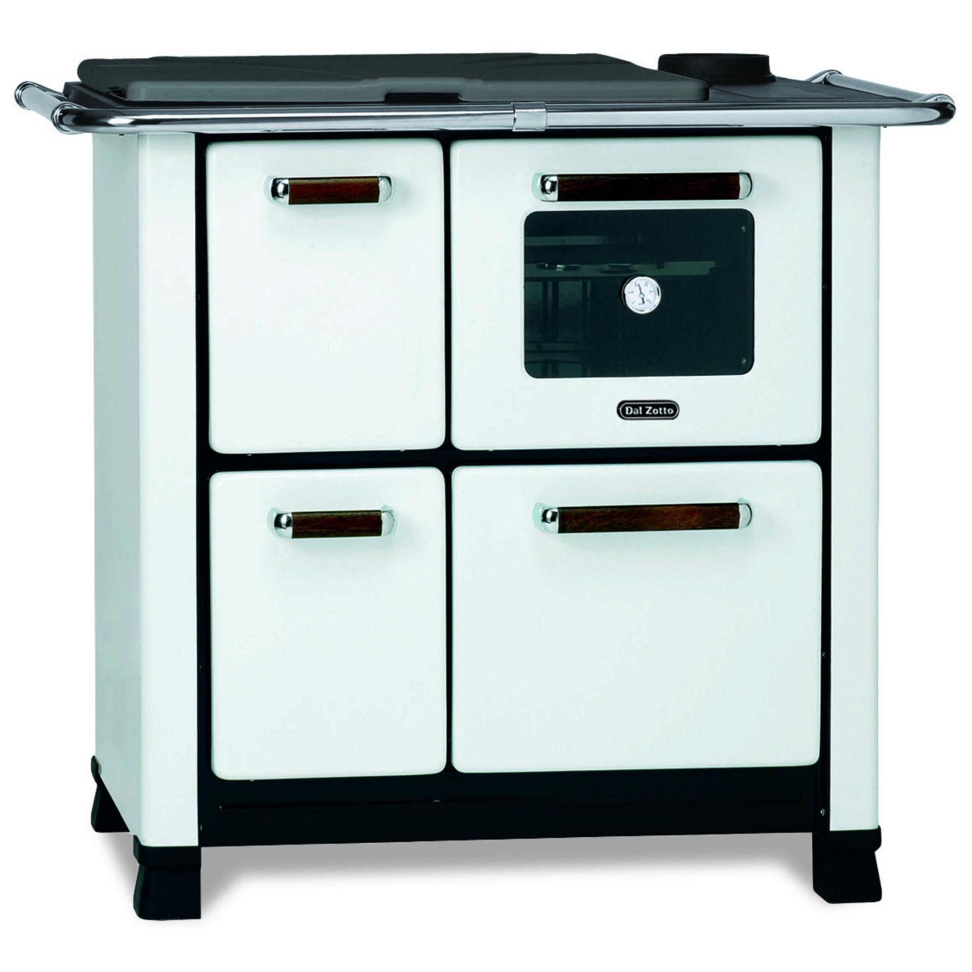 Wood cooker with porcelainized steel facing. Bulb thermometer and oven and enameled pan.