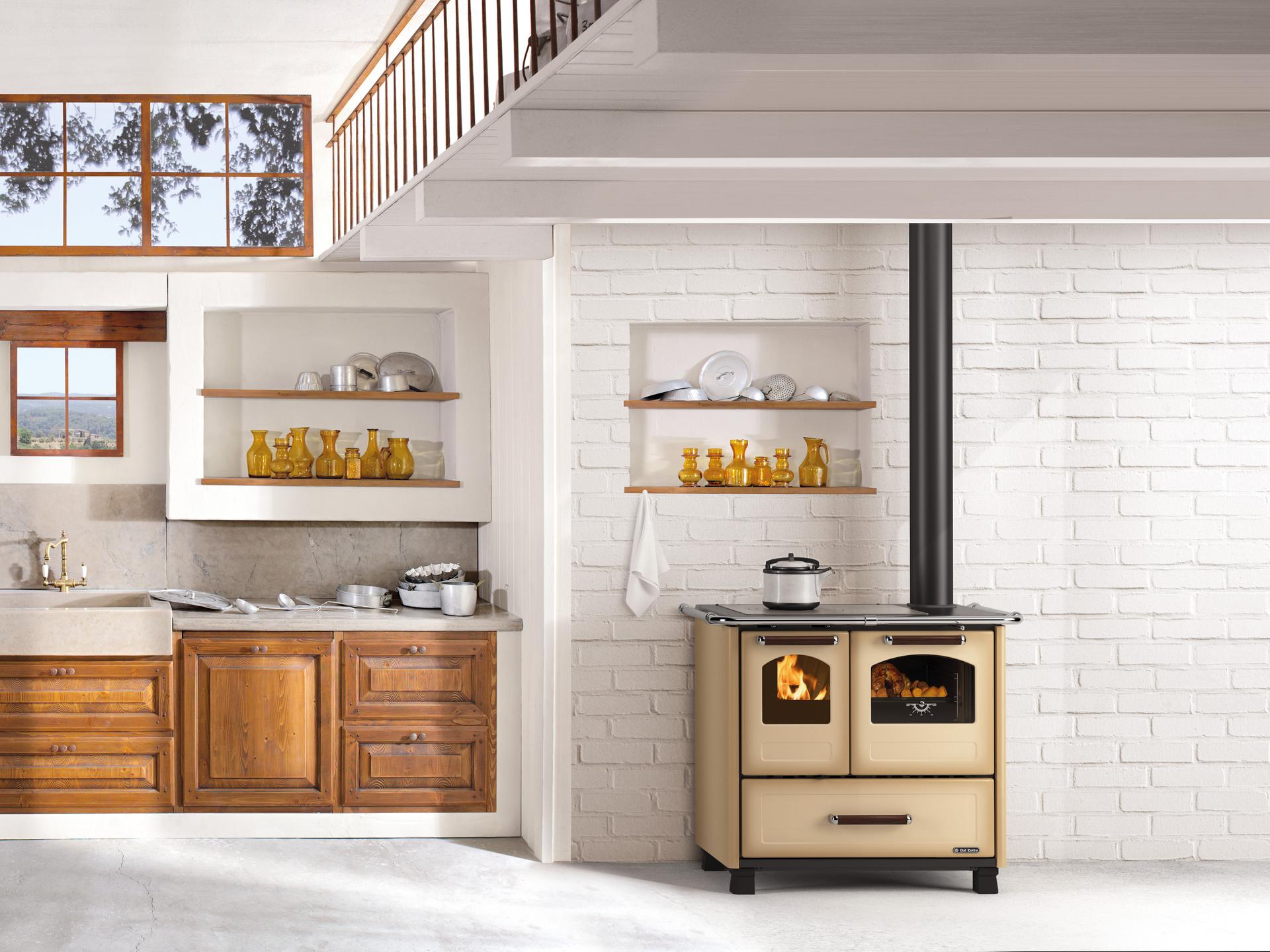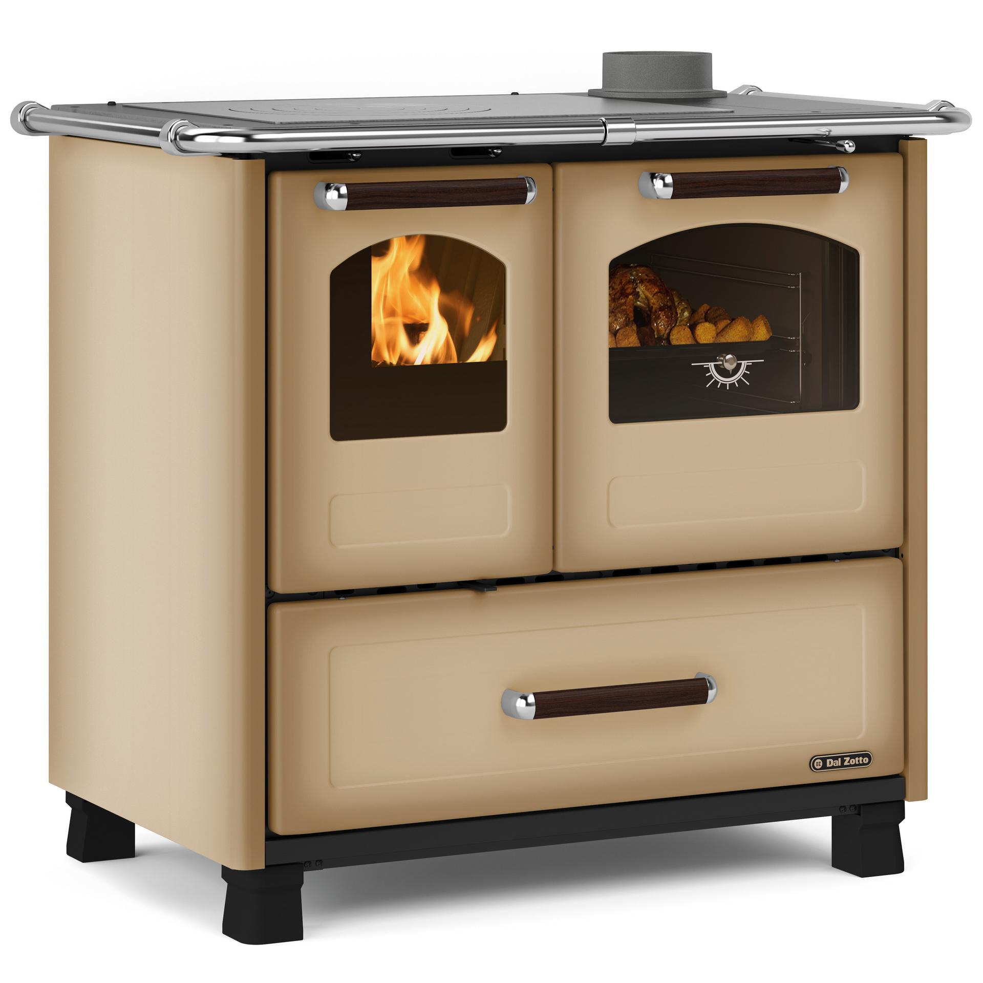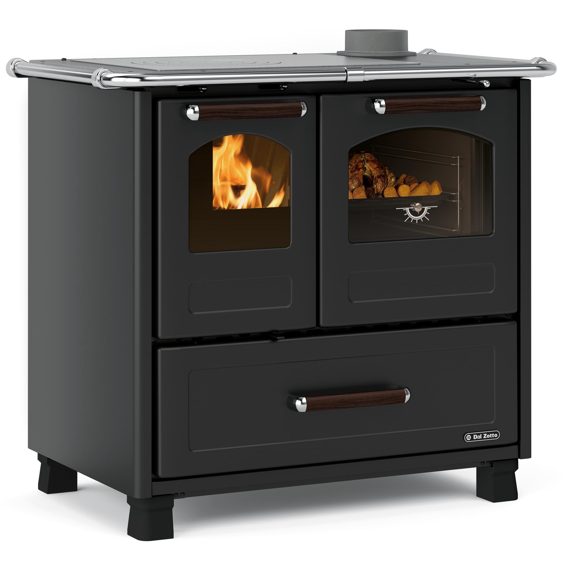 Wood cooker with enamelled steel external coating, panoramic fire door with double glass and G20 cast-iron hearth. Vitrified cast-iron frame and top with polished cast-iron circles. 41 liter enamelled oven with double glass door. Feets for easy cleaning.