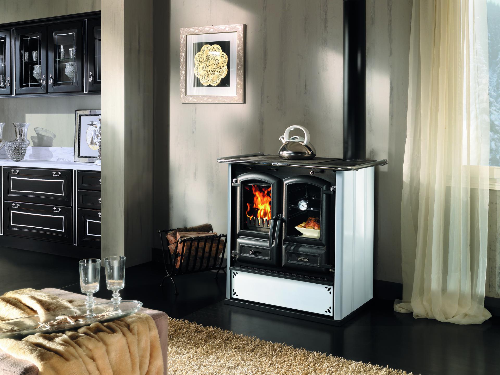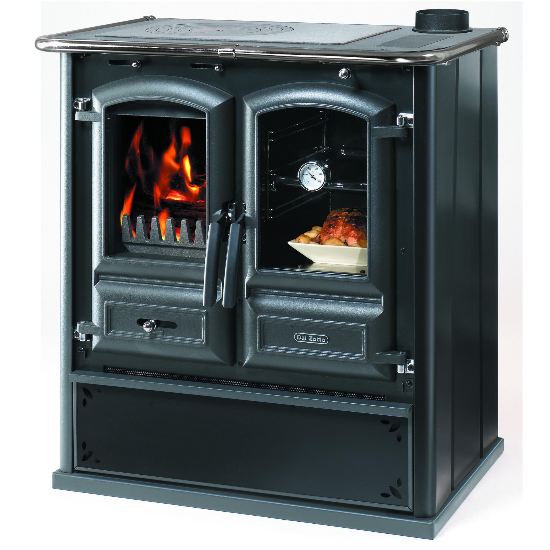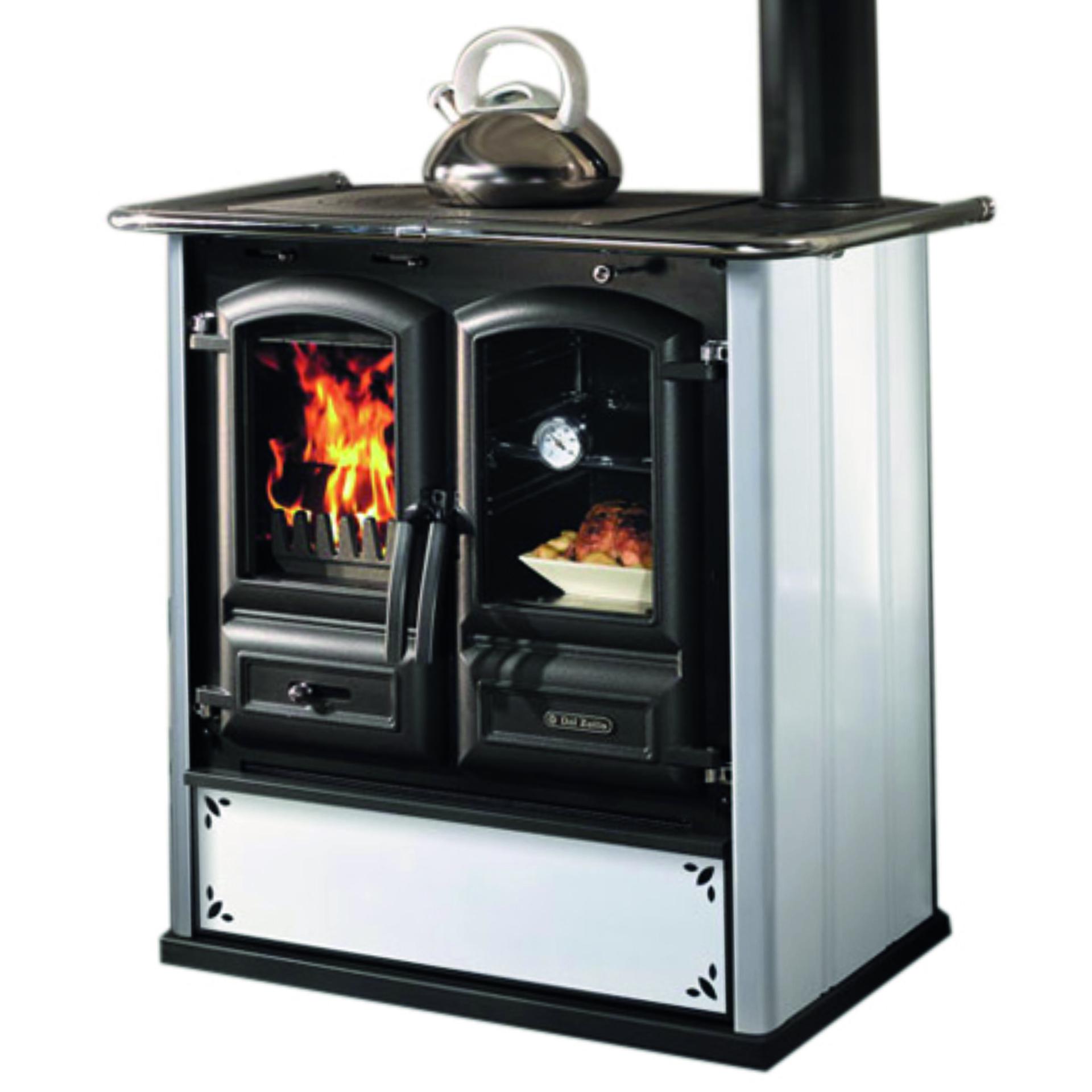 Wood cooker with steel facing. Total cast-iron big hearth with cast-iron panoramic door and ceramic glass. Panoramic oven and big wood drawer. Double thickness cast-iron plate.