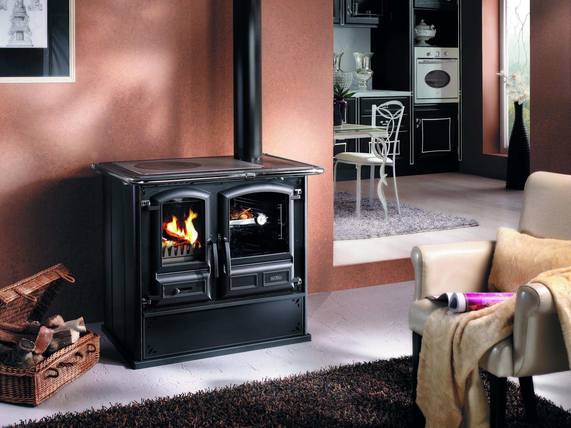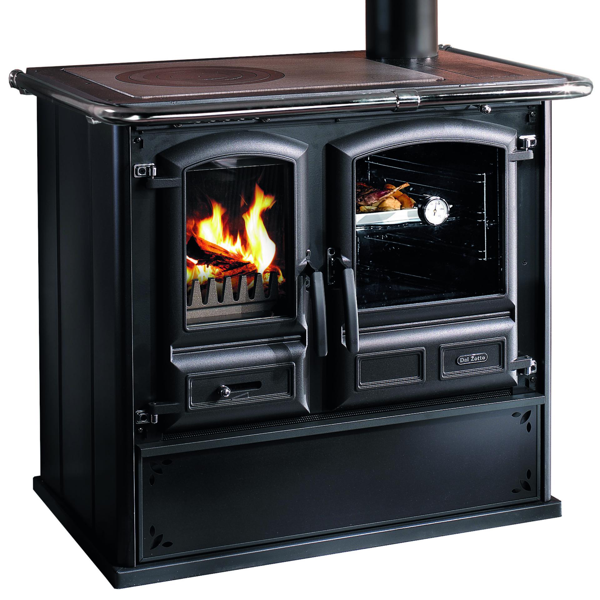 Wood burning cooker with steel facing, panoramic oven and big wood drawer. Total cast-iron big hearth with cast-iron panoramic door and ceramic glass. Double thickness cast-iron plate.