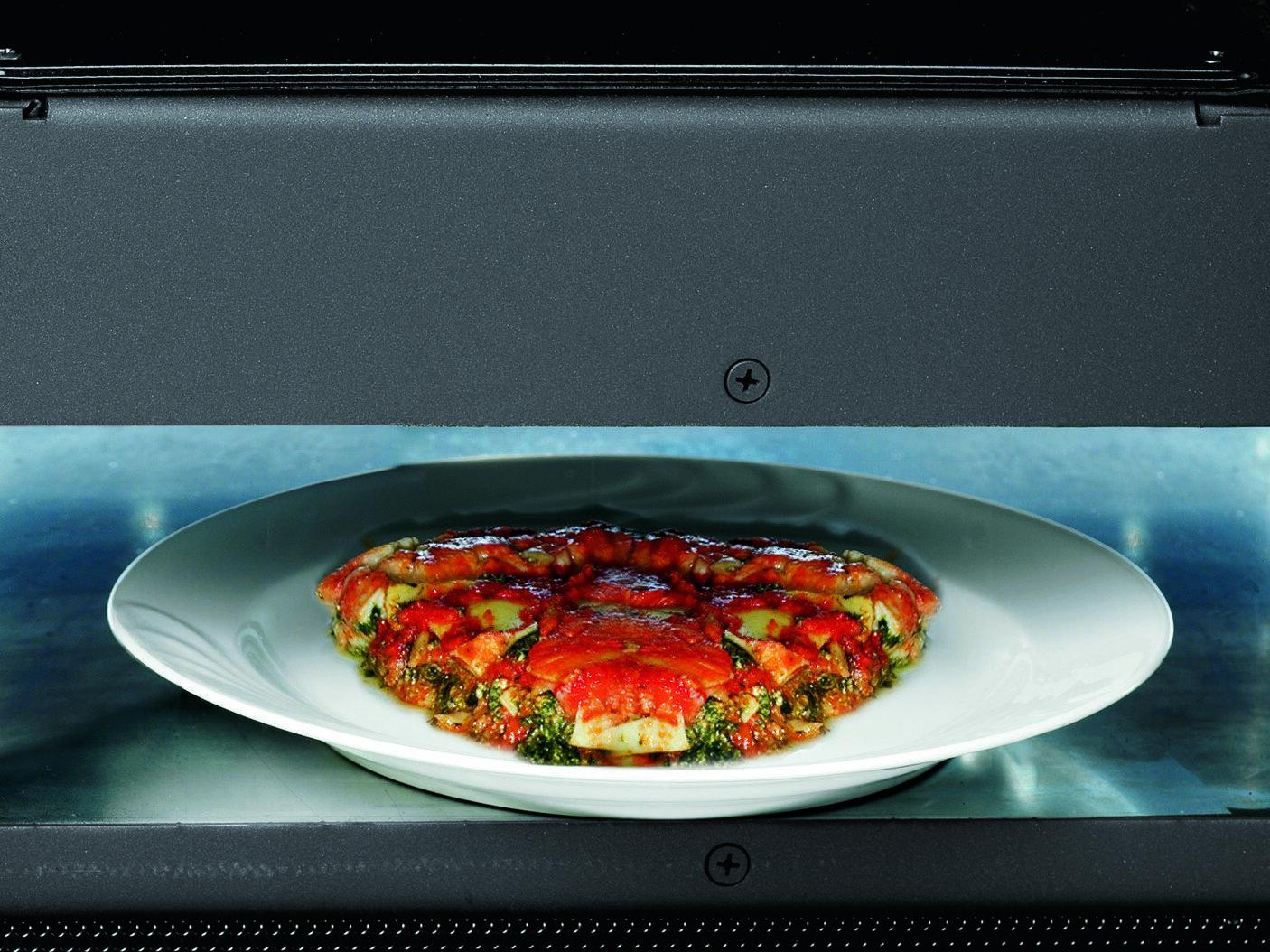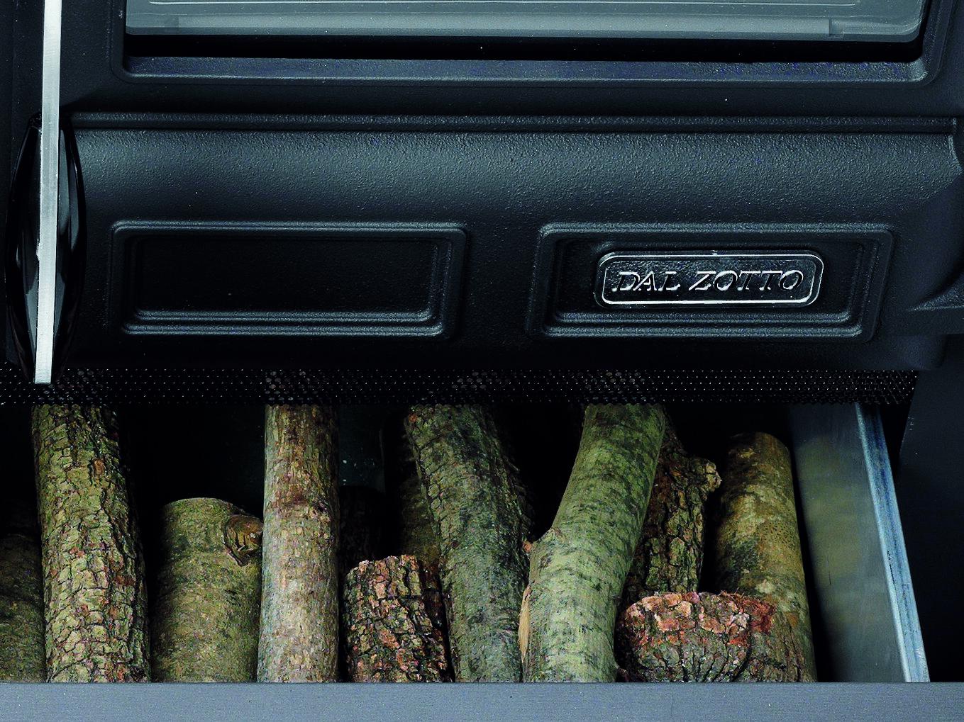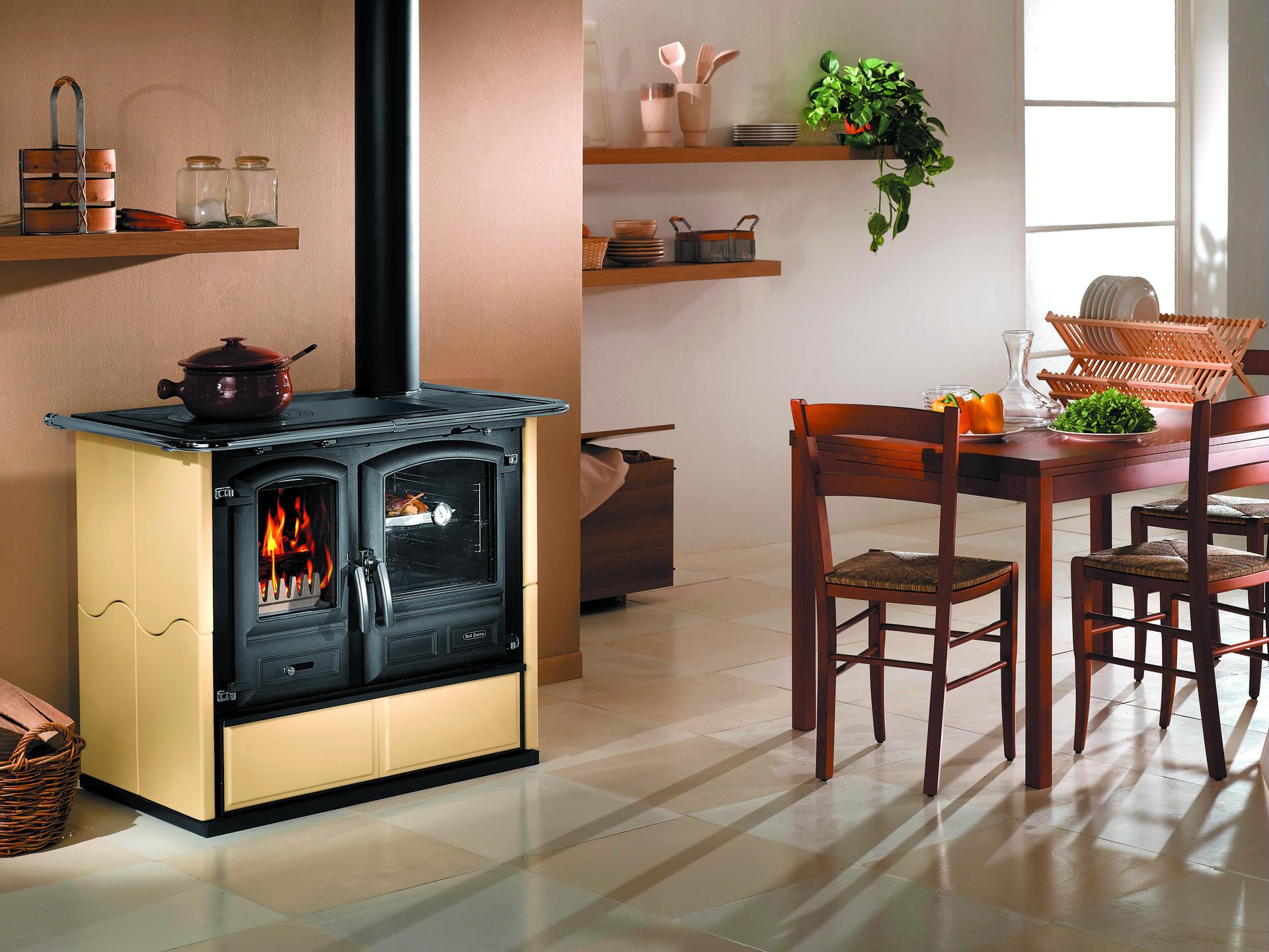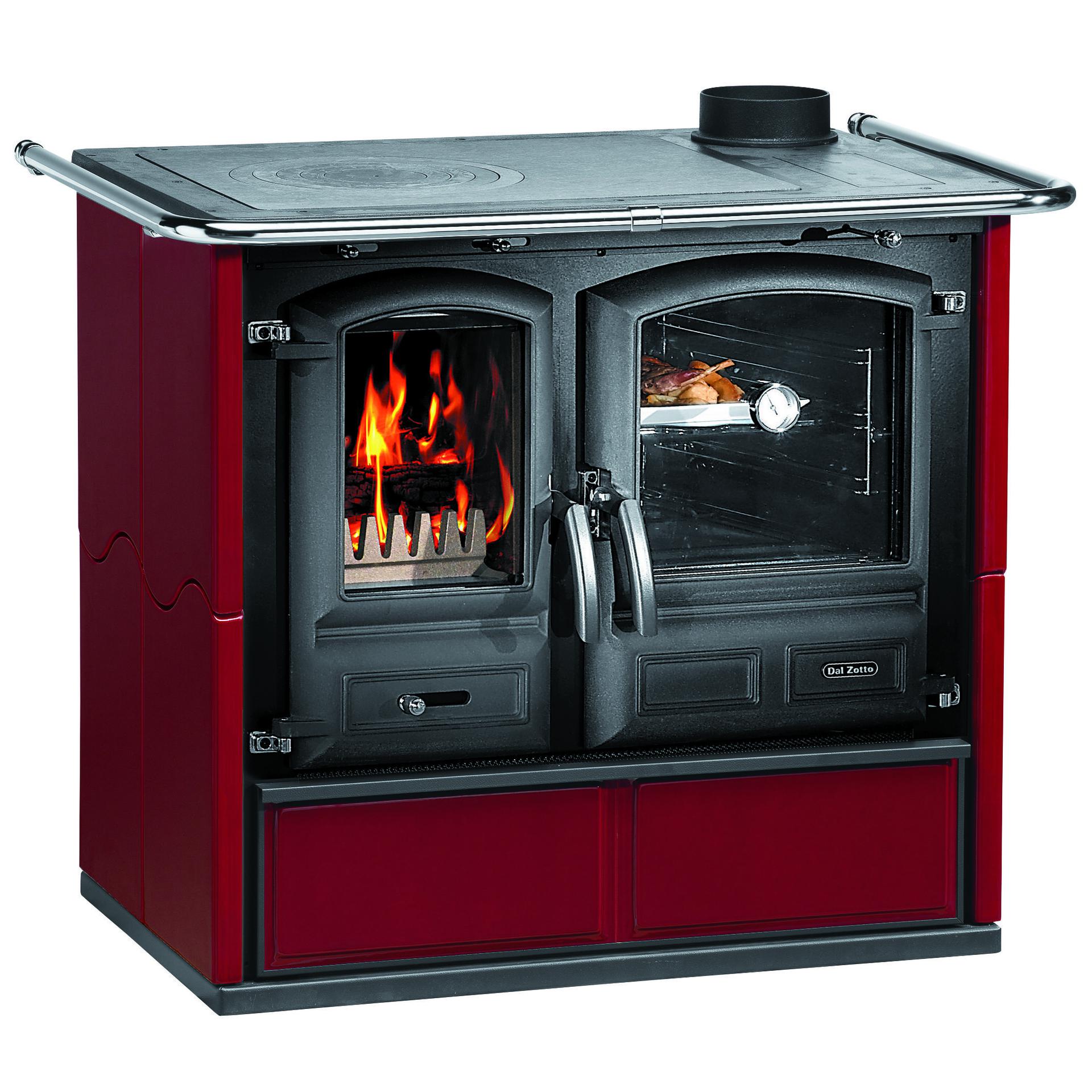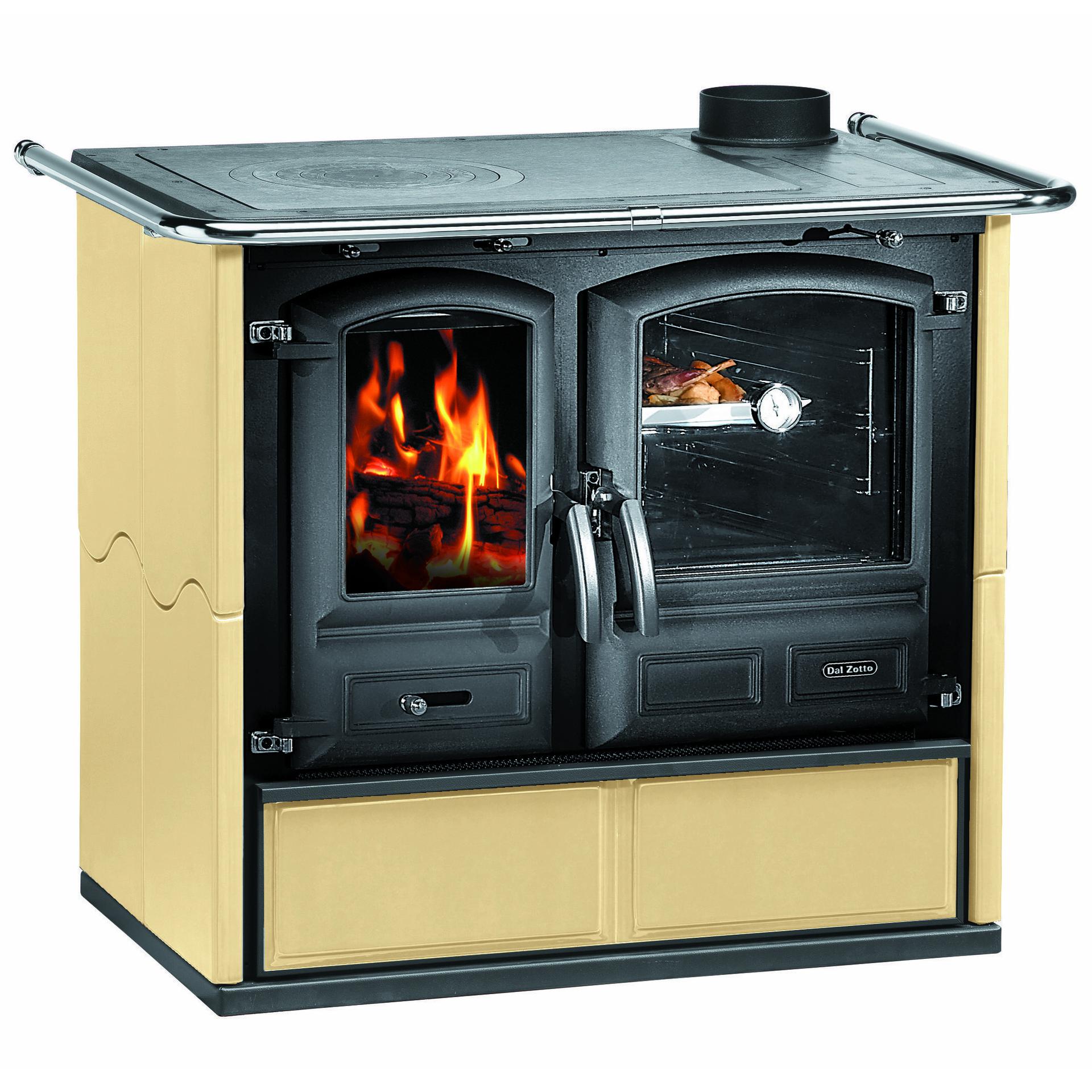 Wood burning cooker with majolica external facing, panoramic oven and big wood drawer. Total cast-iron big hearth with cast-iron panoramic door and ceramic glass. Double thickness cast-iron plate. Primary and secondary air and double combustion.