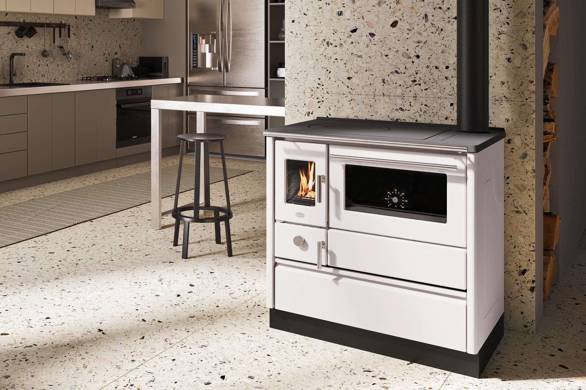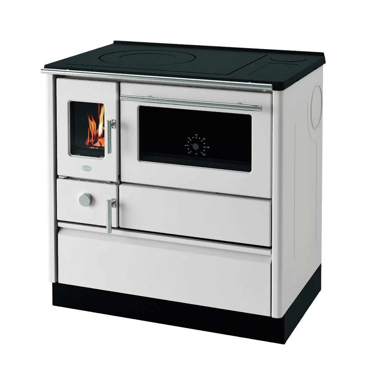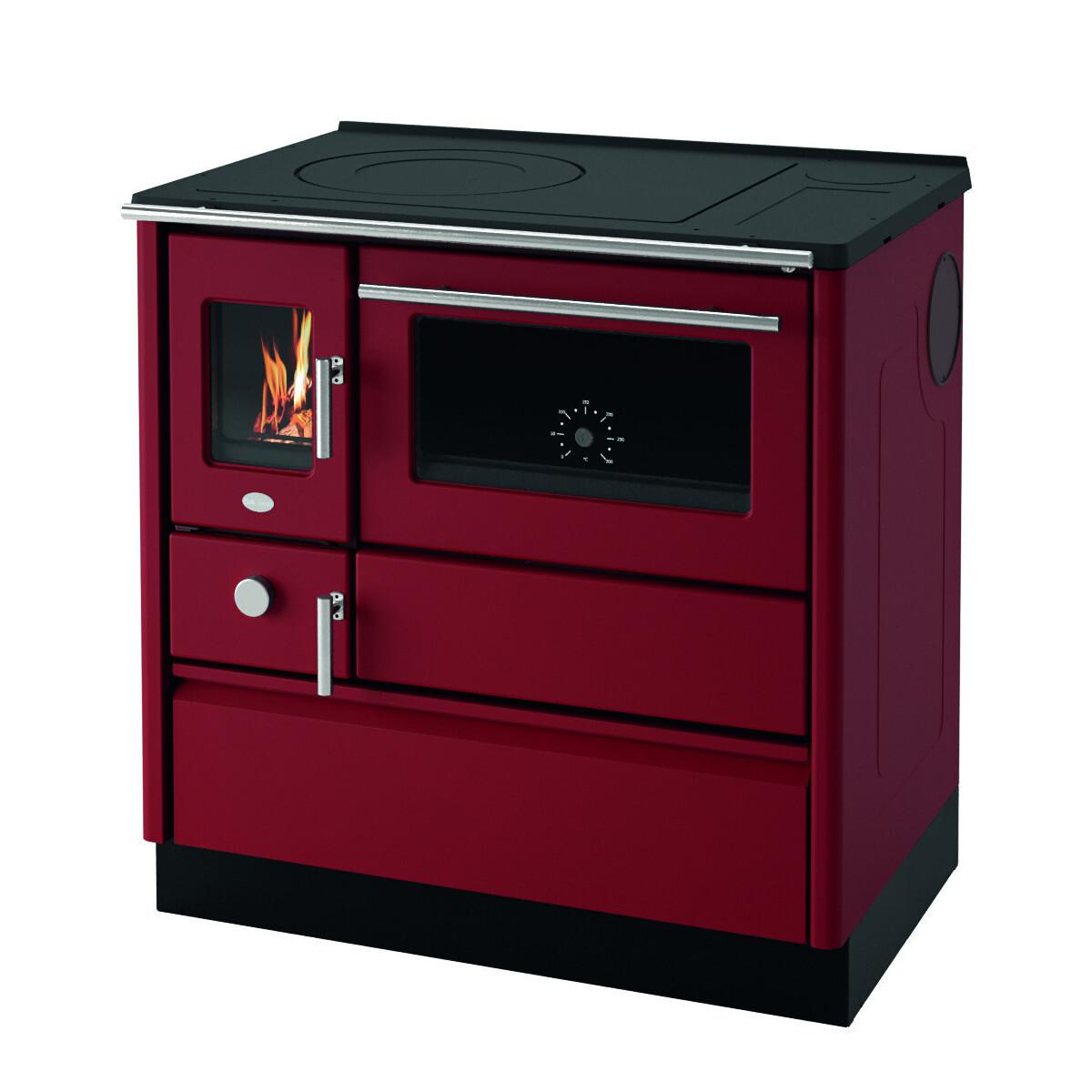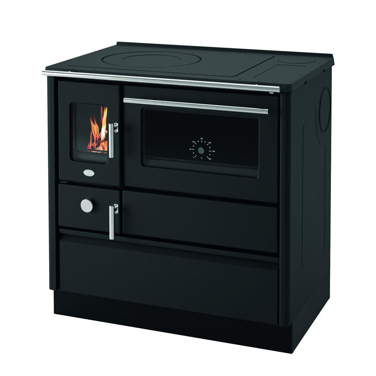 Wood-burning cooker with cast iron combustion chamber. Steel casing with tray and double-glazed door. Removable ash drawer for ash collection in a separate compartment. Top right and side right flue connections.