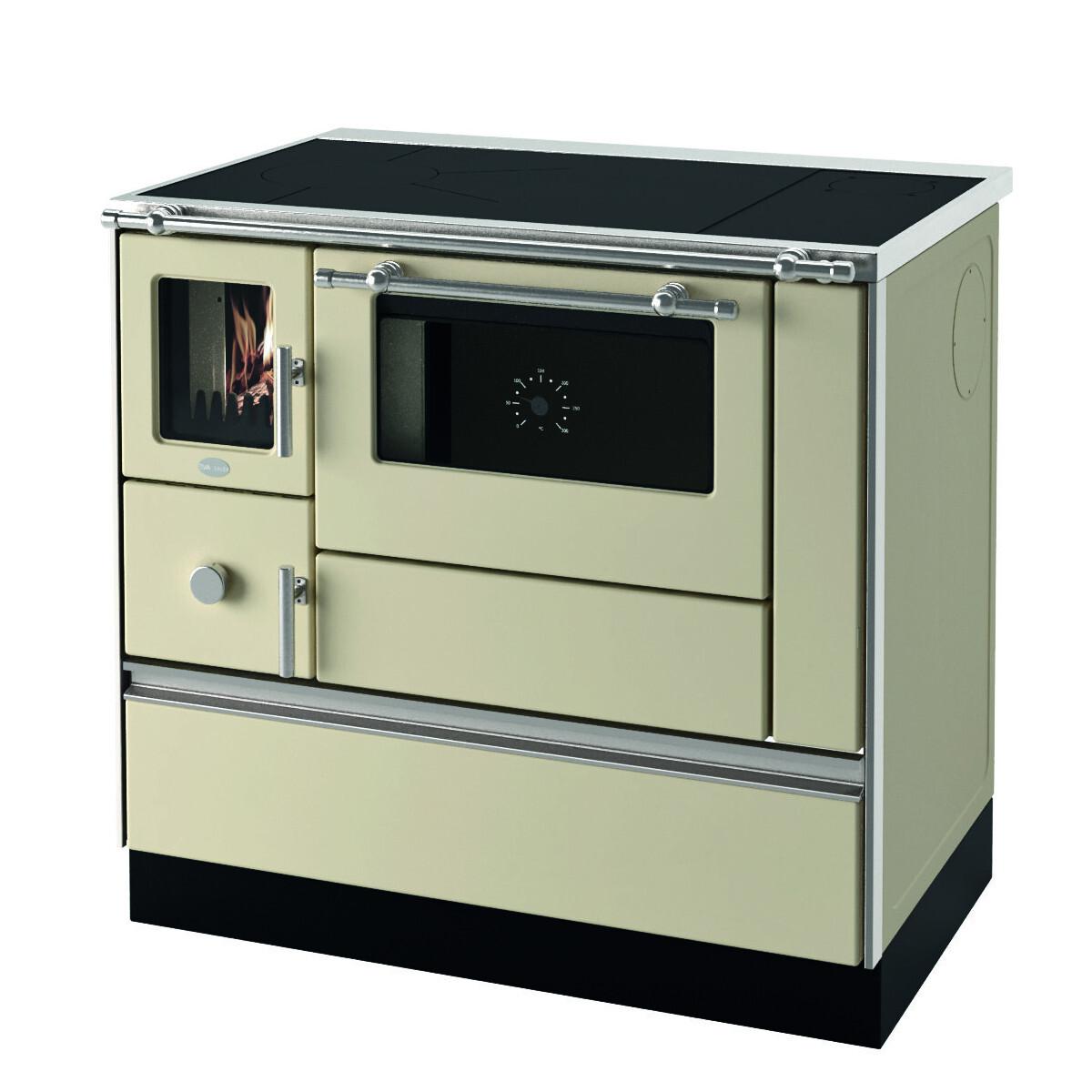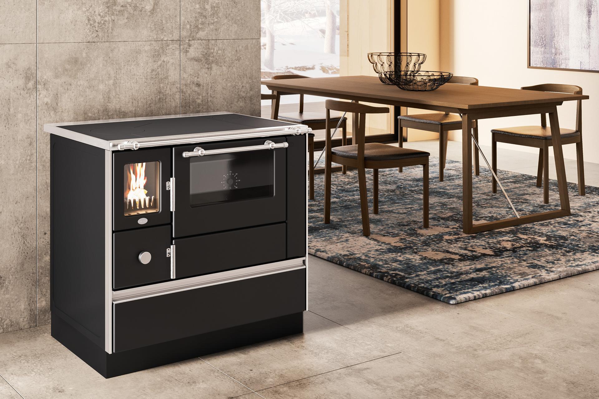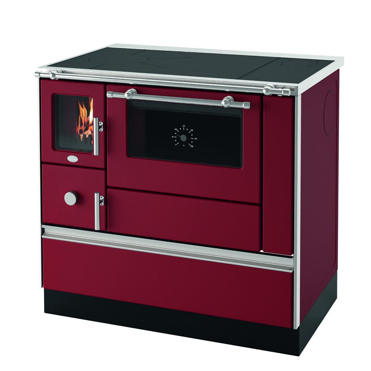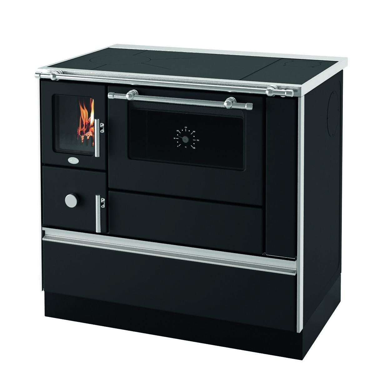 Wood-burning stove with a combustion chamber made of refractory stone. Steel casing with tray and double-glazed door. Removable ash drawer for ash collection in a separate compartment. Top right, side right and rear right flue connections.