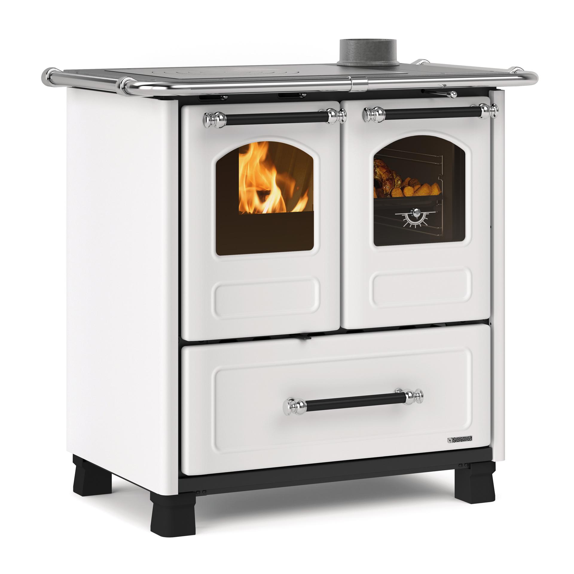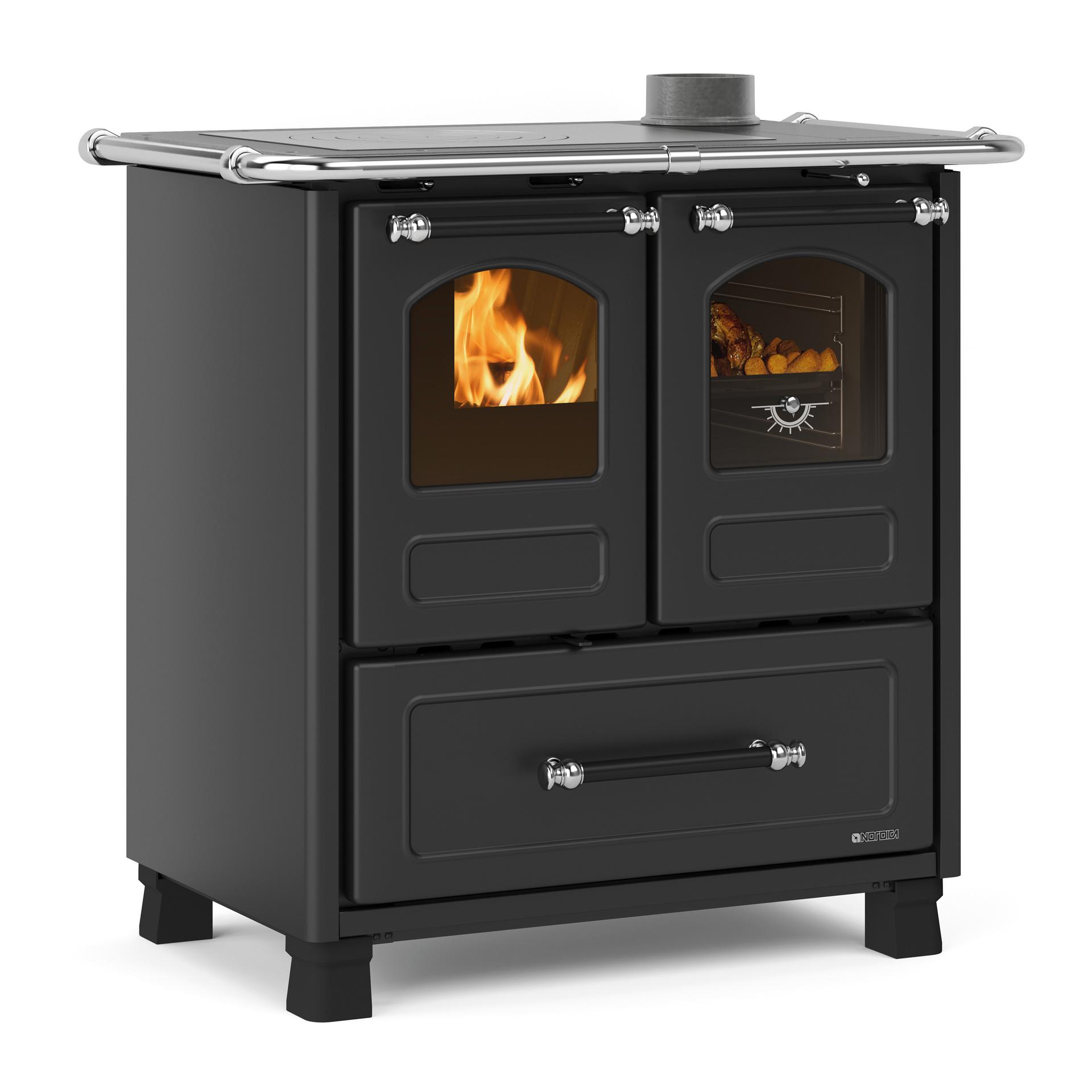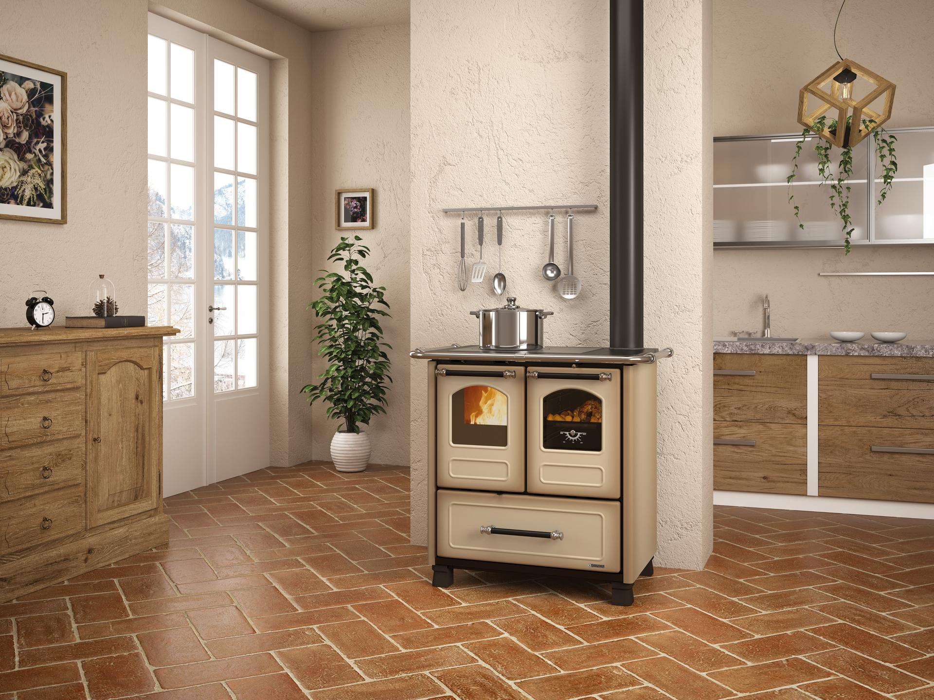 Traditional wood cooker with feet for easy cleaning. Enameled cast iron facade and frame. Internal facing of the hearth in cast iron with the extractable ash drawer. Fire door in cast iron with double glass, where the internal glass is ceramic.