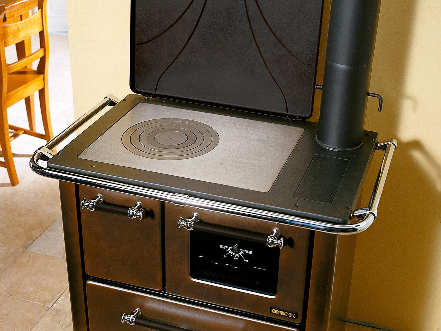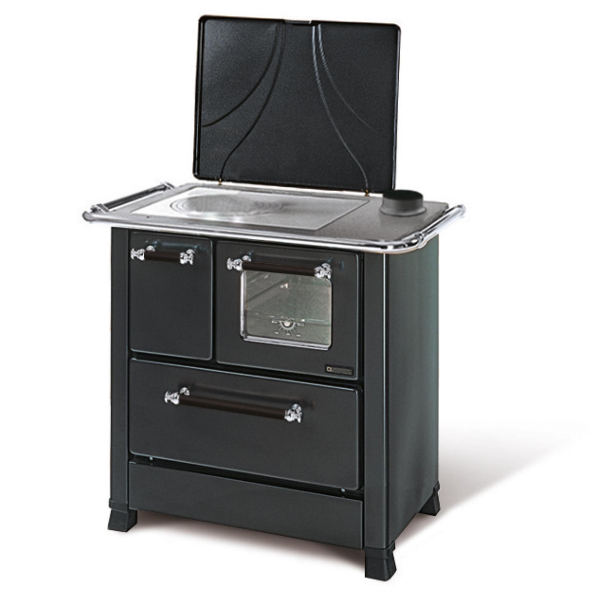 Porcelain steel external facing wood cooker with the traditional design. Fire-box entirely in cast iron. Enamelled oven with double glass door.