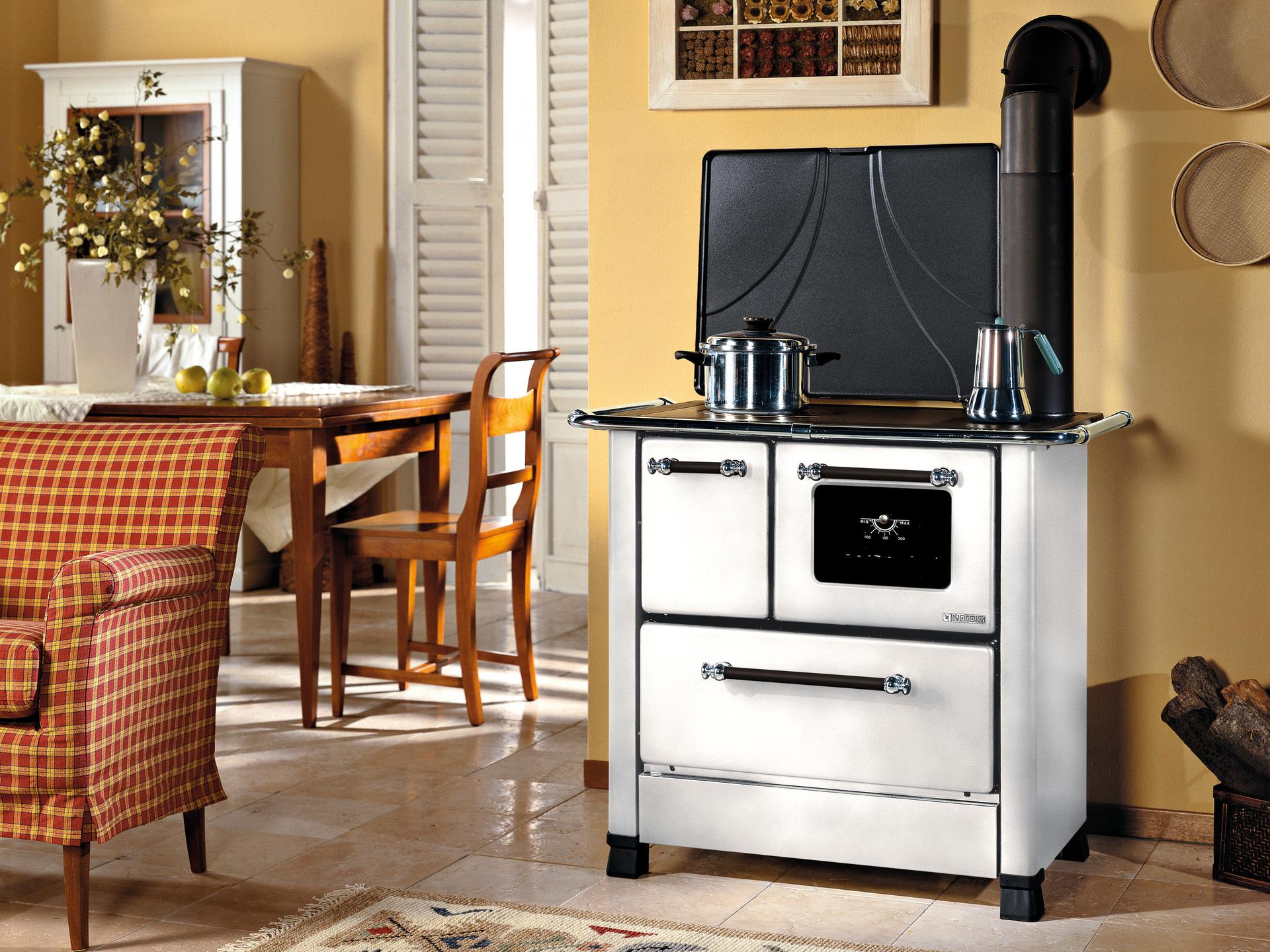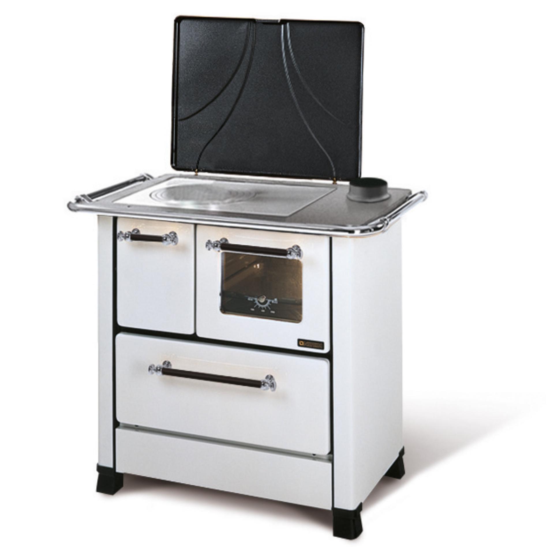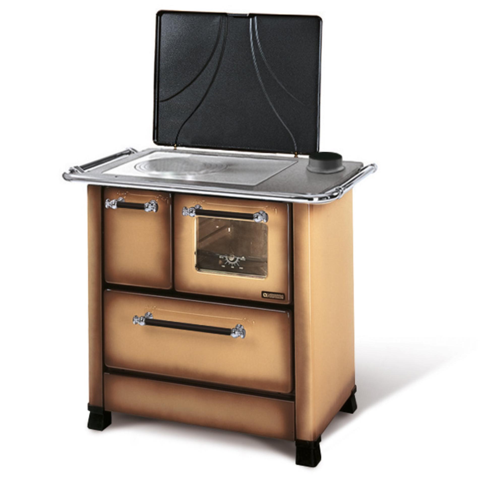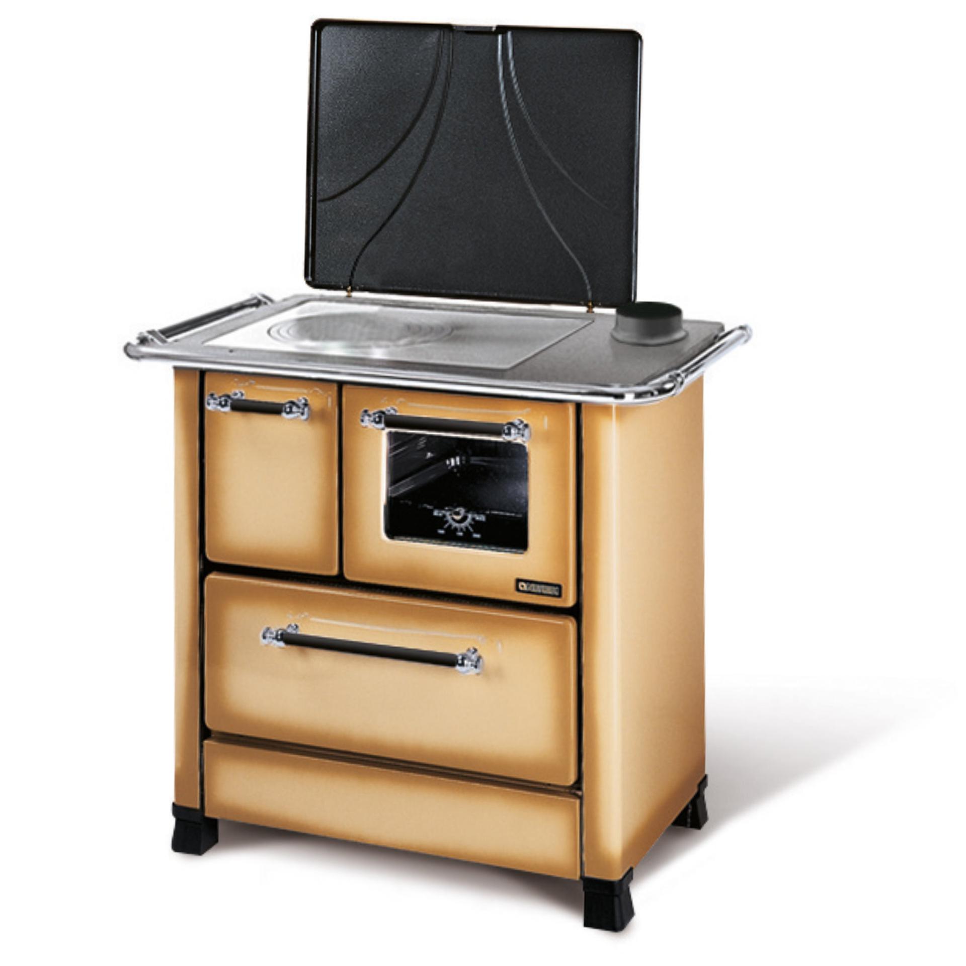 Porcelain steel external facing wood cooker with the traditional design. Fire-box entirely in cast iron. Enamelled oven with double glass door.