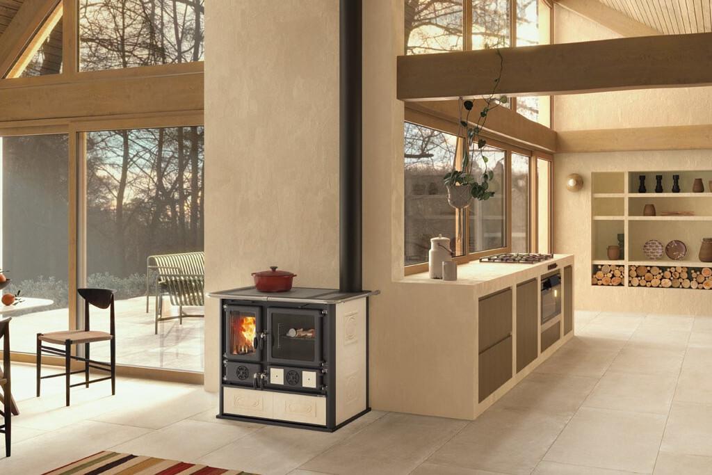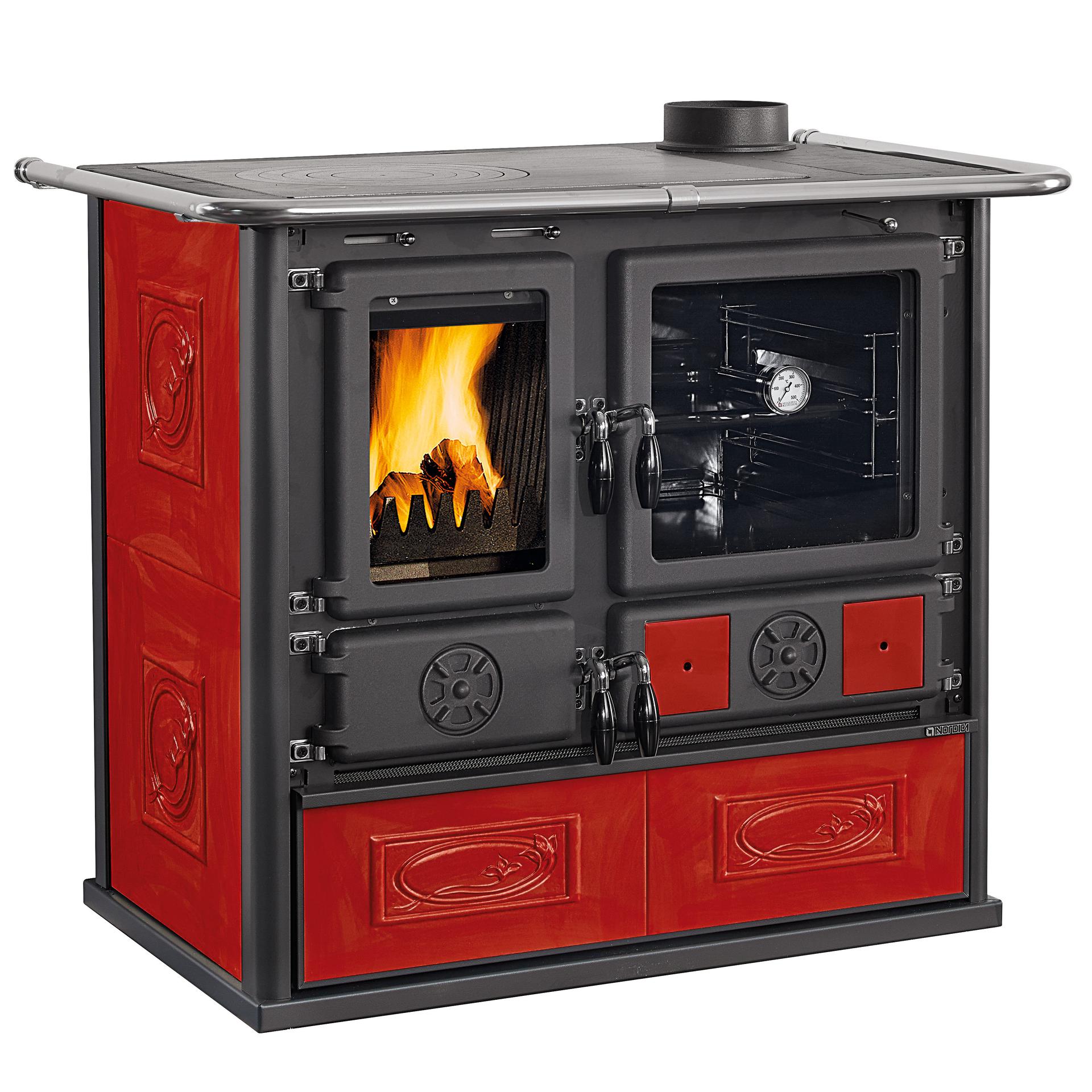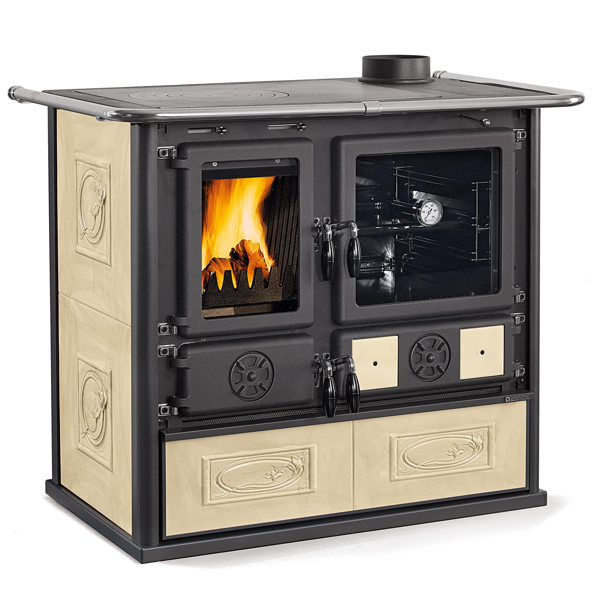 Traditional design wood-burning cooker with liberty majolica covering. The top plate and the rings are in polished cast iron. Doors and frames in enameled cast iron. A spacious enamelled steel oven for baking.