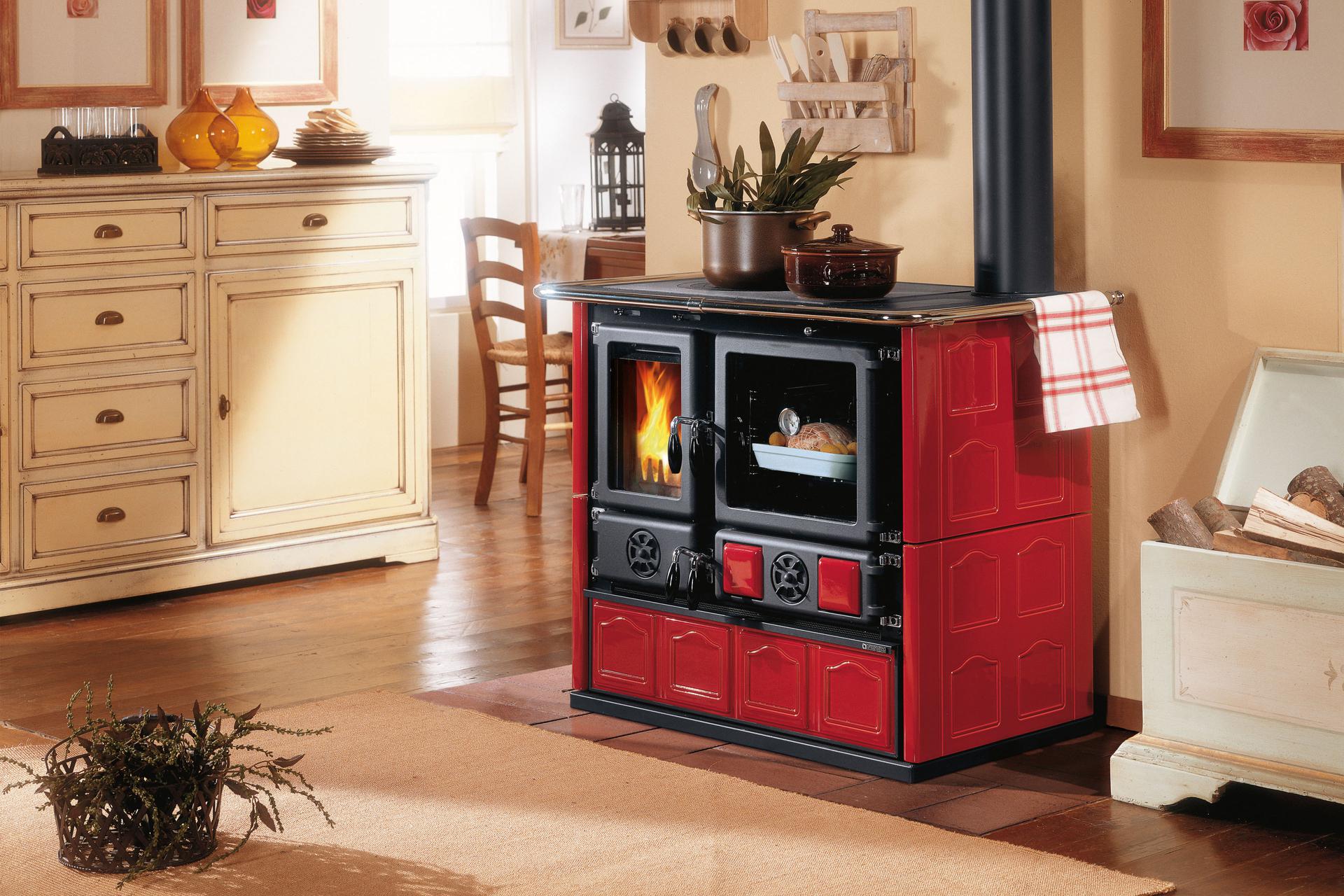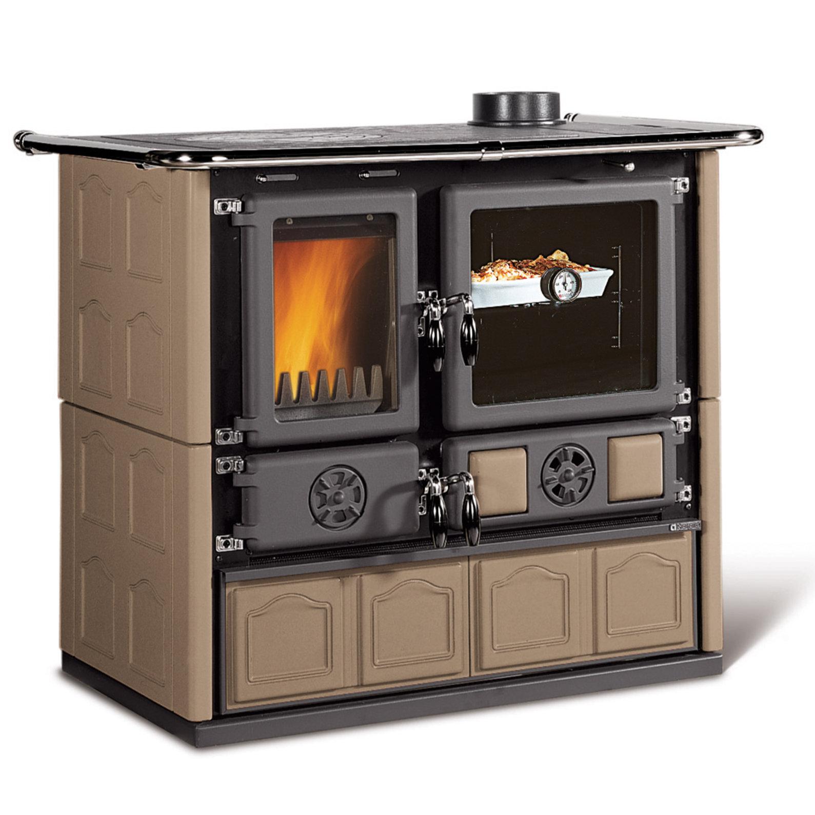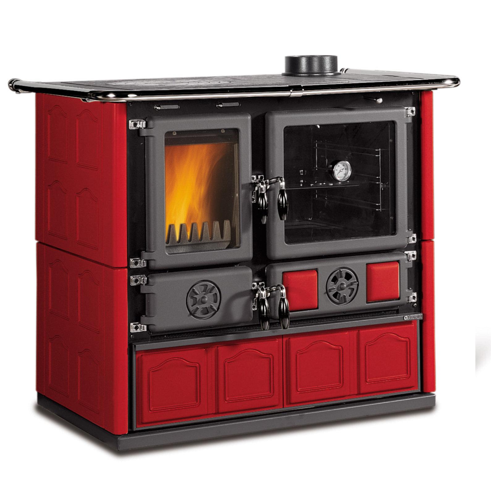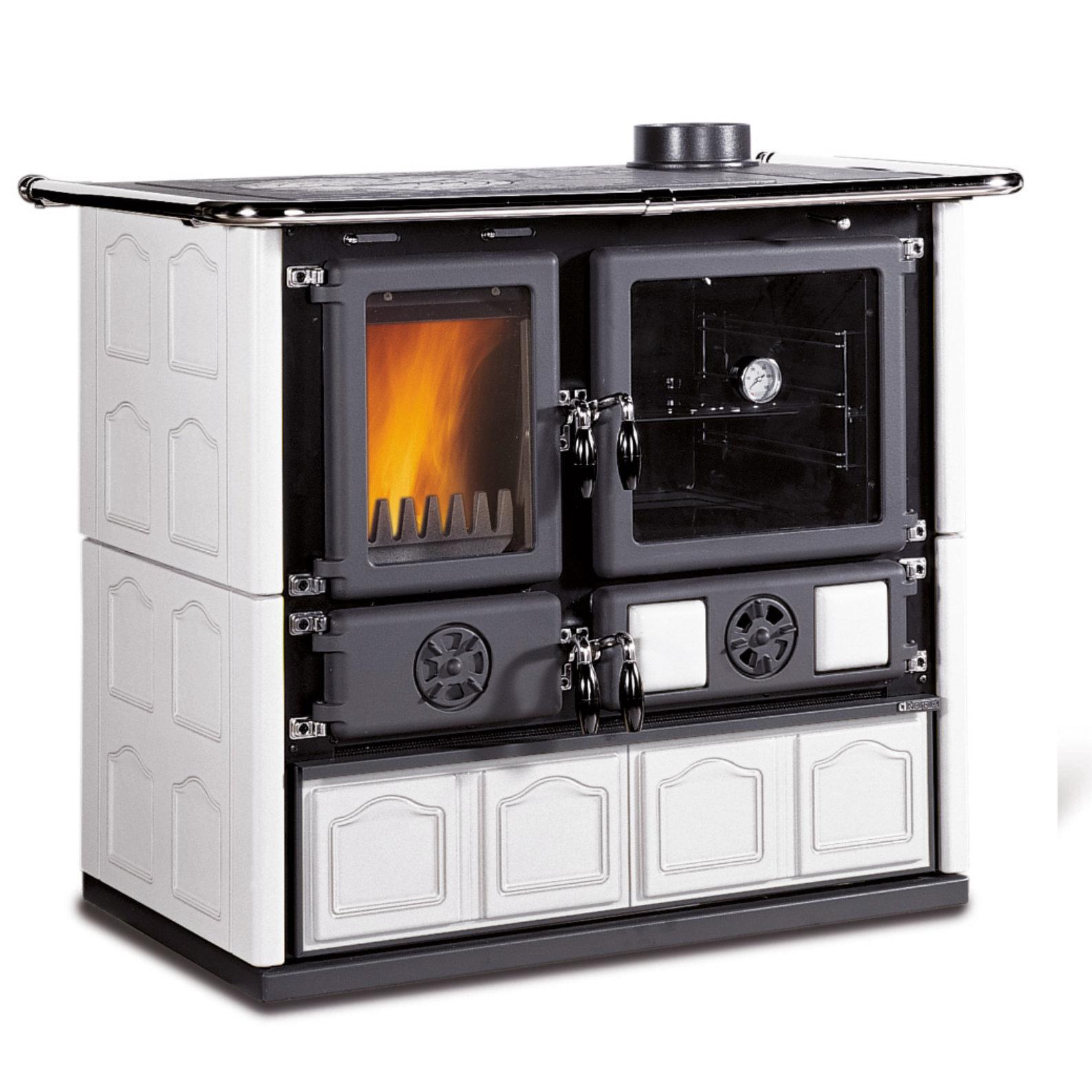 Wood-burning cooker with traditional design and majolica covering. The top plate and the rings are in polished cast iron. Doors and frames in enameled cast iron. A spacious enamelled steel oven for baking.