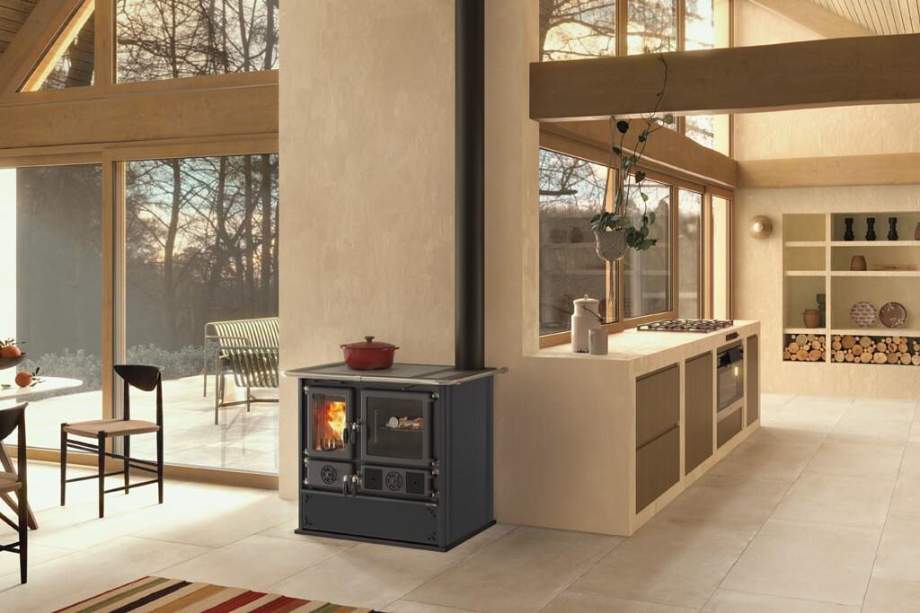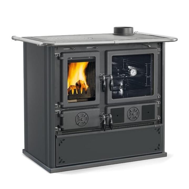 Traditional design wood-burning stove with painted steel casing. Top plate and rings in polished cast iron. Doors and frames in enameled cast iron. A spacious enamelled steel oven for baking.
