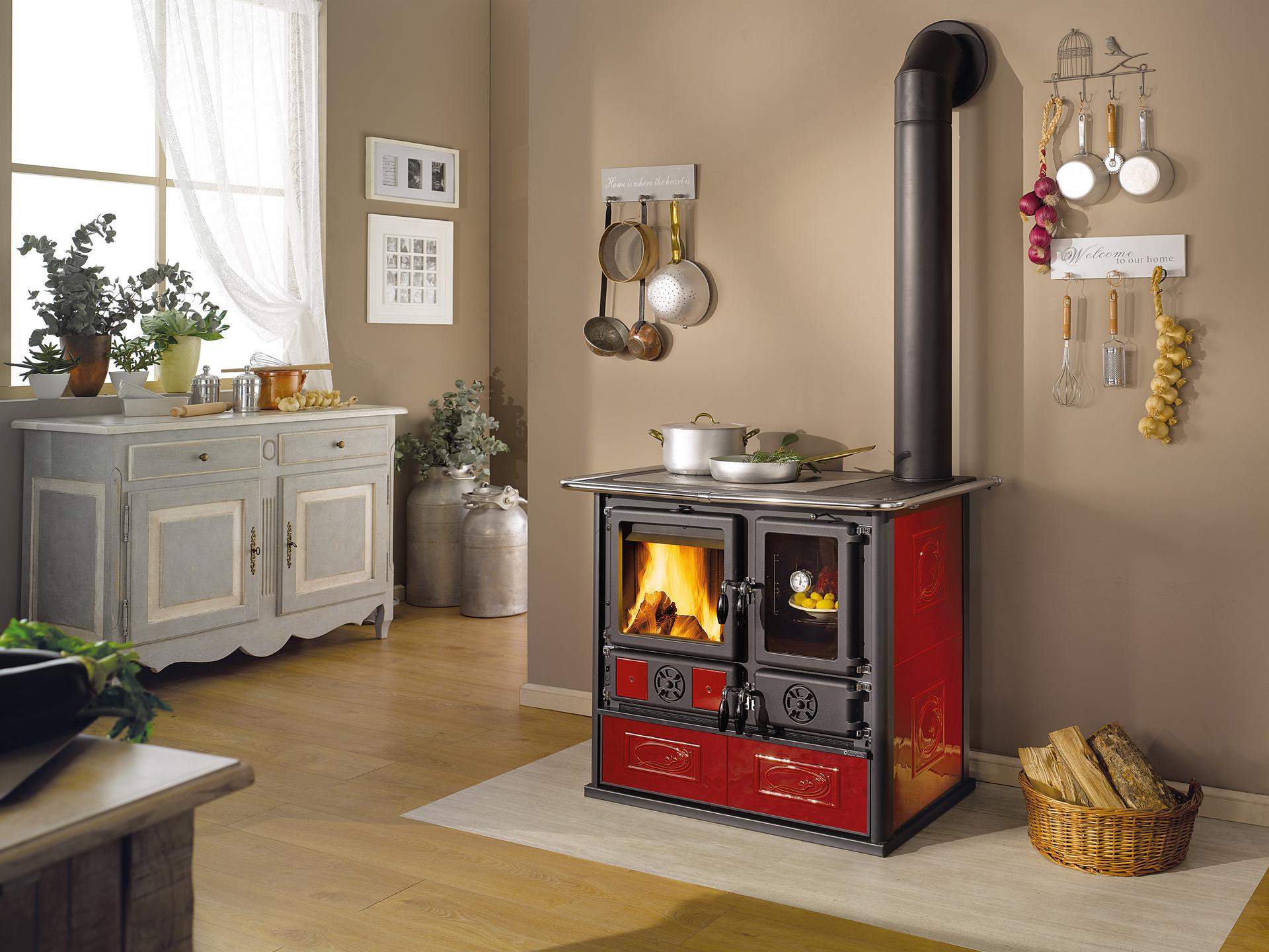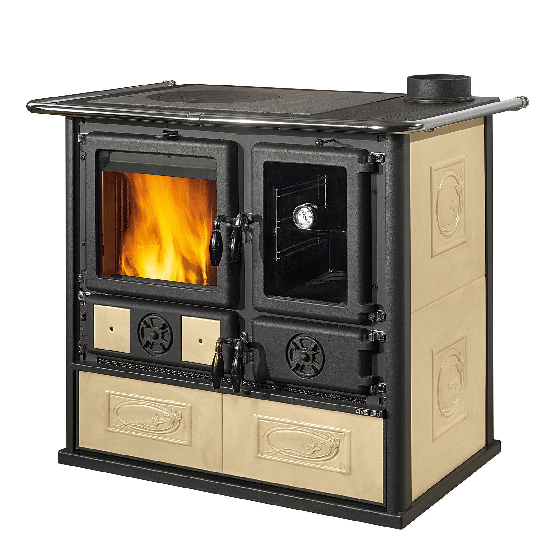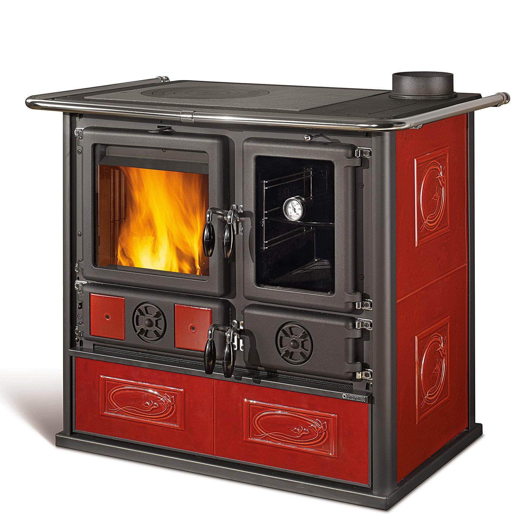 Wood burning cooker with wide fire vision. Top cooking plate and rings in polished cast-iron. Internal facing of the hearth in cast iron and refractory. Extractable wood drawer. Fire door in cast iron with double glass. As standard a kit of 2 black tiles 10x10 cm.