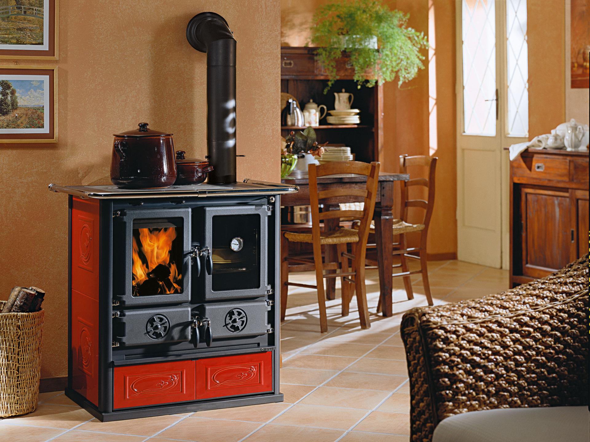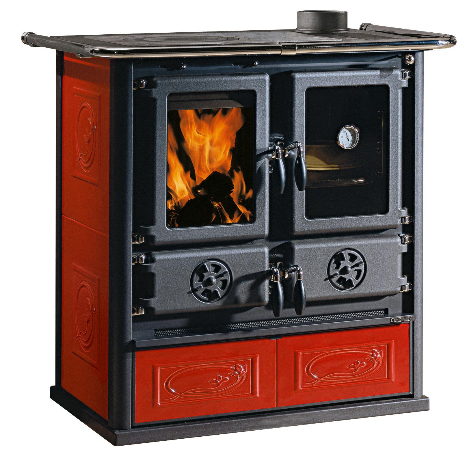 Wood burning cooker with external facing in majolica or in natural stone. Top cooking plate and rings in polished cast-iron. Internal facing of the hearth in cast iron and refractory. Extractable wood drawer. Fire door in cast iron. Ceramic glass.