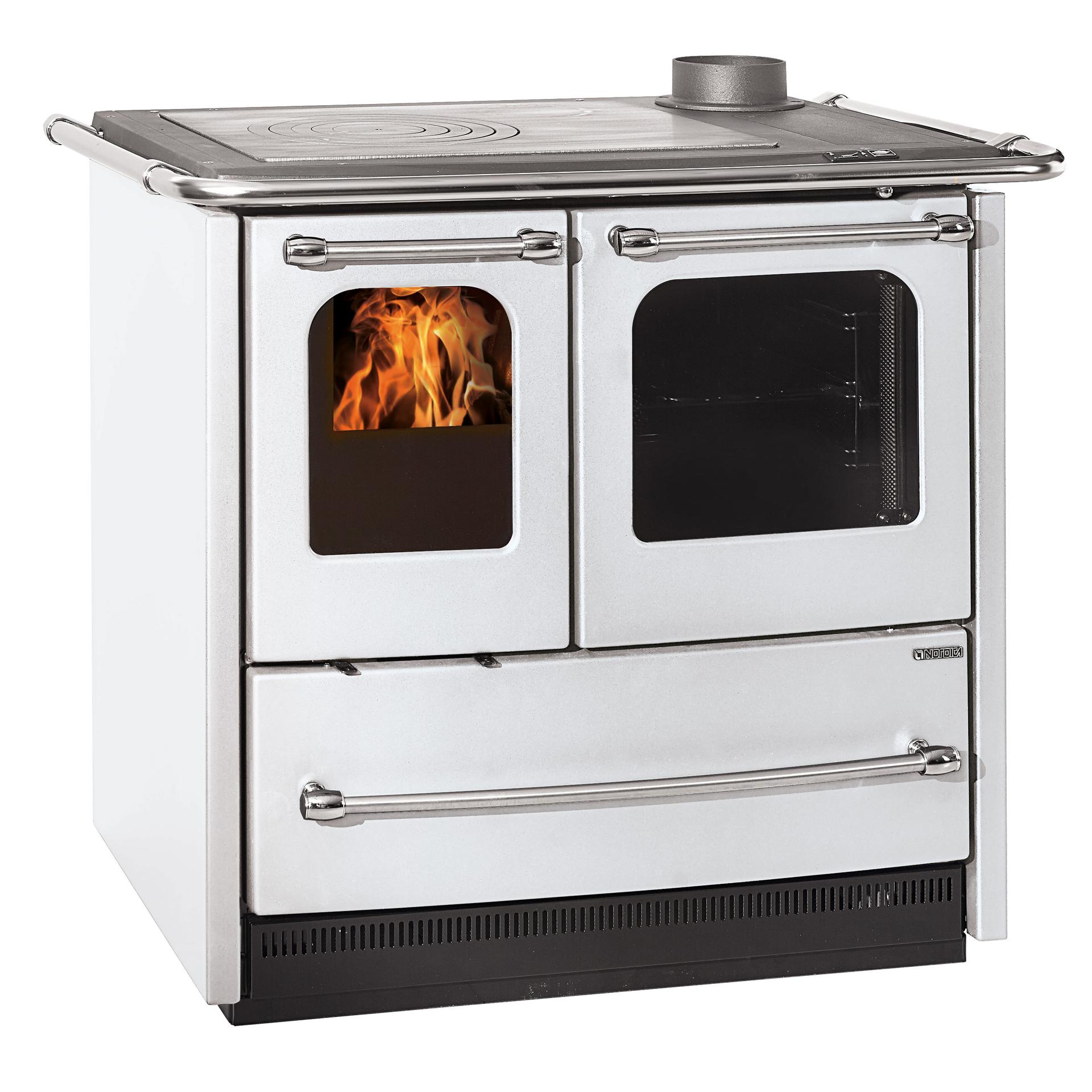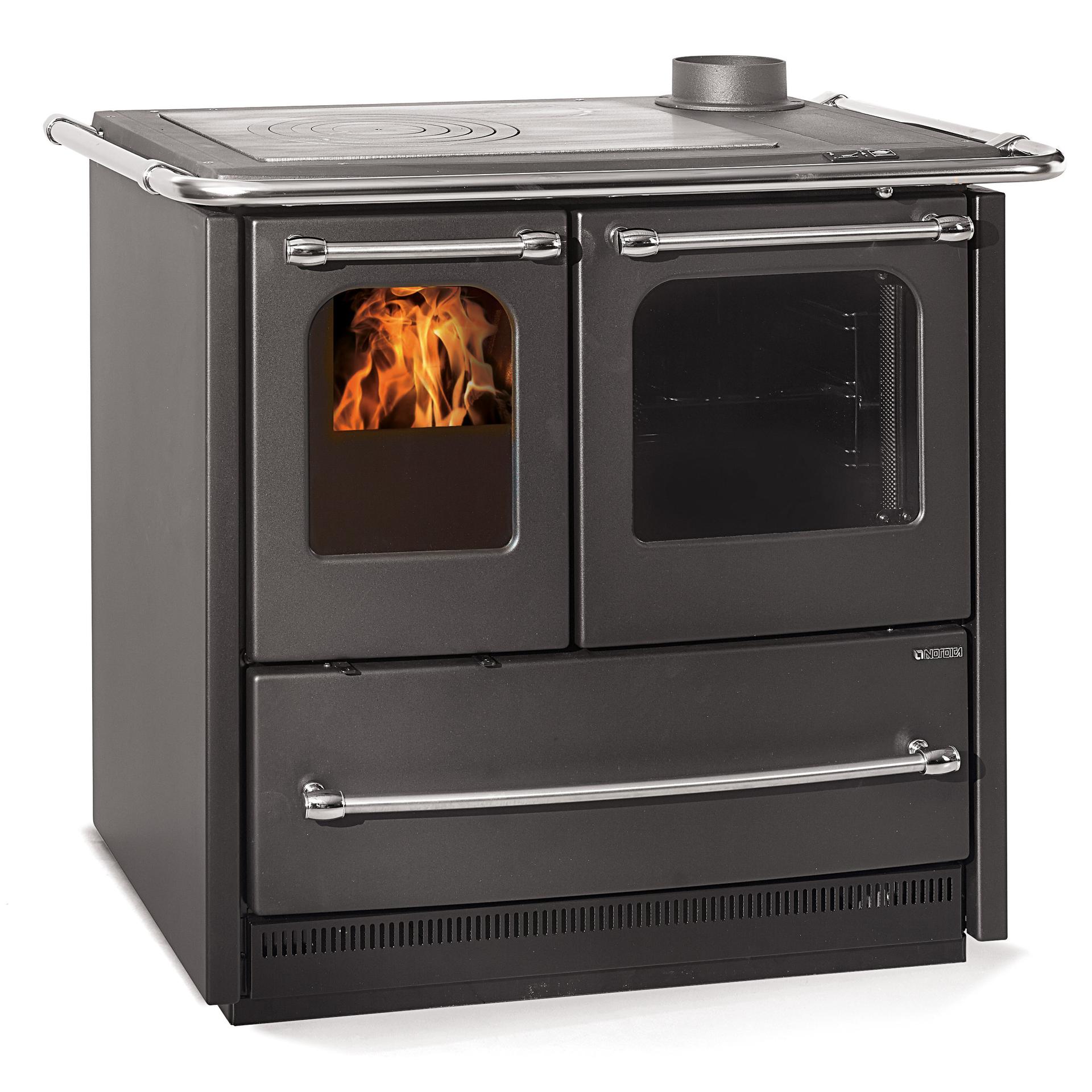 Traditional wood cooker with feet for easy cleaning. Enameled cast iron facade and frame. Internal facing of the hearth in cast iron with the extractable ash drawer. Fire door in cast iron with double glass, where the internal glass is ceramic.