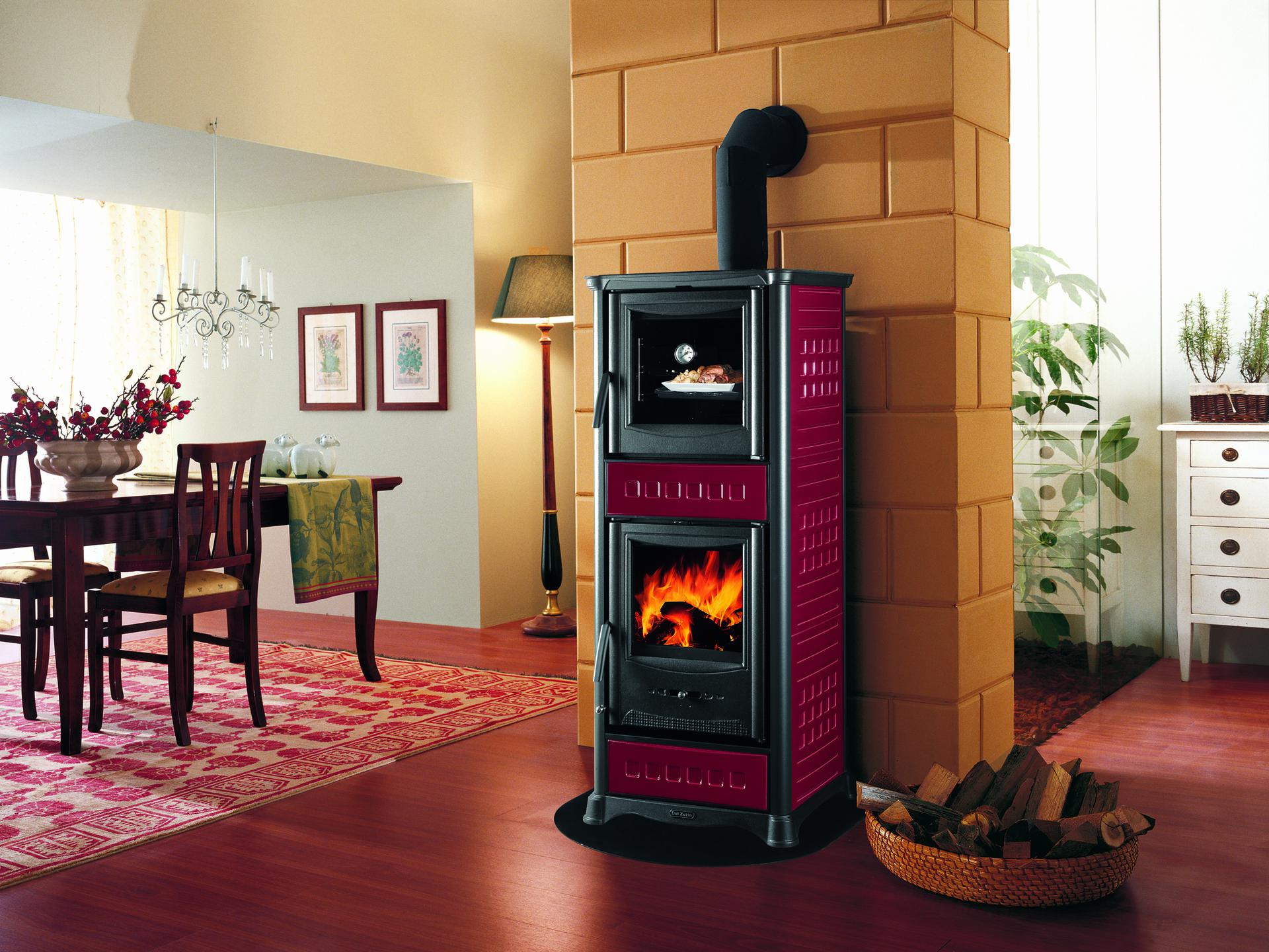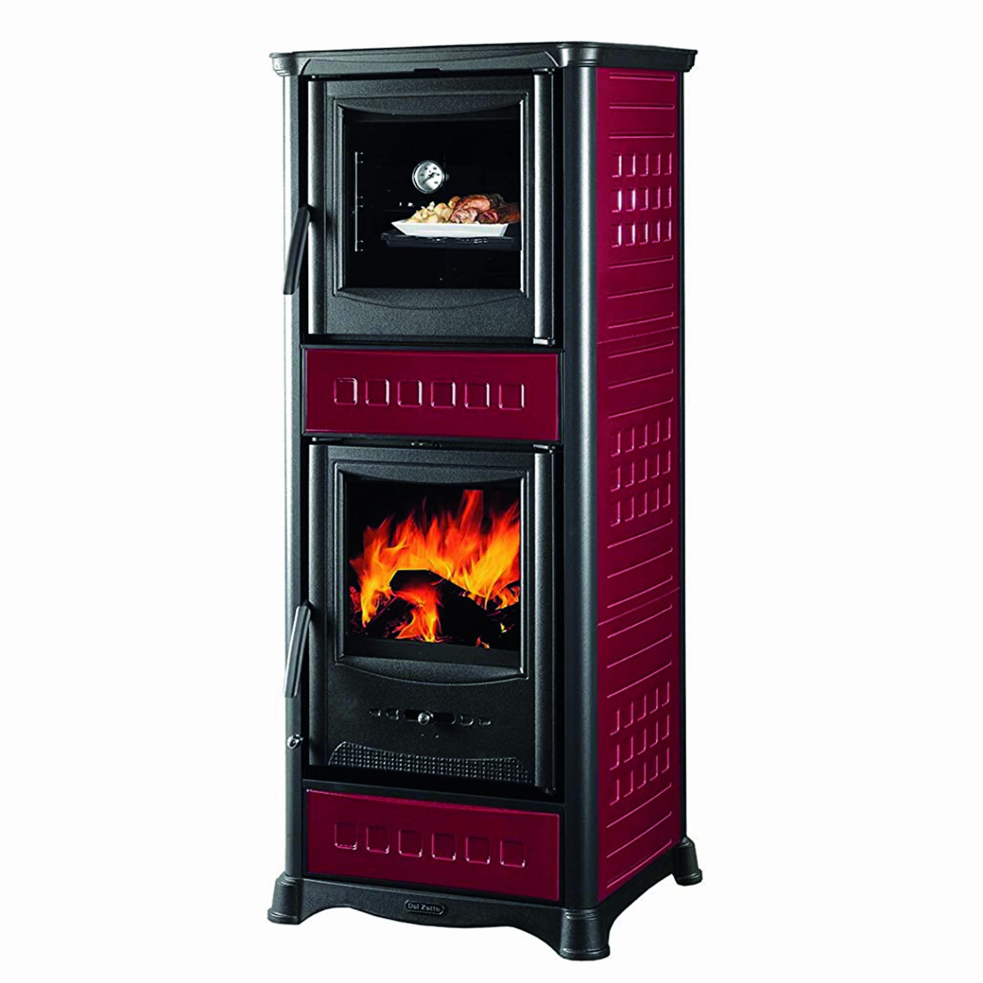 Wood burning stove with oven majolica facing. Primary and secondary air and double combustion. Big wood drawer. Top, base and doors made of enameled cast-iron.