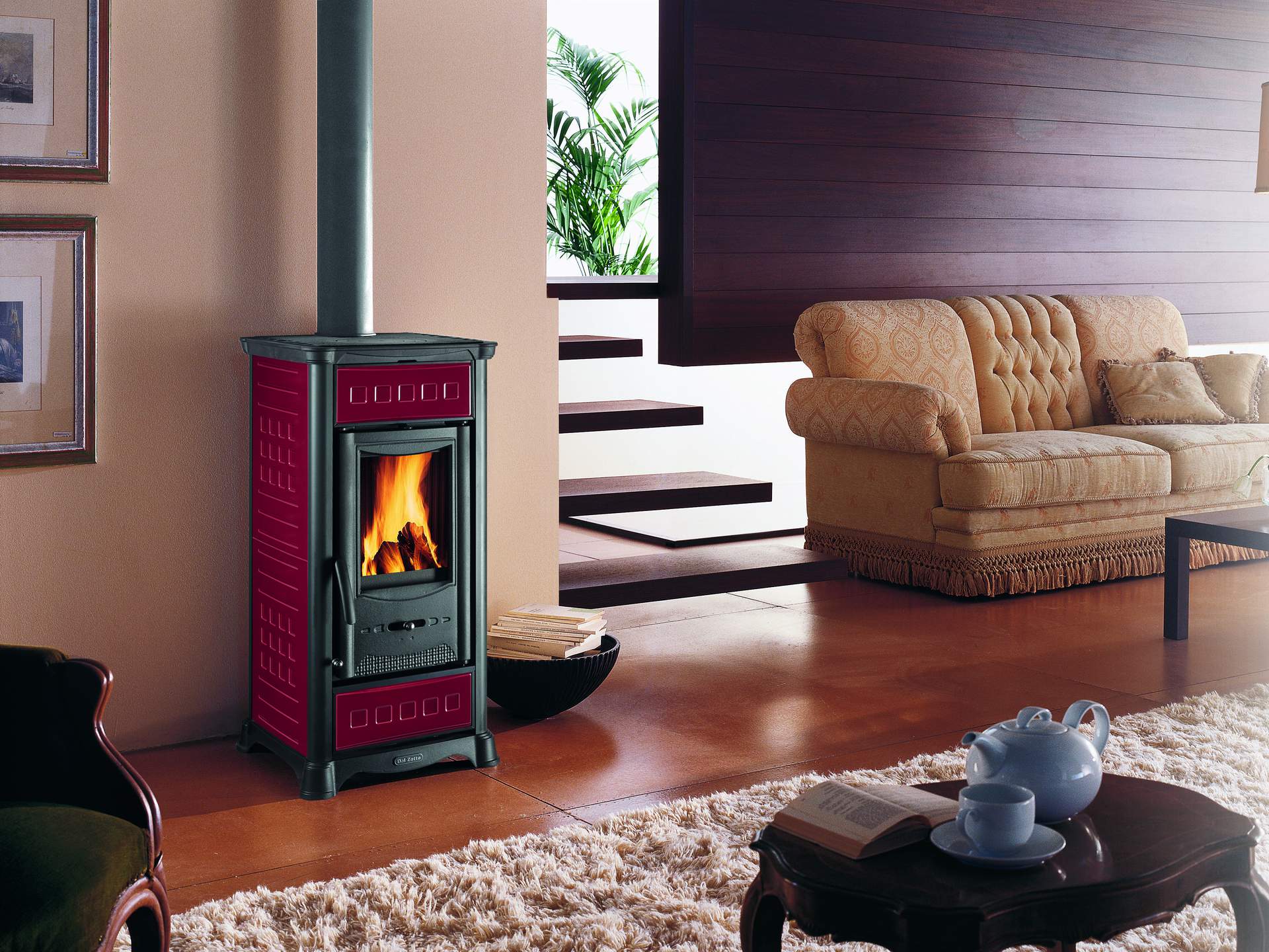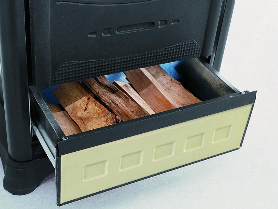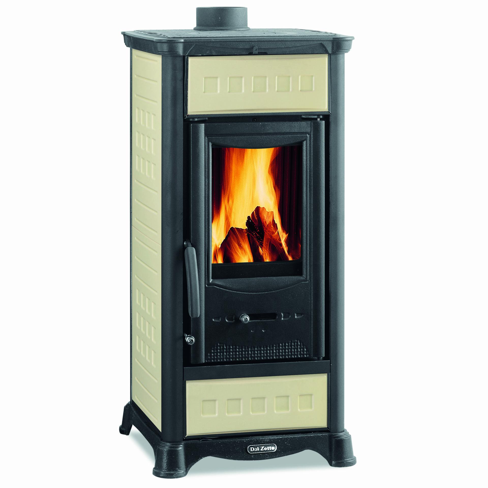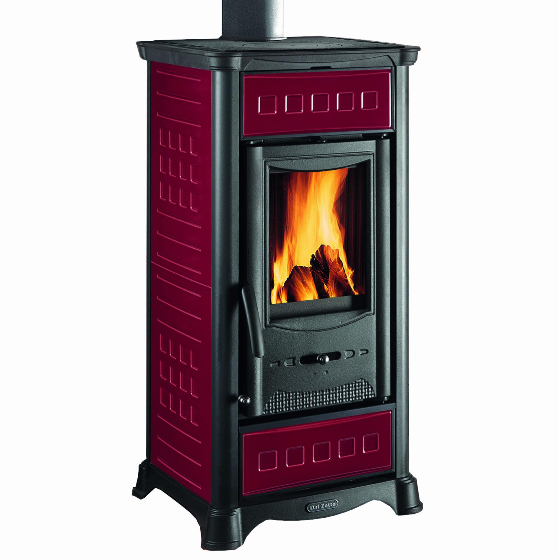 Wood burning stove with majolica facing and enameled oven. Top, base and doors made of enameled cast-iron. Primary and secondary air. Double combustion. Big wood drawer.