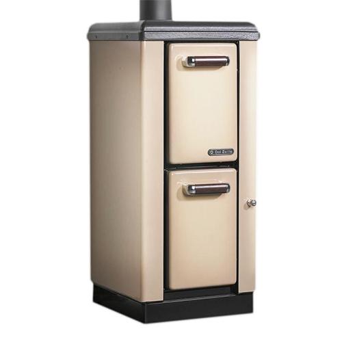 Wood burning stove with porcelainized enameled steel facing. Wooden handles, chromed finish and raf enameled cast-iron top.