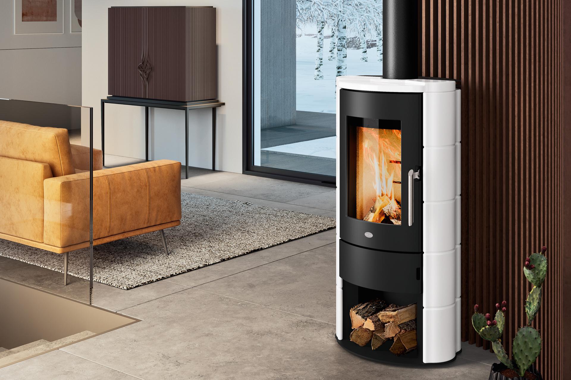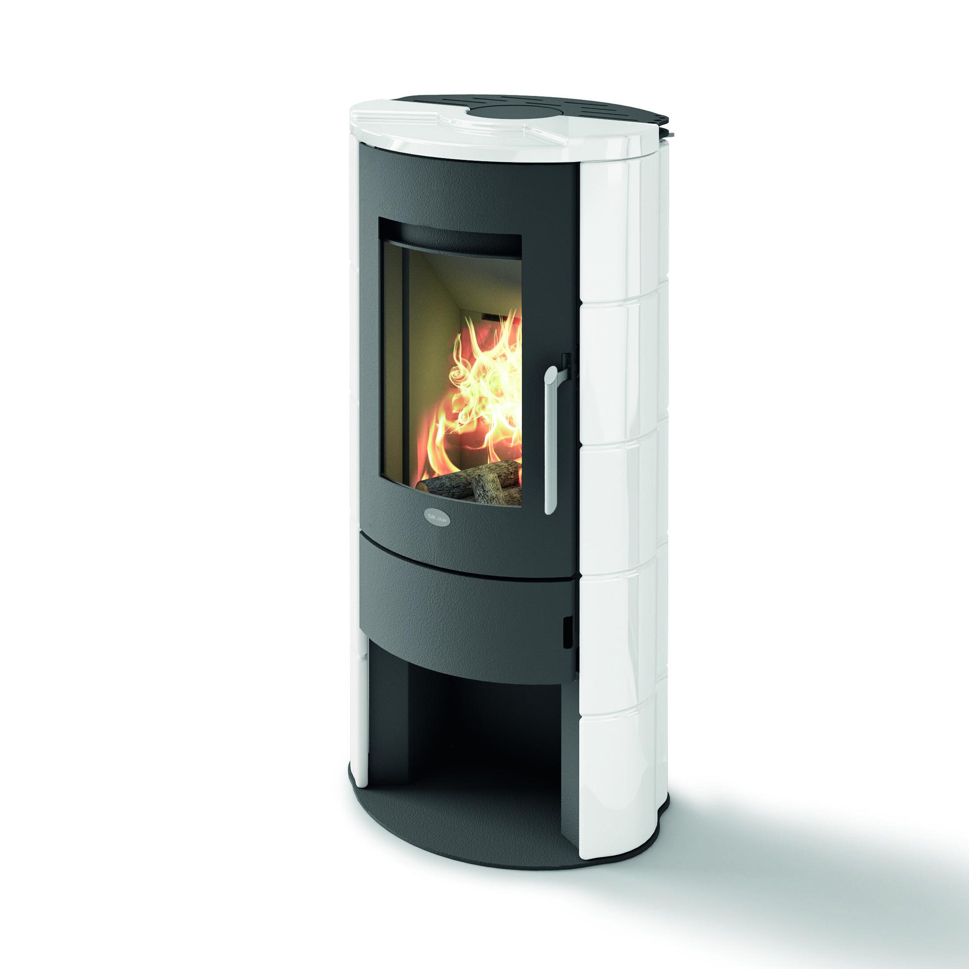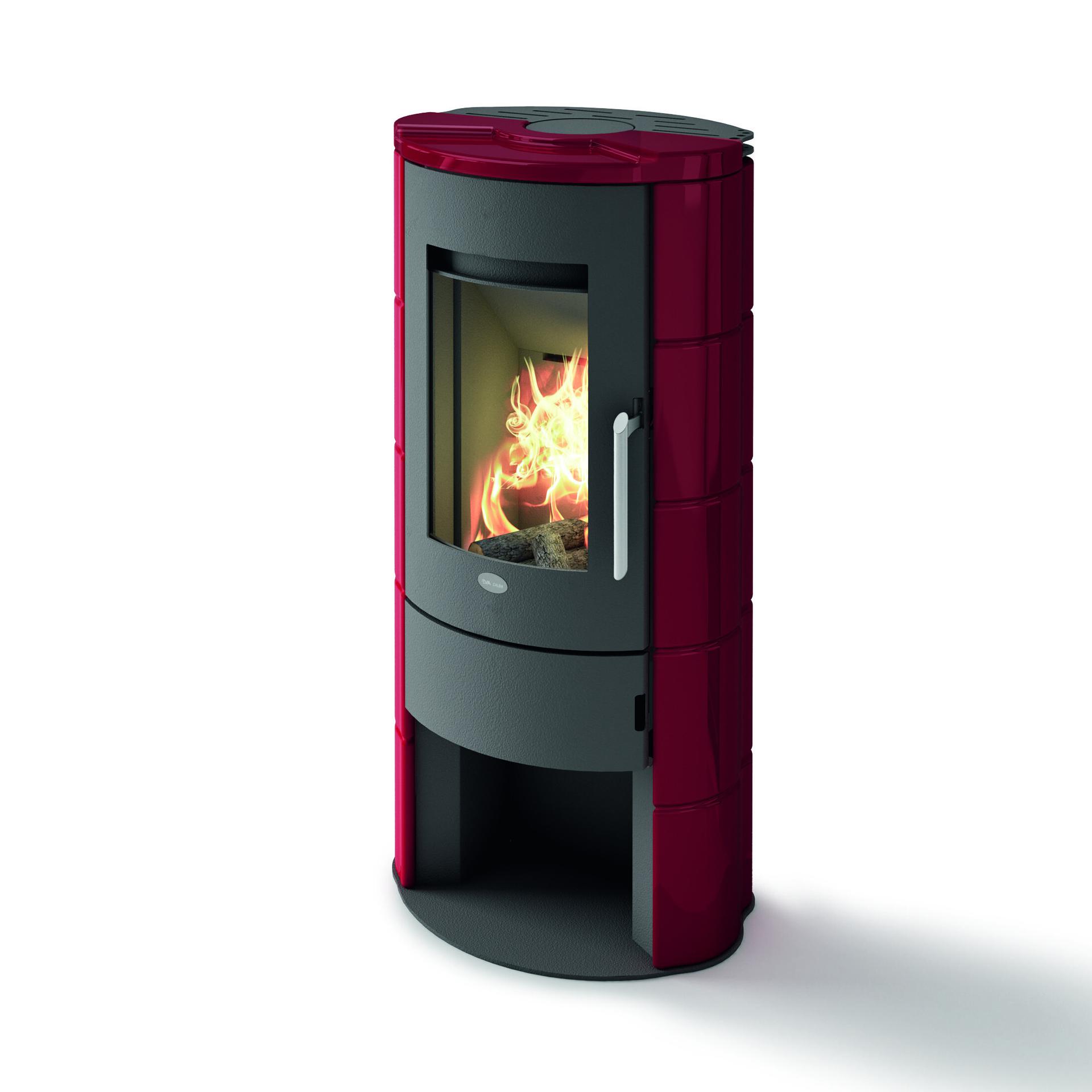 Wood-burning stove with curved door, 6 mm thick top and majolica facing. Vermiculite combustion chamber and air supply control. Removable ash drawer for ash collection in a separate compartment. Top and rear flue connections.