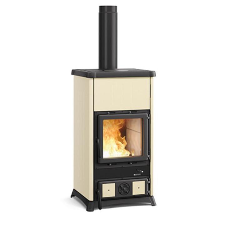 Wood-burning stove with heat recovery system and painted steel covering. Enameled cast iron doors, top, bottom and frame. Internal lining of the stove in cast iron and Nordiker. EPS heat recovery system with enameled pipe diameter 150 mm and height 500 mm with internal turbulator.