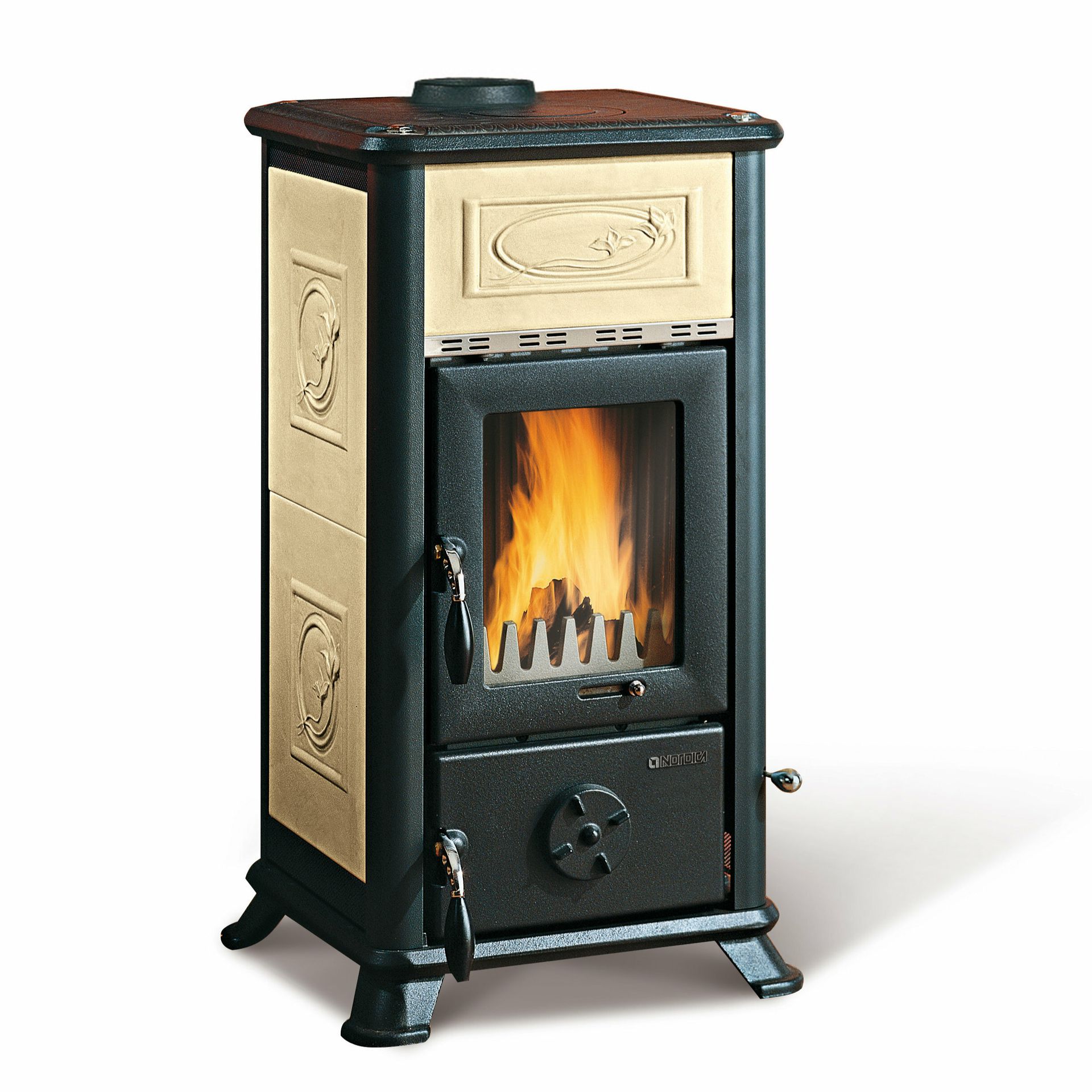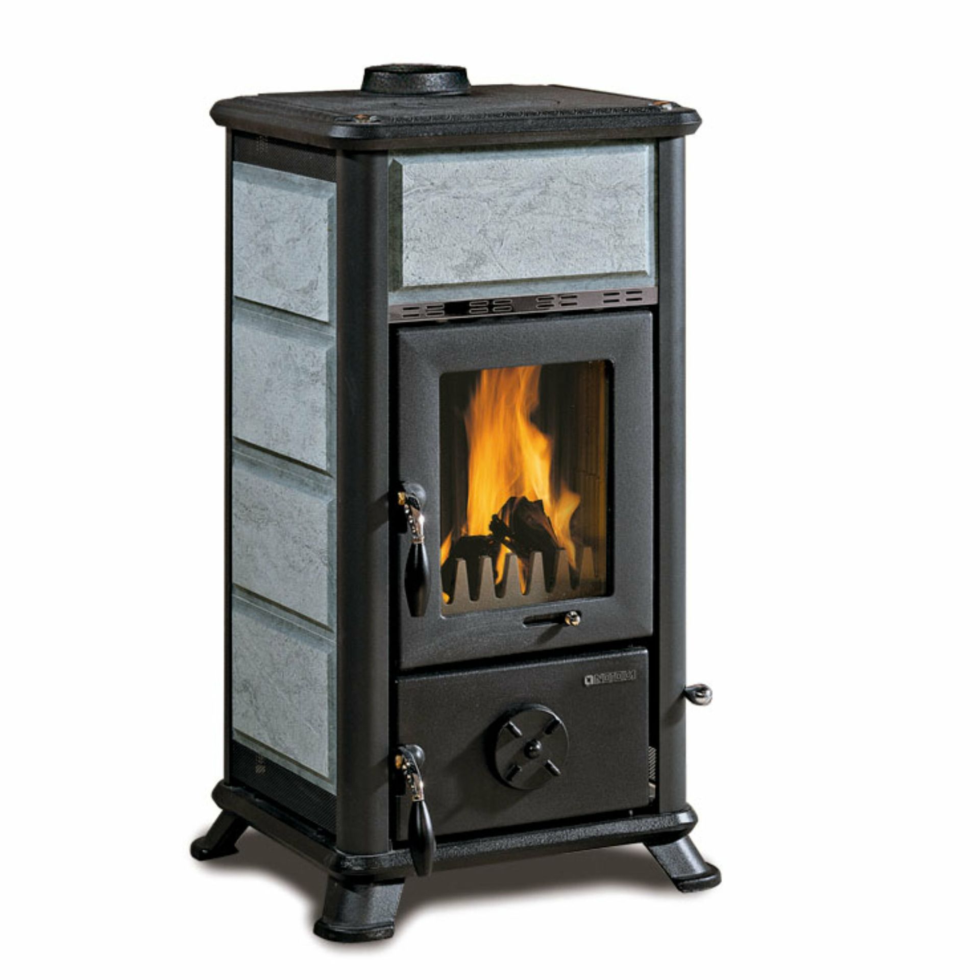 Wood burning stove with external facing in majolica or in natural stone. Enameled cast iron door and top. Internal facing of the hearth in cast iron.